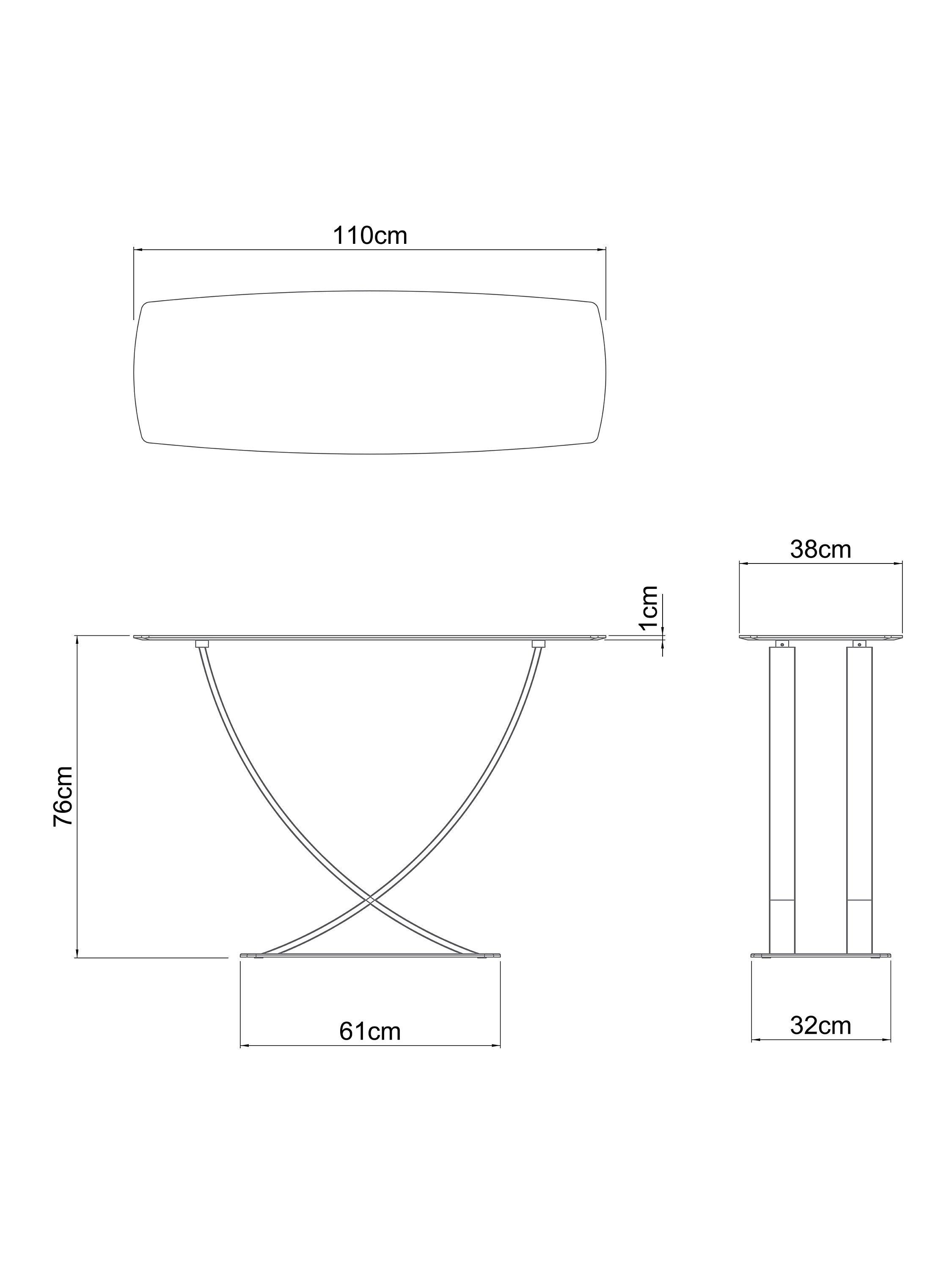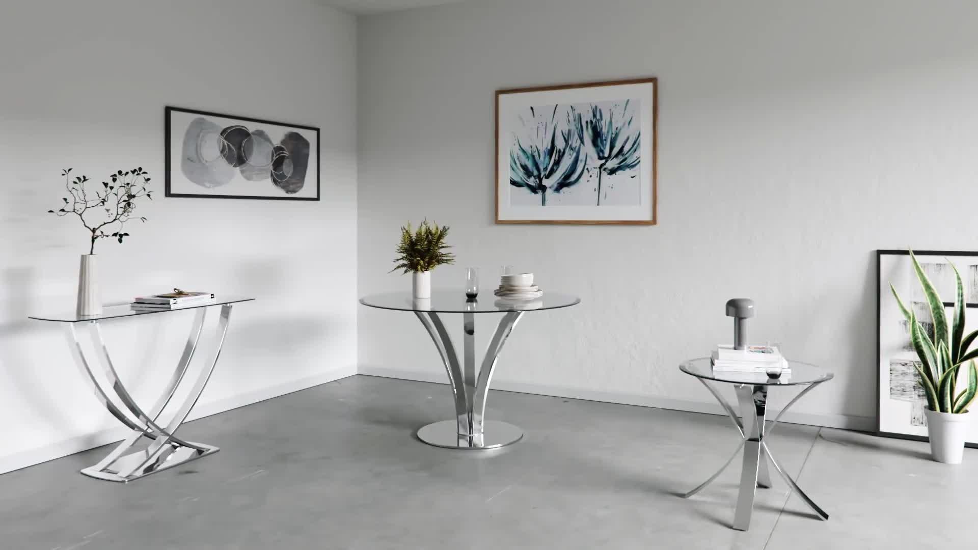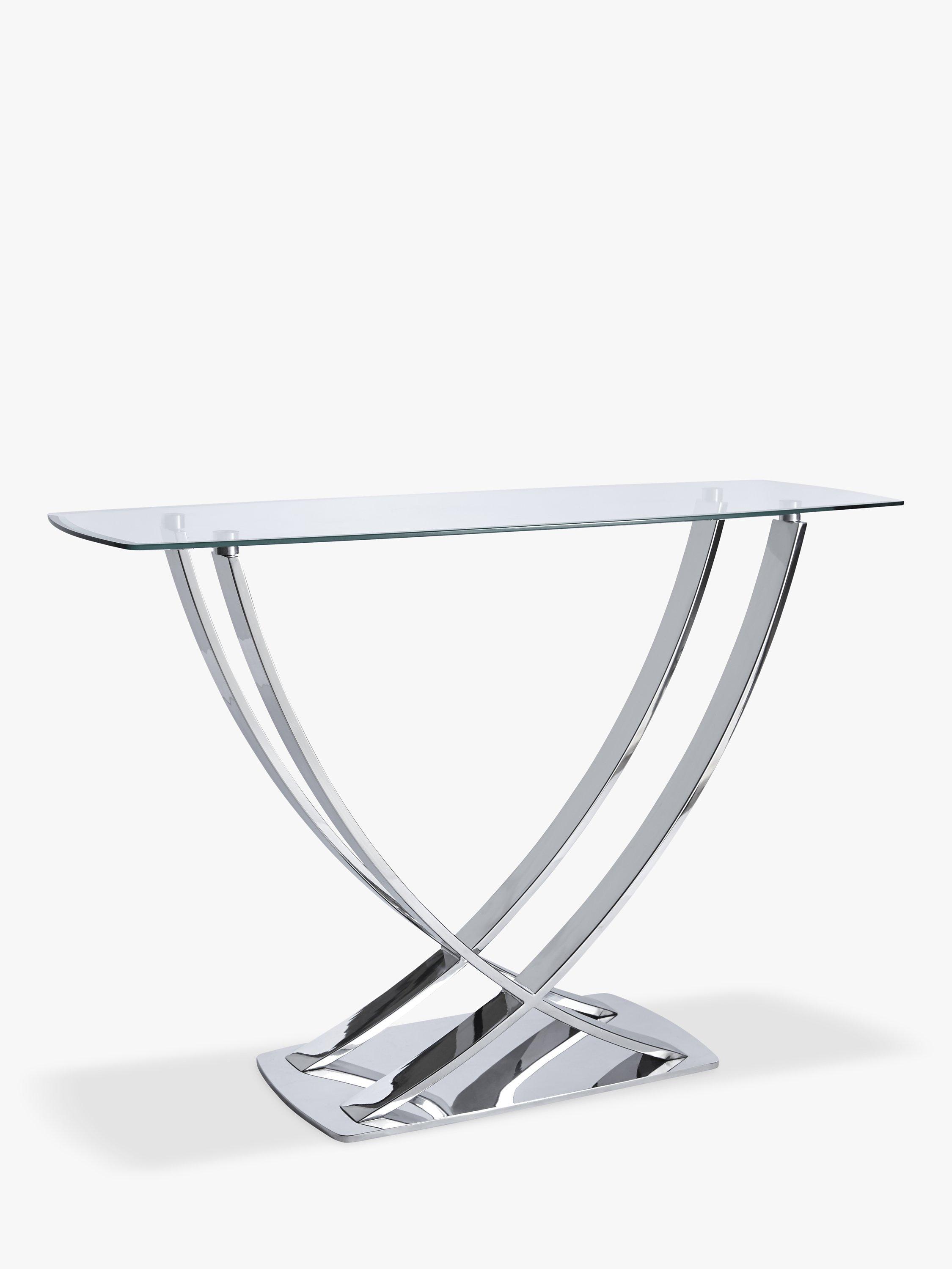 Part of our elegant Hotel theme, the Moritz console table features a tempered glass top with bevelled edges sitting atop a polished stainless steel base. This graceful, lustrous table makes the a perfect standalone table, or a gorgeous complement to other pieces from our Moritz collection