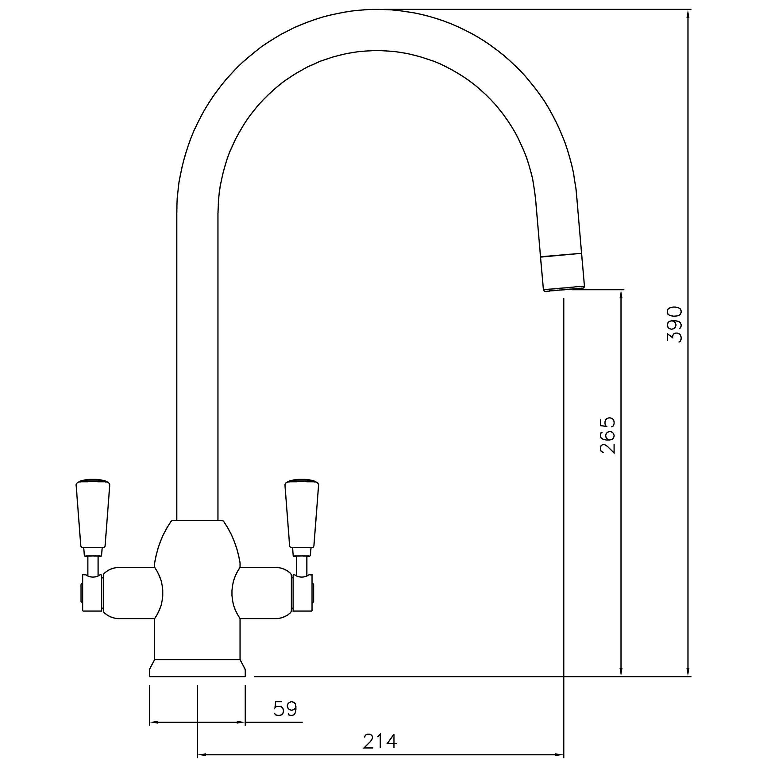 - H390 x W214 x D59mm, Spout reach: 214mm, Height to end of spout: 265mm