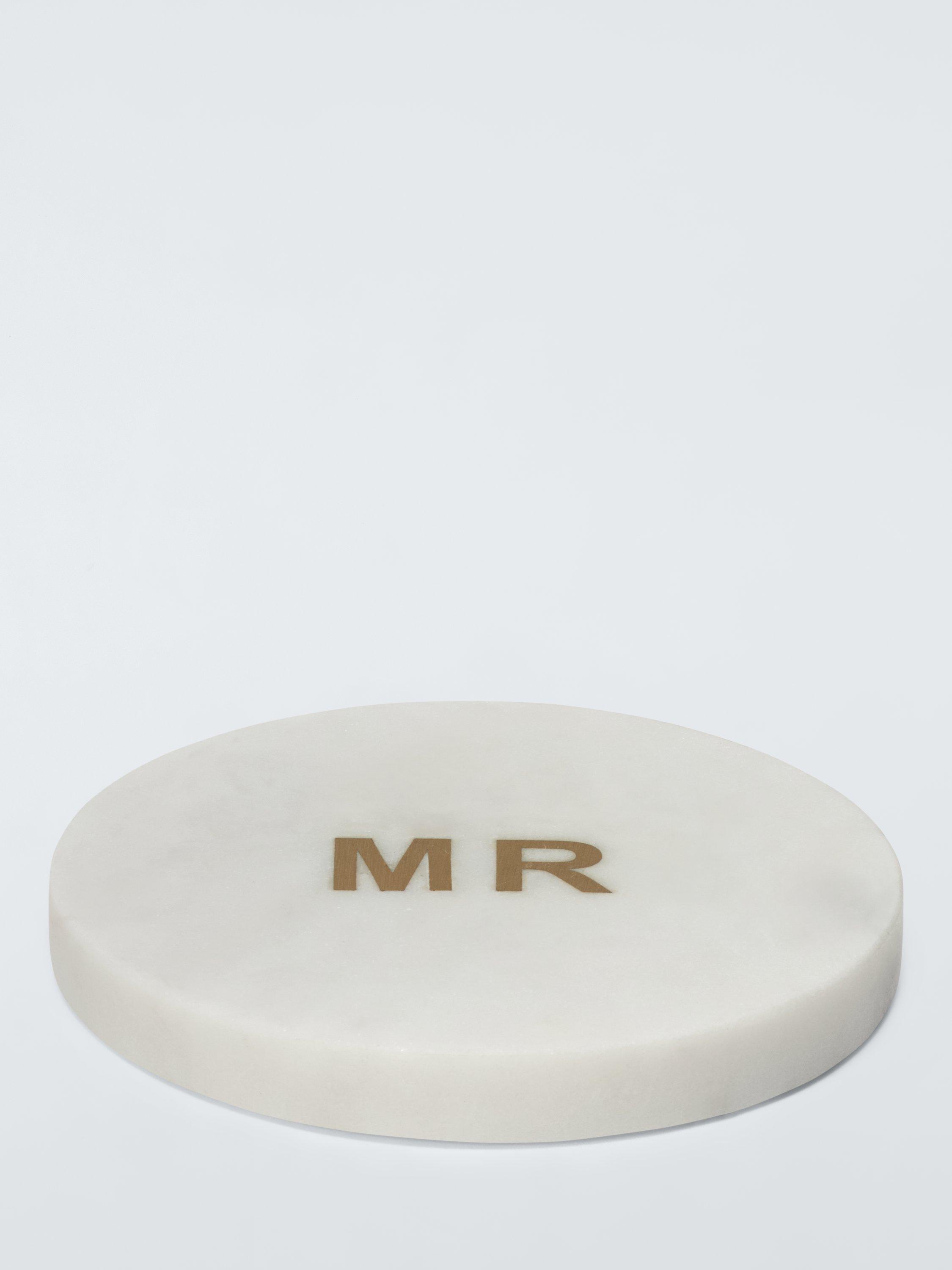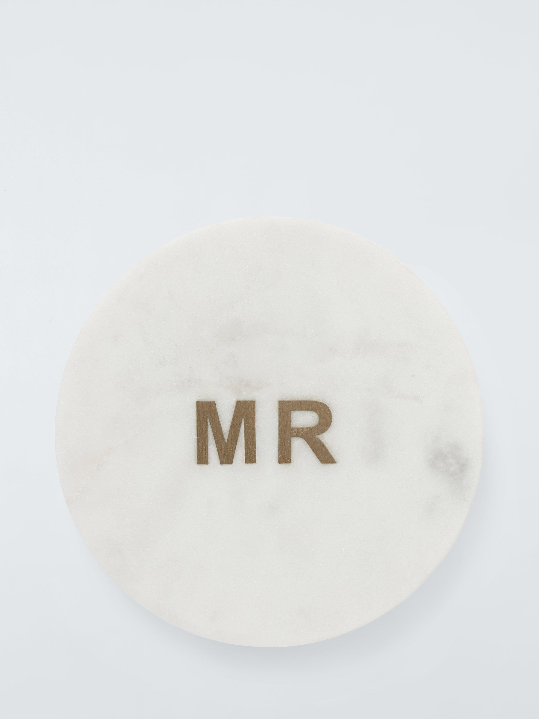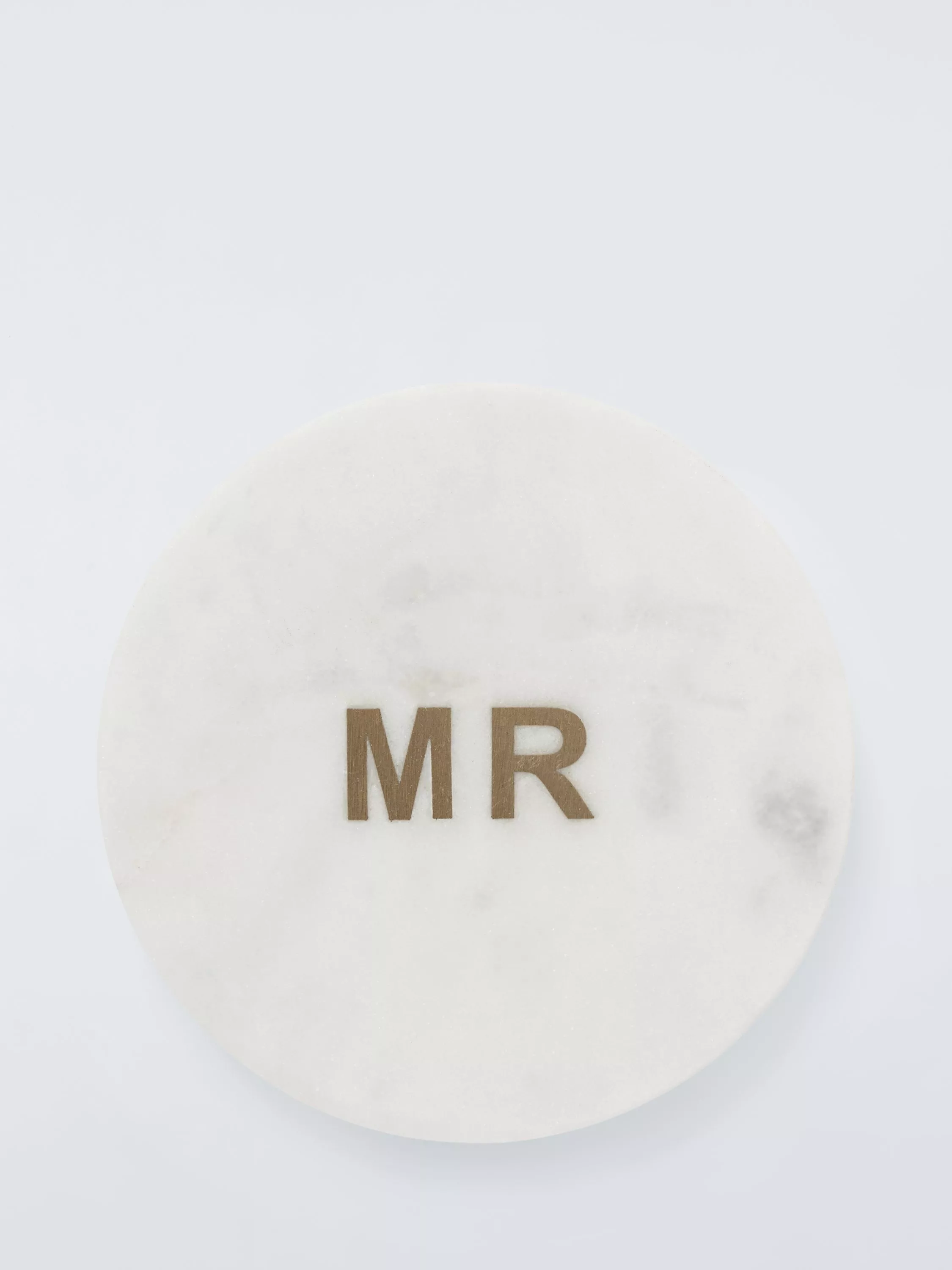 Round coaster handmade using traditional techniques and inlaid with 'Mr' in brass. The natural patterns and variations of the marble make each coaster unique. A wonderful Valentine's Day, anniversary or wedding gift when paired with the matching 'Mrs' coaster.