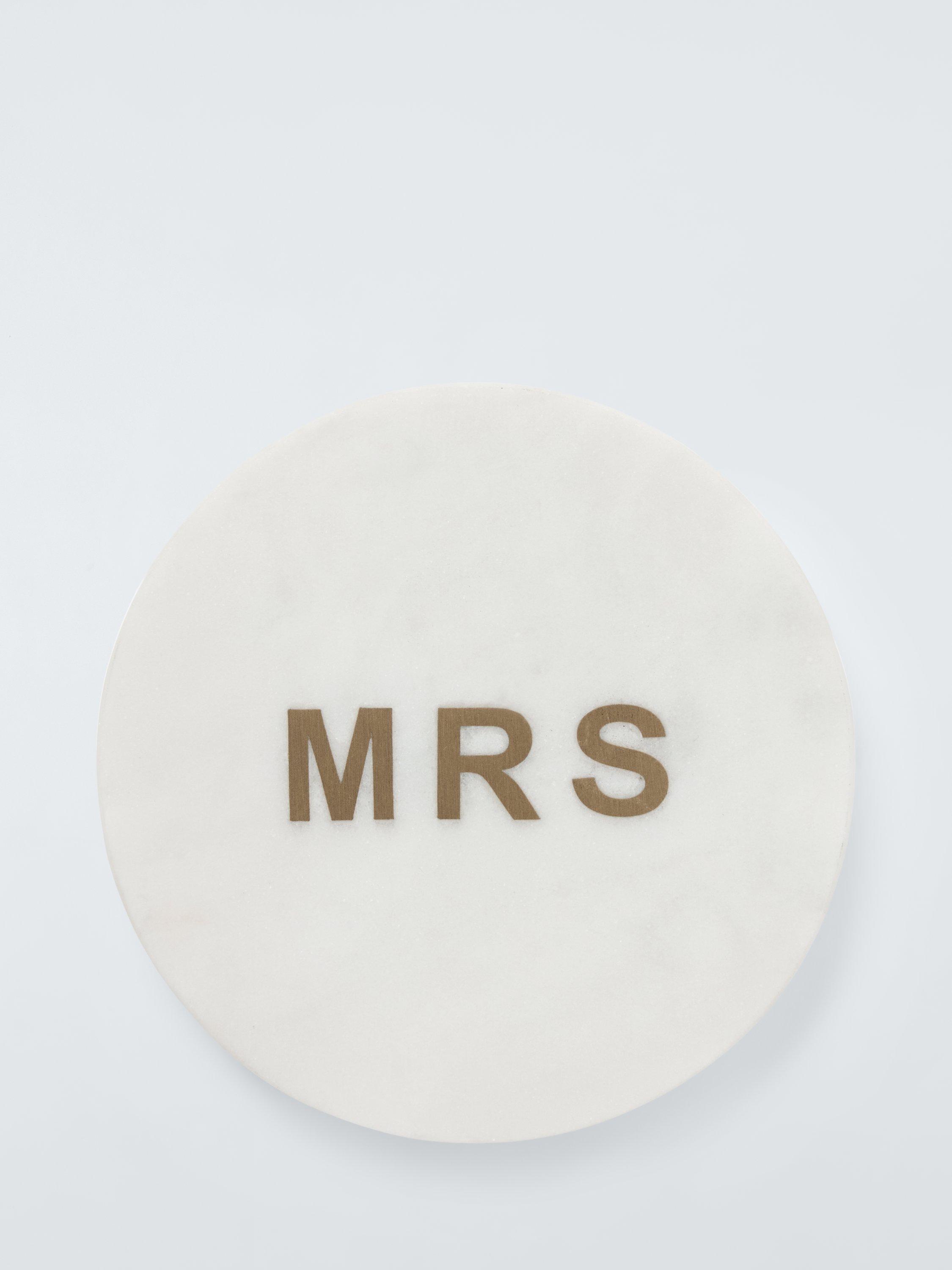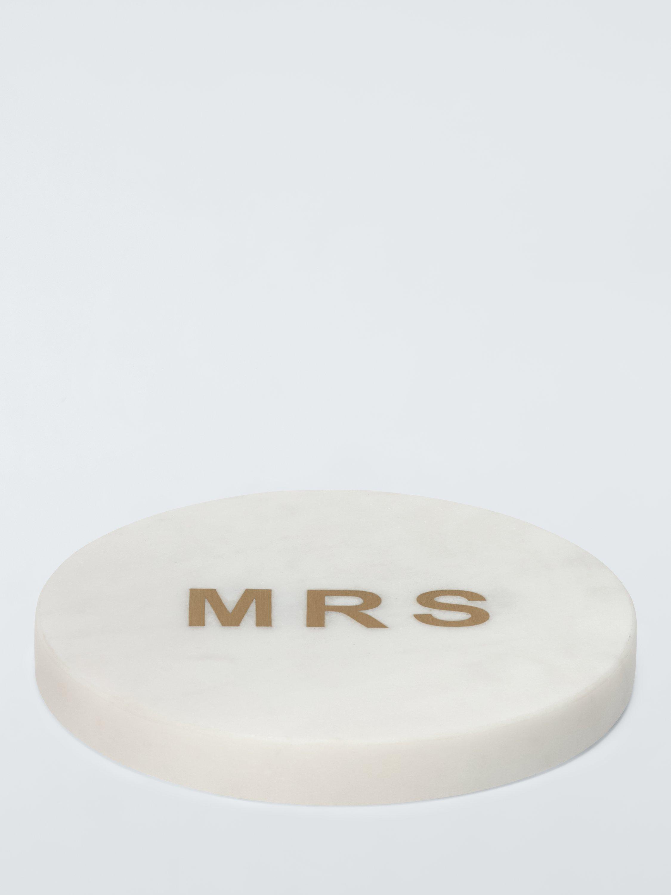 Round coaster handmade using traditional techniques and inlaid with 'Mrs' in brass. The natural patterns and variations of the marble make each coaster unique. A wonderful Valentine's Day, anniversary or wedding gift when paired with the matching 'Mr' coaster.