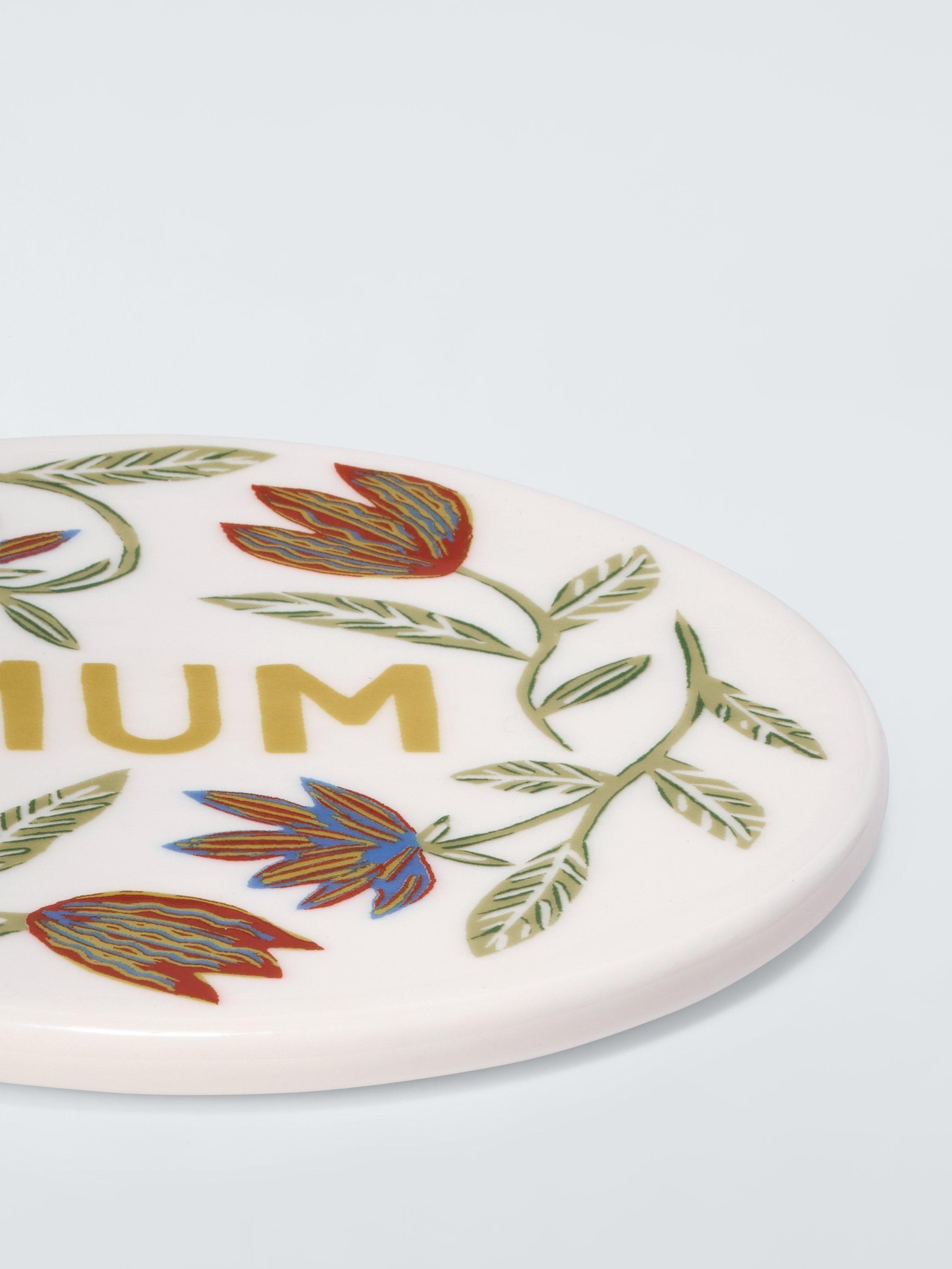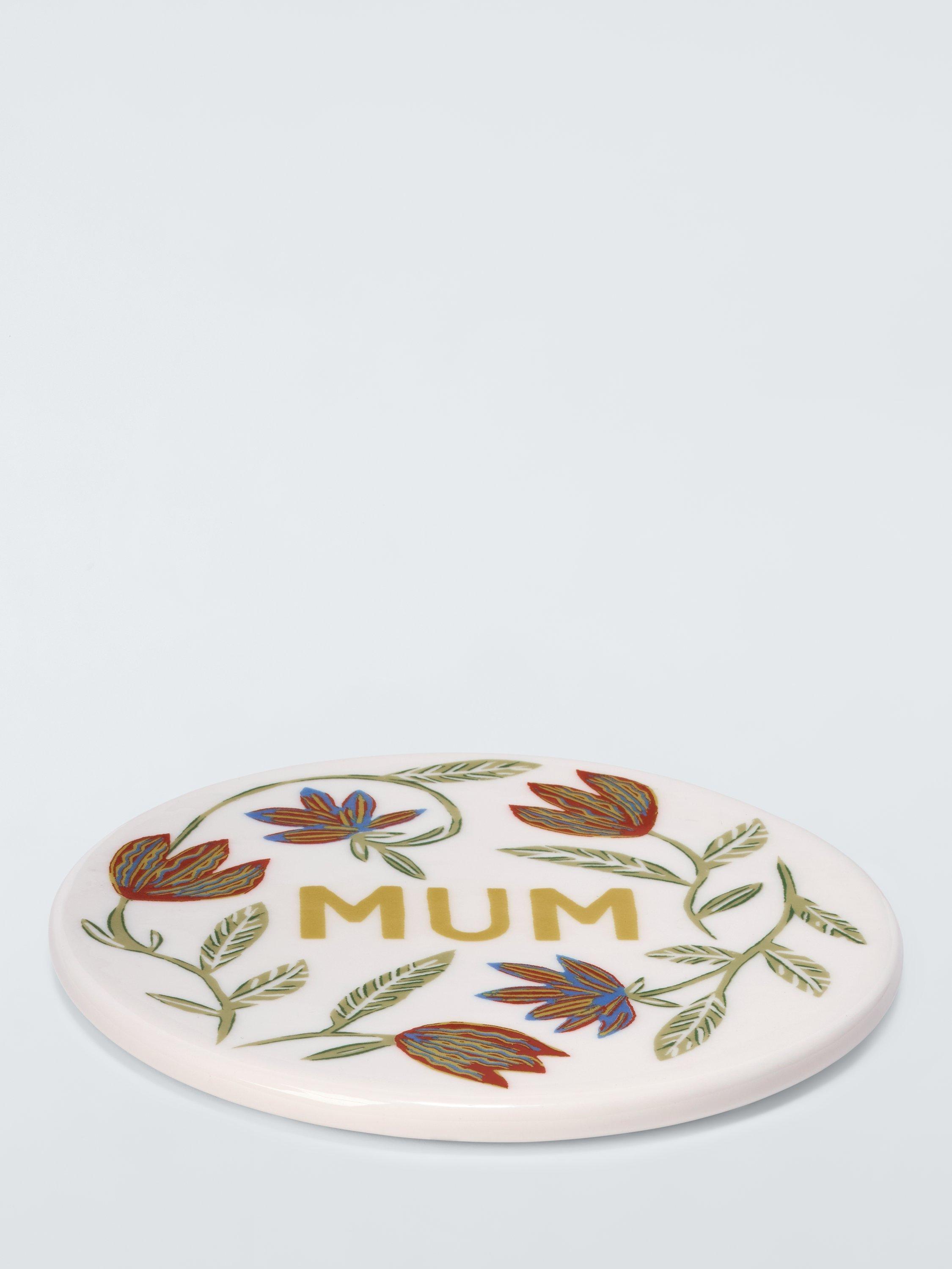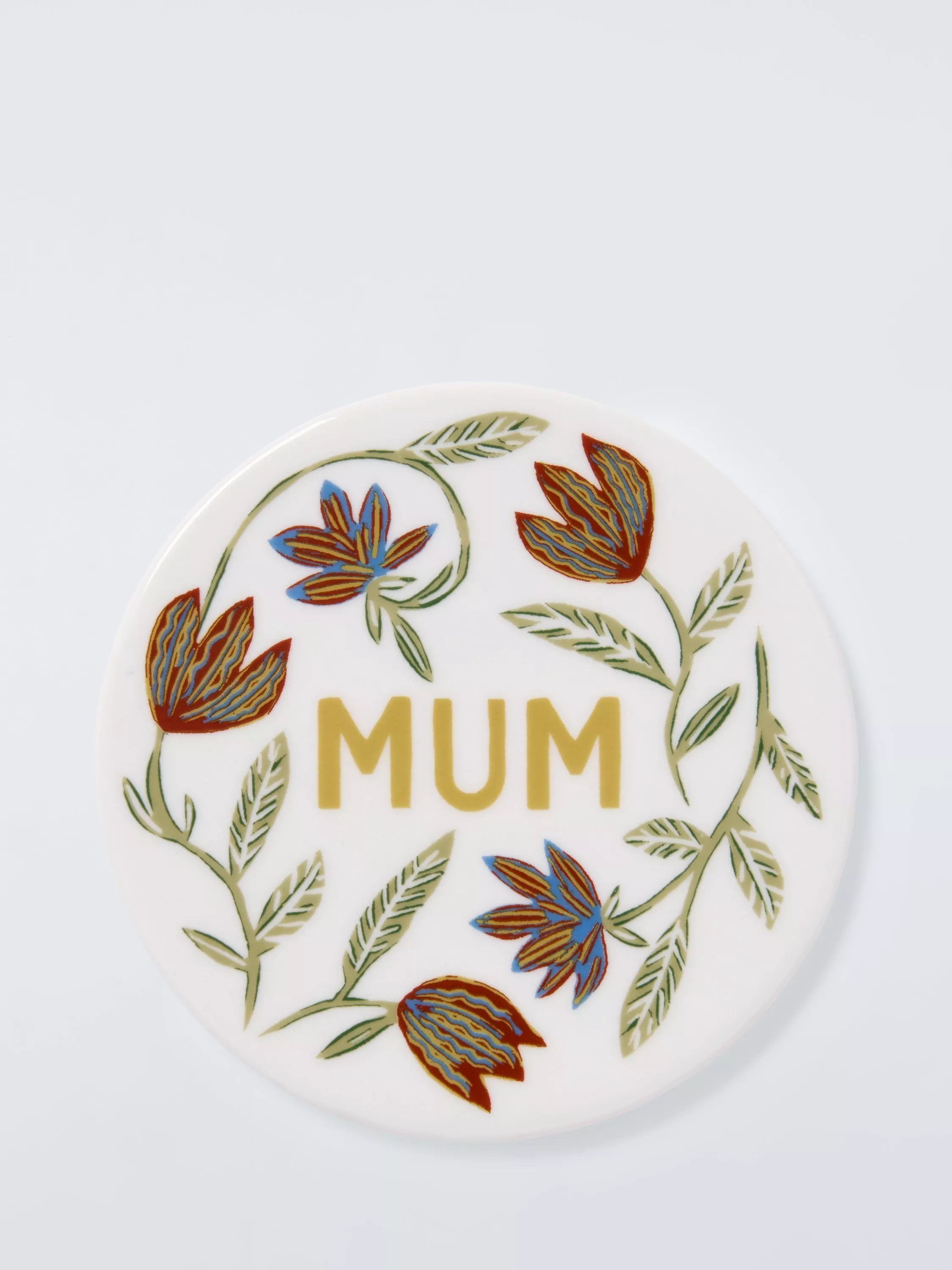 Round fine china coaster, a giftable design with the word 'Mum' surrounded by floral motifs. Ideal for Mother's Day, birthdays and special occasions.