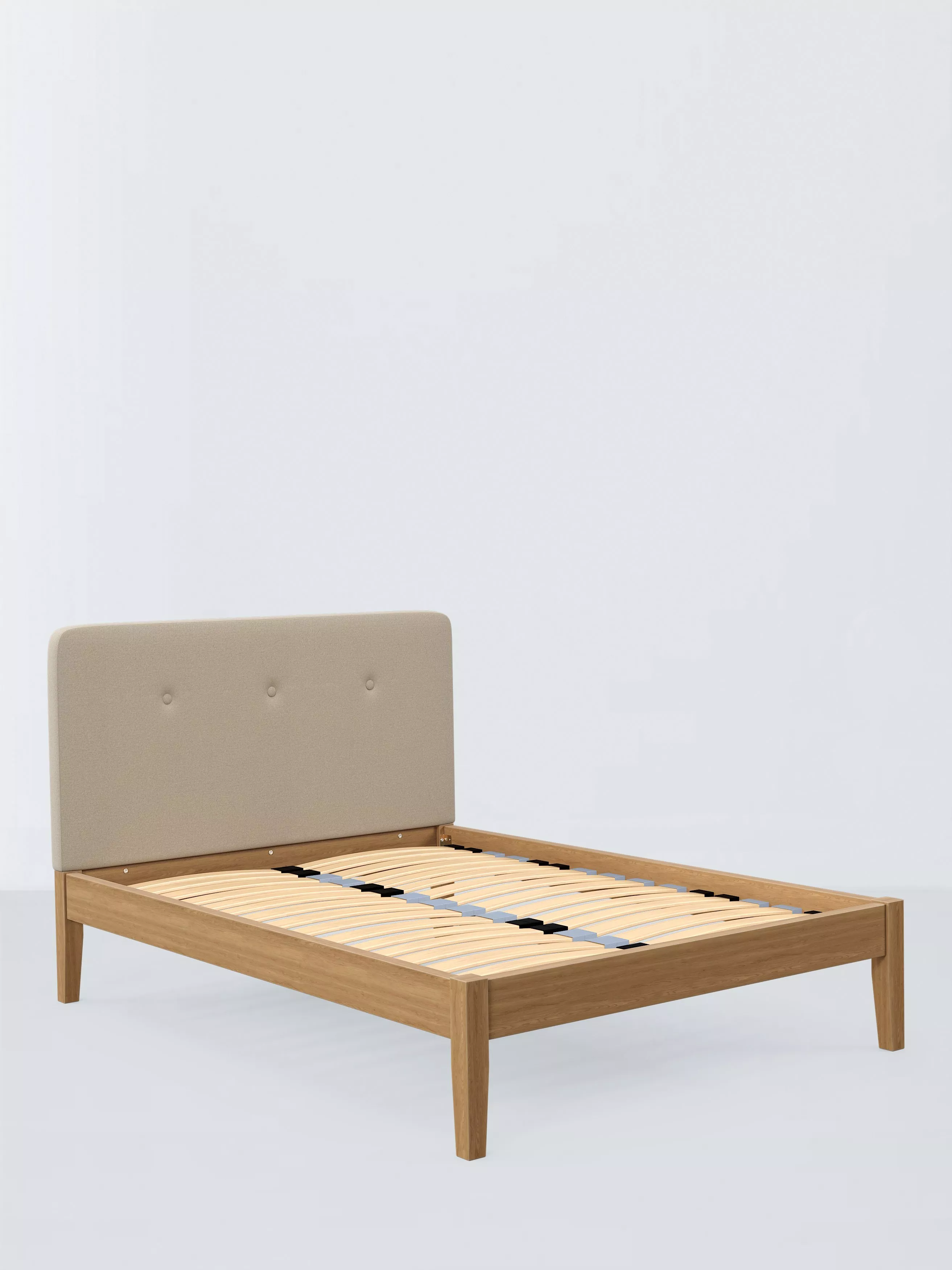 Meet Nancy Kitami, our bed frame which is designed with an upholstered headboard and a sturdy solid oak base. It's a classic shape, but the gently curved and well-padded headboard gives it a modern edge. It's accented with button detailing and can be upholstered in a fabric of your choice. Sprung slats in the base provide a supportive and responsive foundation for your mattress.