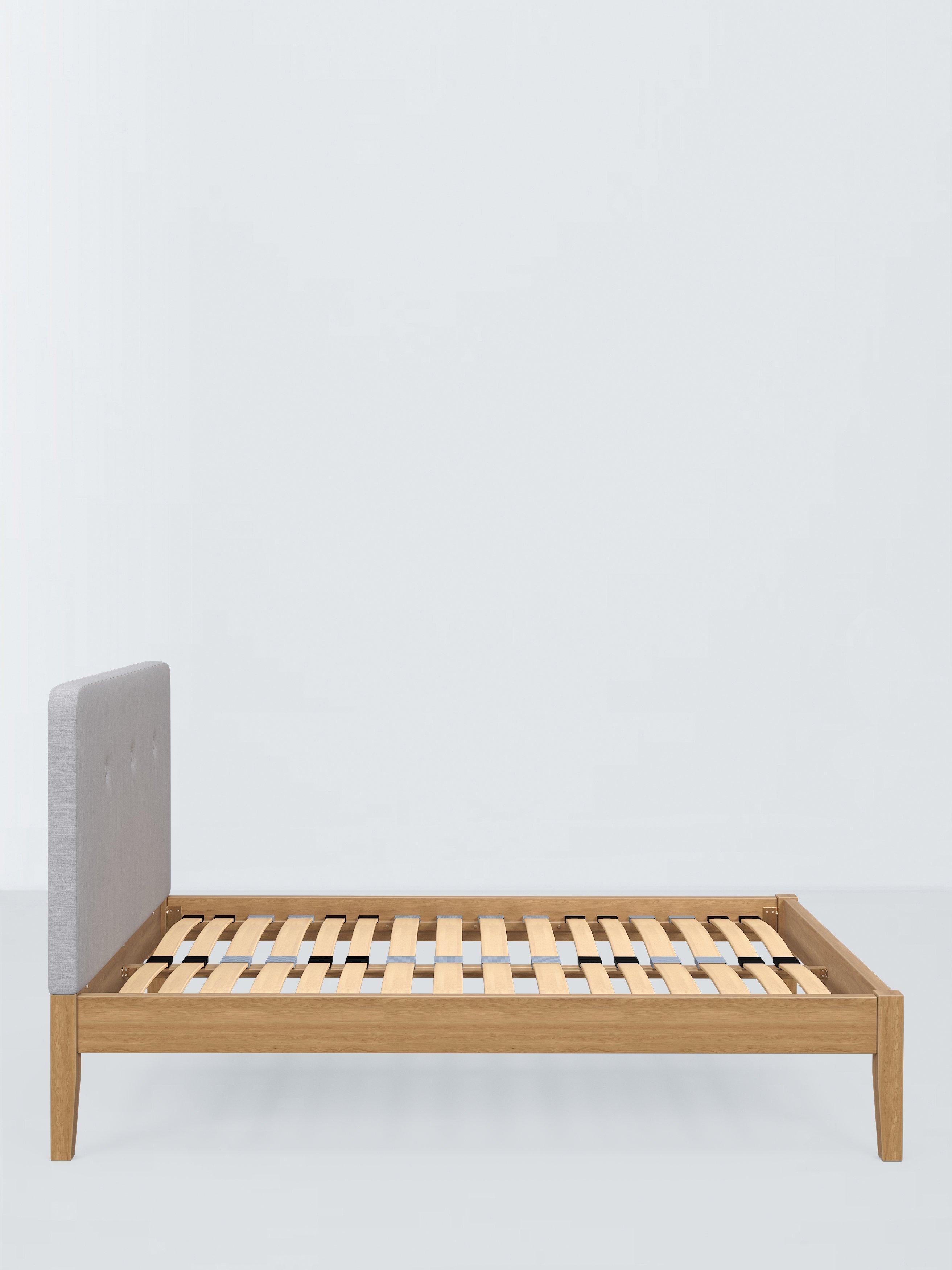 Meet Nancy Kitami, our bed frame which is designed with an upholstered headboard and a sturdy solid oak base. It's a classic shape, but the gently curved and well-padded headboard gives it a modern edge. It's accented with button detailing and can be upholstered in a fabric of your choice. Sprung slats in the base provide a supportive and responsive foundation for your mattress.