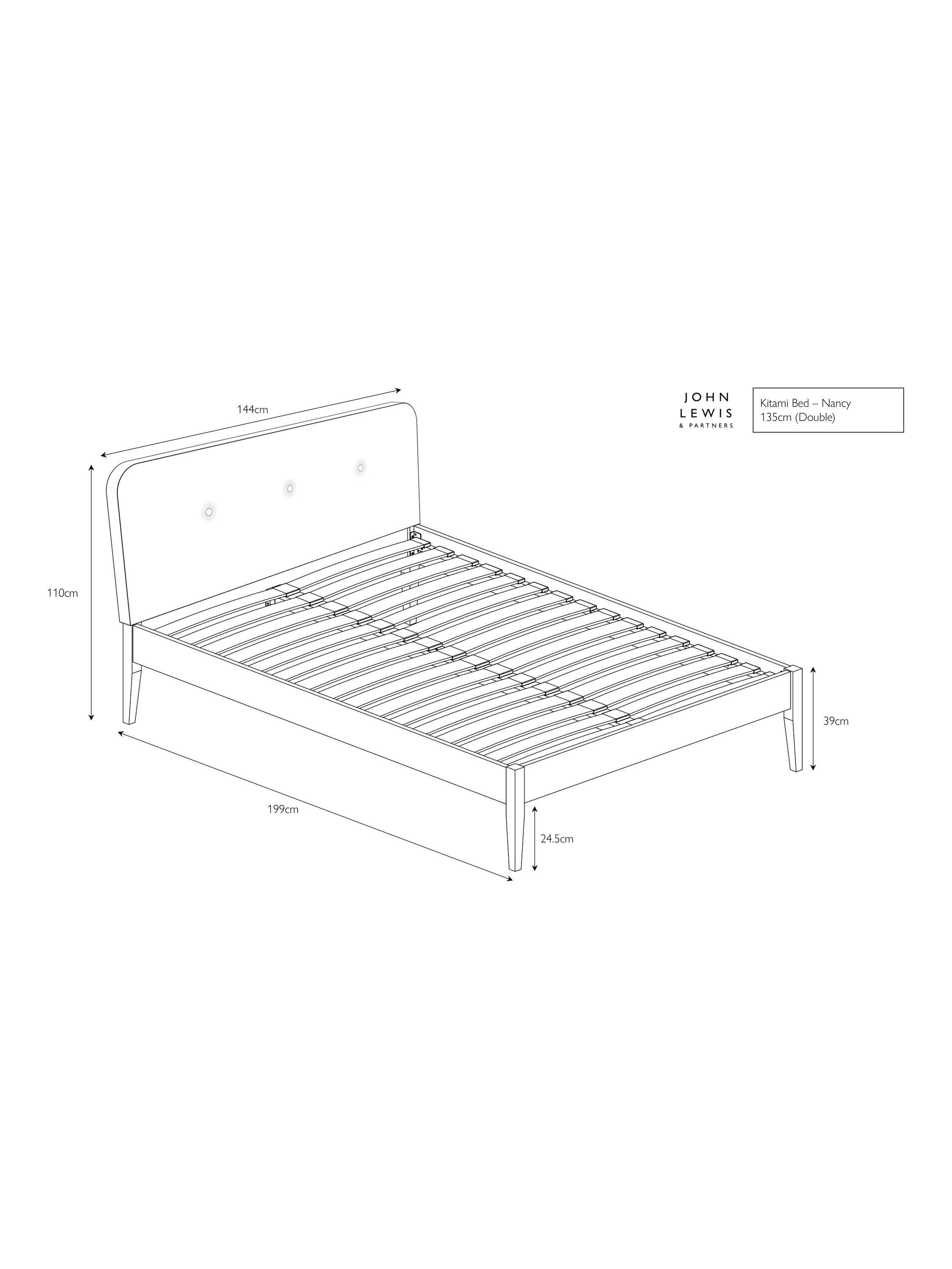 Meet Nancy Kitami, our bed frame which is designed with an upholstered headboard and a sturdy solid oak base. It's a classic shape, but the gently curved and well-padded headboard gives it a modern edge. It's accented with button detailing and can be upholstered in a fabric of your choice. Sprung slats in the base provide a supportive and responsive foundation for your mattress.