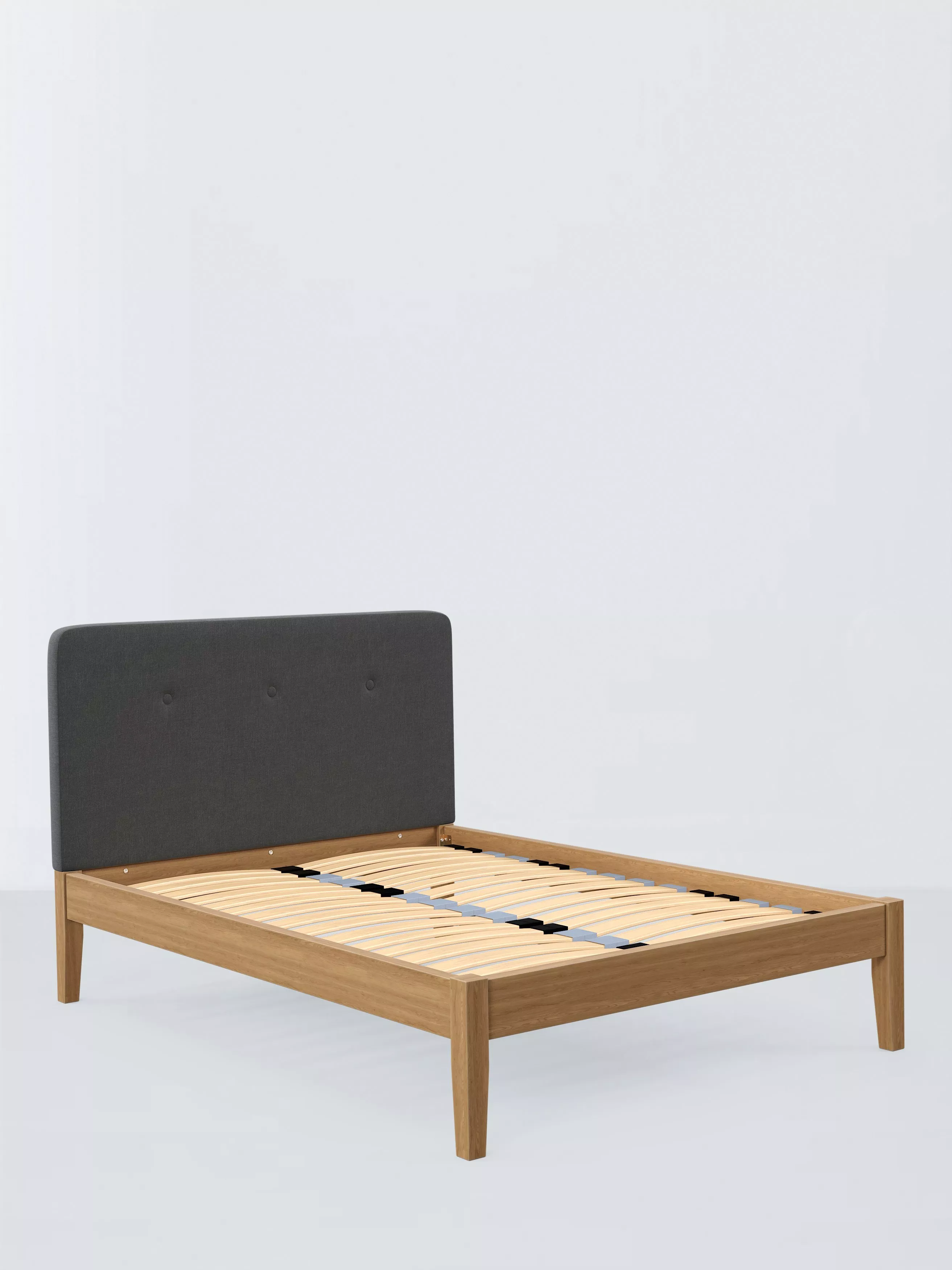 Meet Nancy Kitami, our bed frame which is designed with an upholstered headboard and a sturdy solid oak base. It's a classic shape, but the gently curved and well-padded headboard gives it a modern edge. It's accented with button detailing and can be upholstered in a fabric of your choice. Sprung slats in the base provide a supportive and responsive foundation for your mattress.
