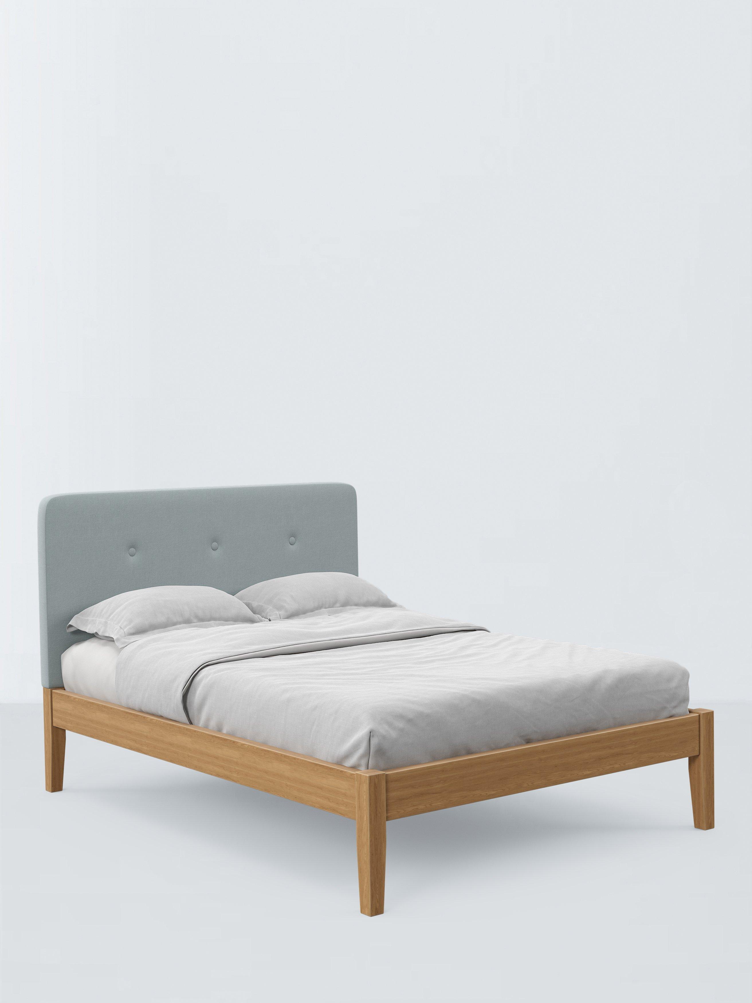 Meet Nancy Kitami, our bed frame which is designed with an upholstered headboard and a sturdy solid oak base. It's a classic shape, but the gently curved and well-padded headboard gives it a modern edge. It's accented with button detailing and can be upholstered in a fabric of your choice. Sprung slats in the base provide a supportive and responsive foundation for your mattress.