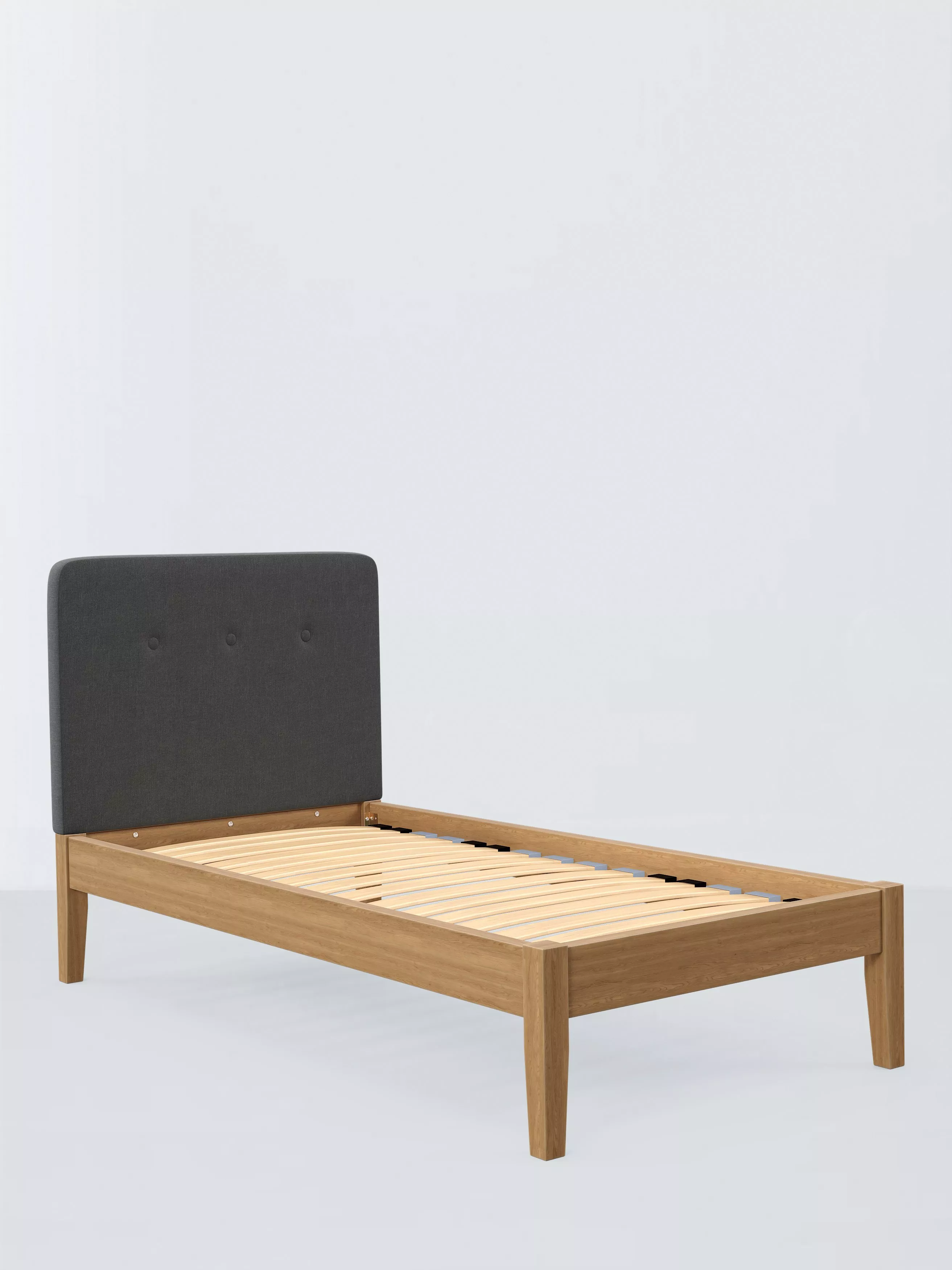 Meet Nancy Kitami, our bed frame which is designed with an upholstered headboard and a sturdy solid oak base. It's a classic shape, but the gently curved and well-padded headboard gives it a modern edge. It's accented with button detailing and can be upholstered in a fabric of your choice. Sprung slats in the base provide a supportive and responsive foundation for your mattress.