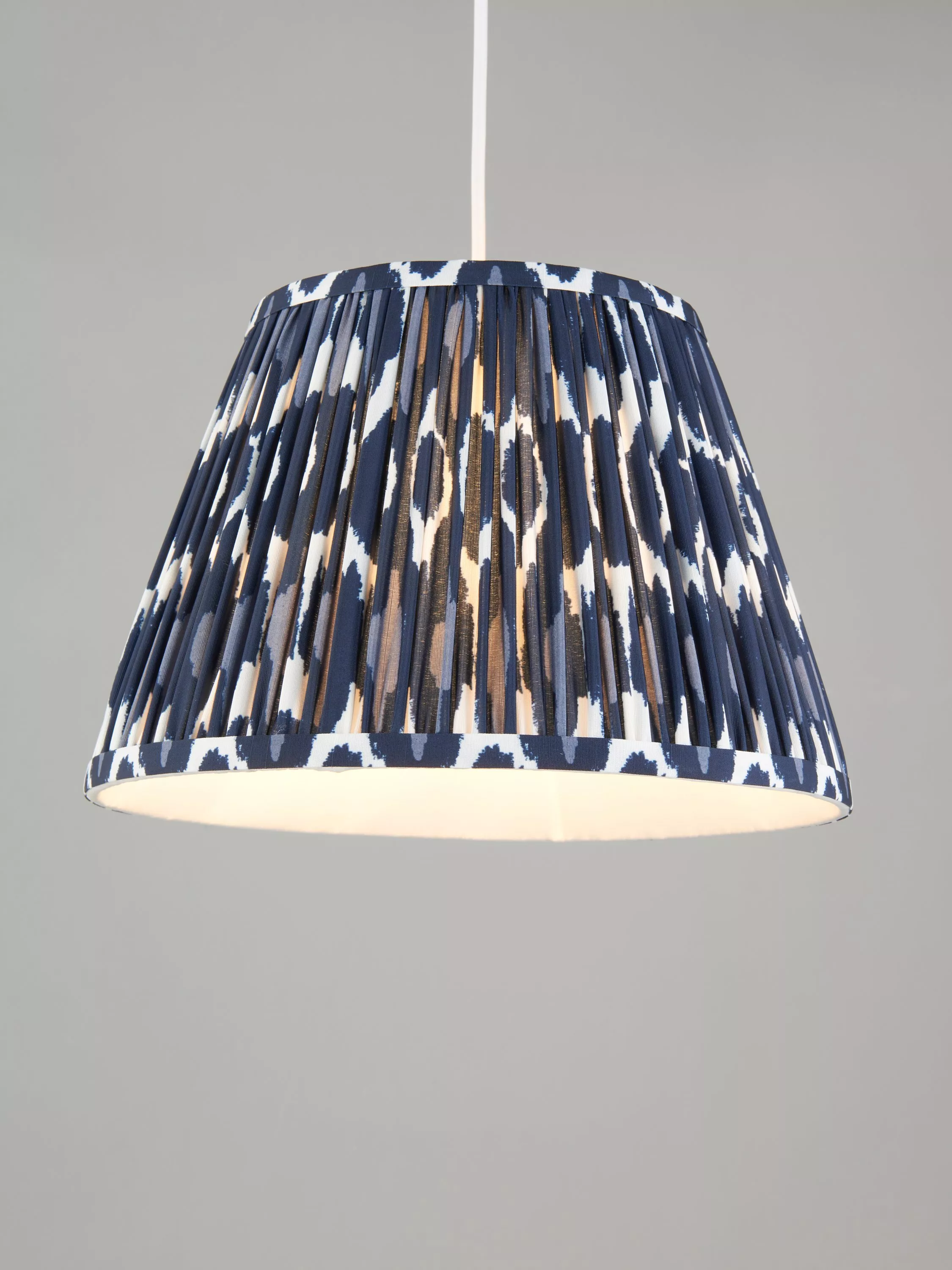 A digitally printed tapered lampshade that's been gathered and pleated, adding colour and charm to your space. Made from a faux-silk fabric, with a soft texture that gives the pattern a joyful tone when lit. Comes with a reversible gimbal for use with table lamp bases and ceiling light fittings.