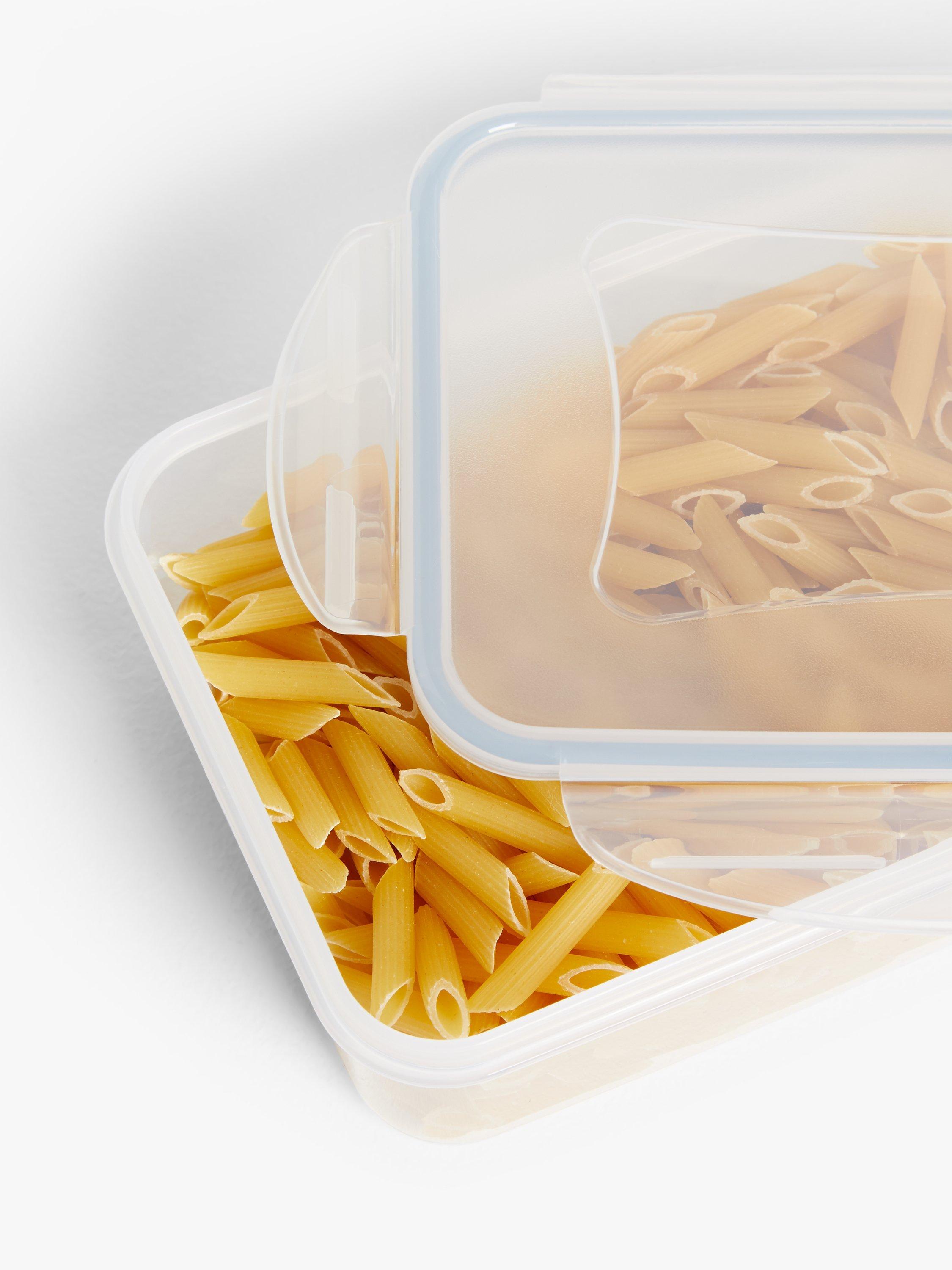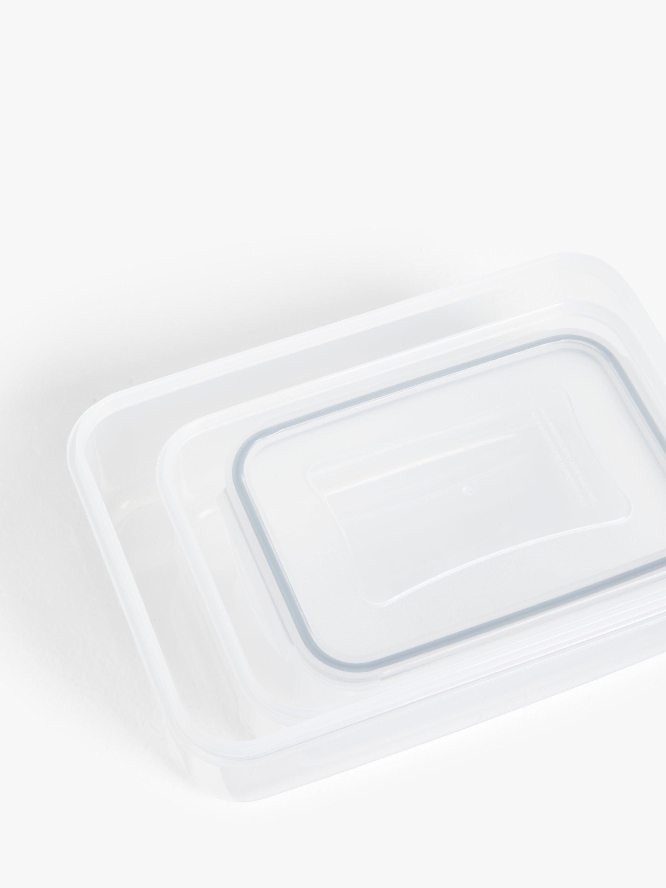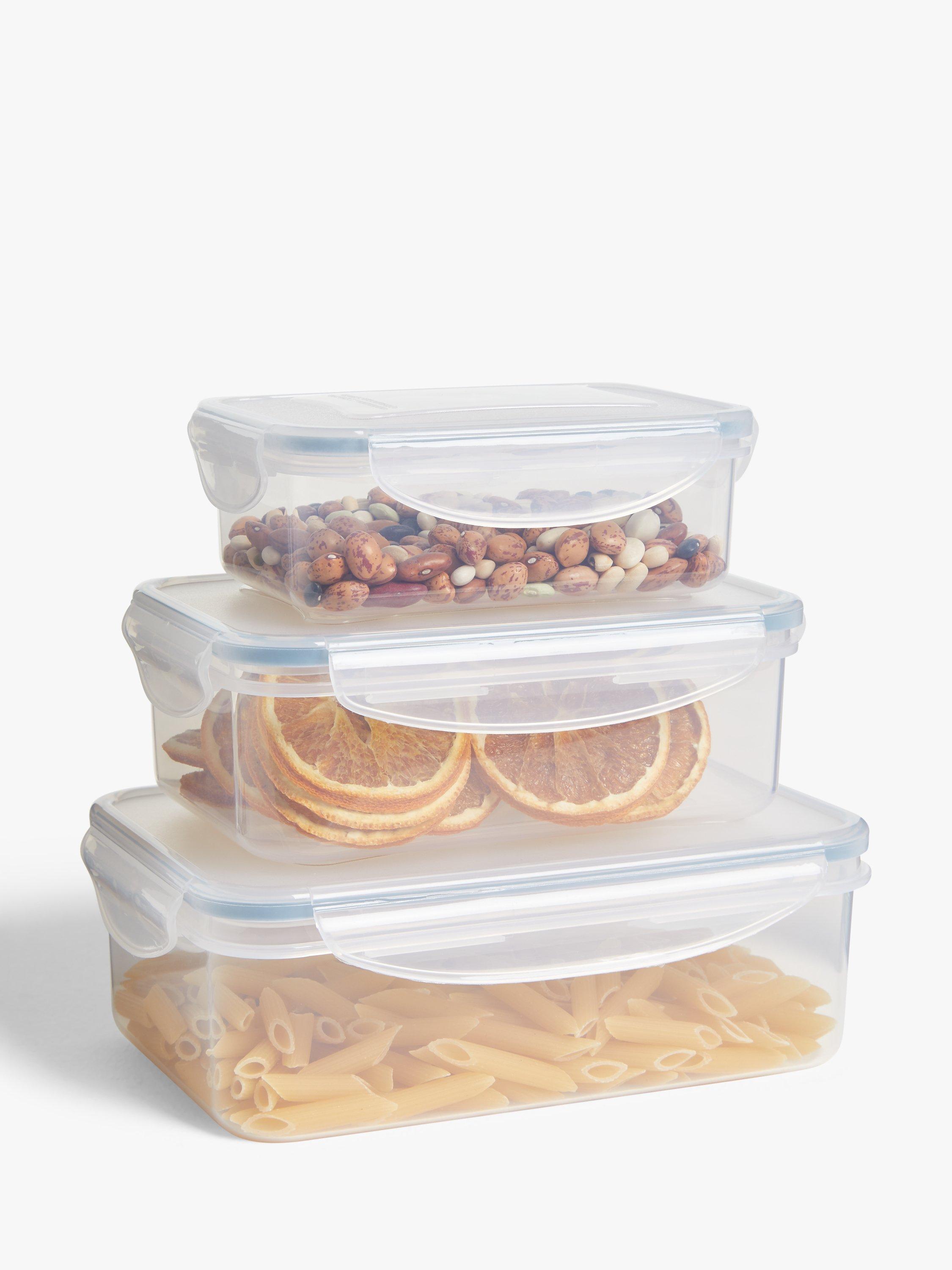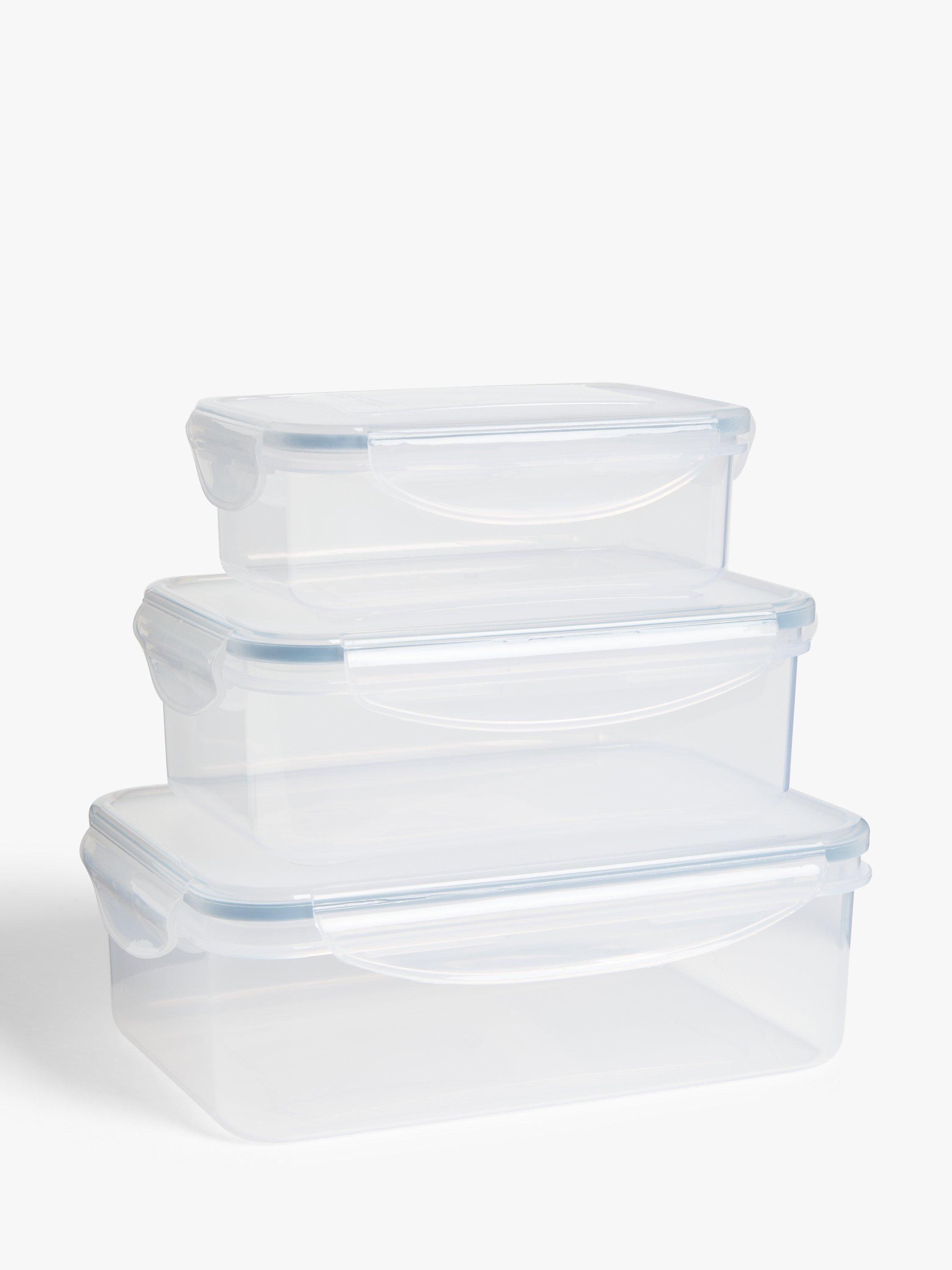 A set of three rectangular plastic storage containers with a clip-lock closure and airtight silicone seal to keep food fresh for longer. Sizes include 500ml, 1L and 1.5L capacity.