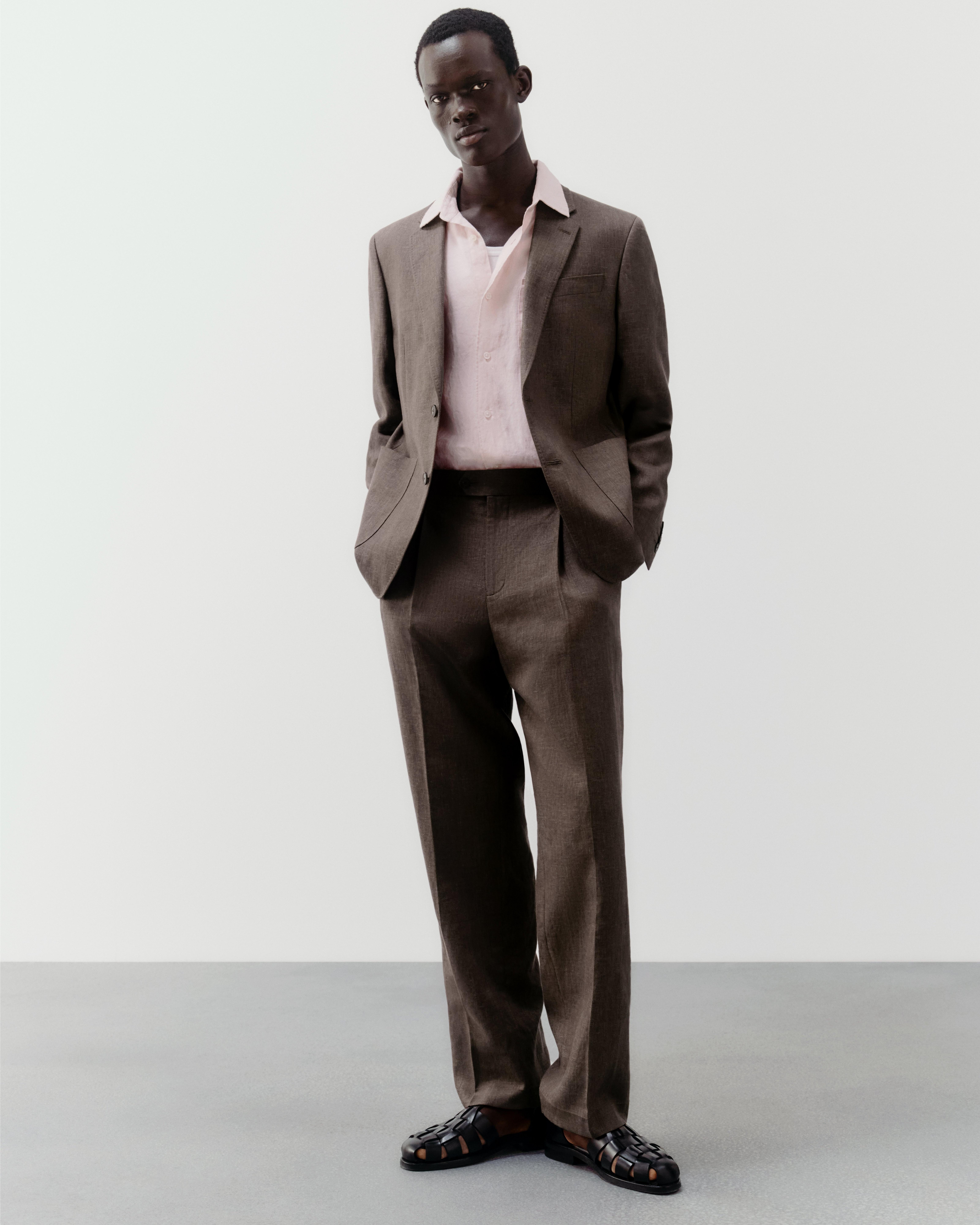 A cotton linen blend blazer tailored to our relaxed fit specification in a rich brown colourway. Styled with a notch lapel, flap pockets, a welt chest pocket, and two centre front buttons.