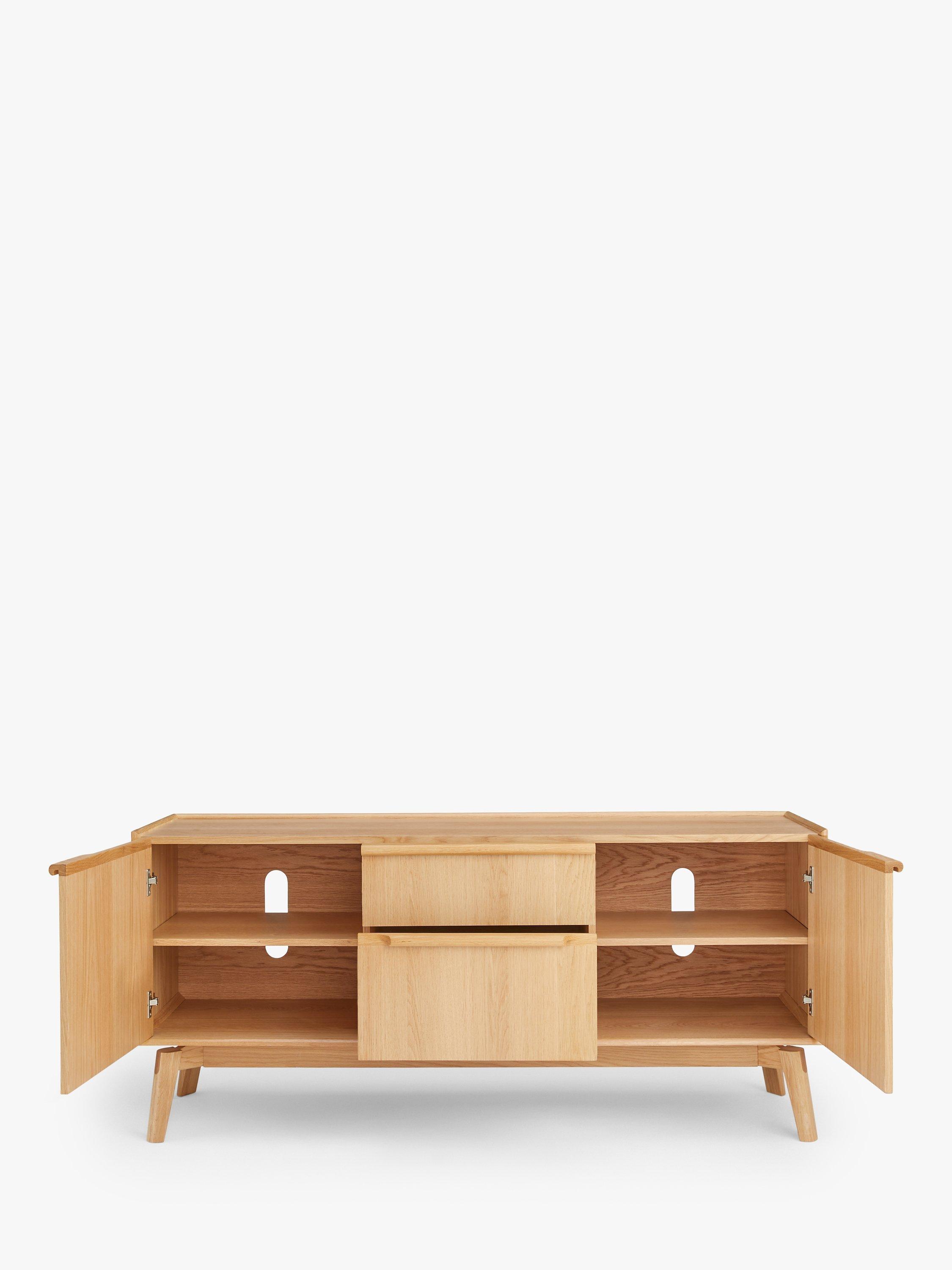 This sideboard has two drawers of different depths and two adjustable interior shelves. Cable holes at the back are useful for vinyl players and lighting cables.