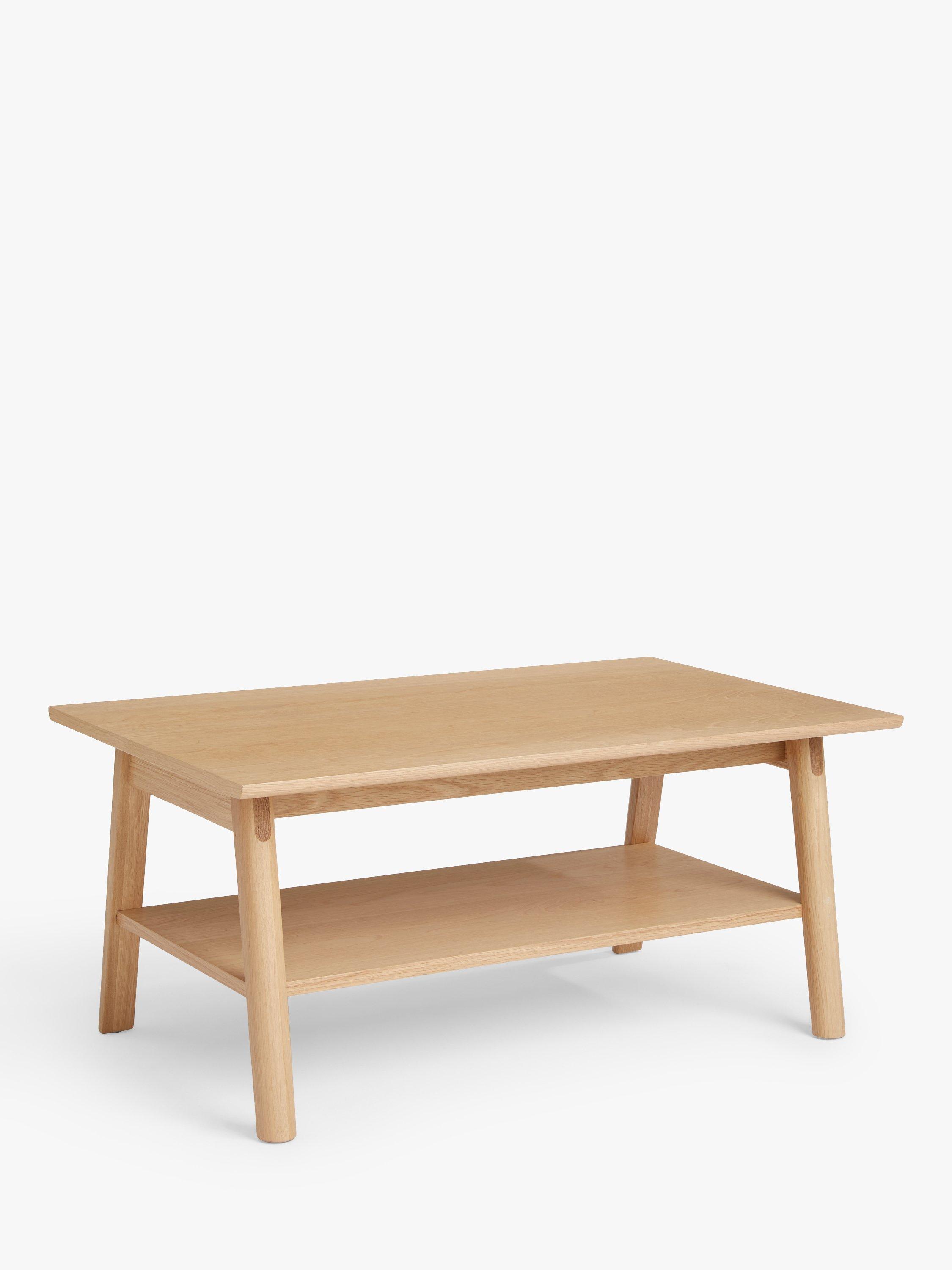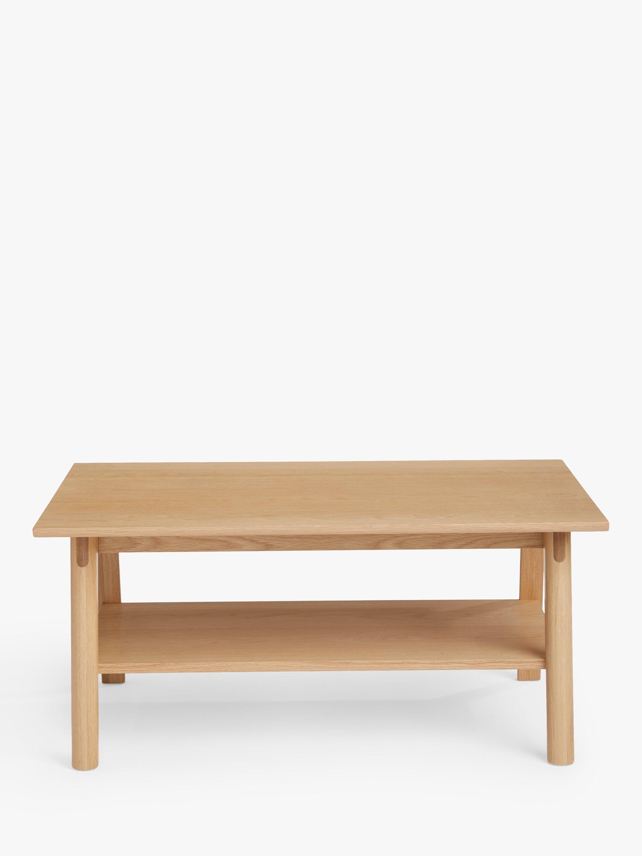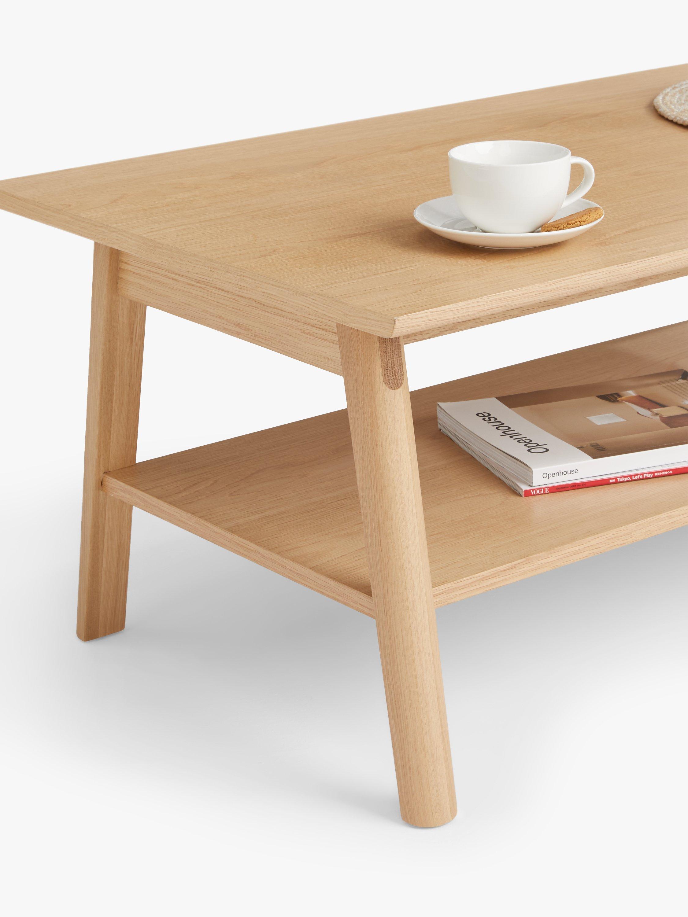 This coffee table has sturdy, splayed legs braced by a handy bottom shelf that helps keep the top surface tidy.