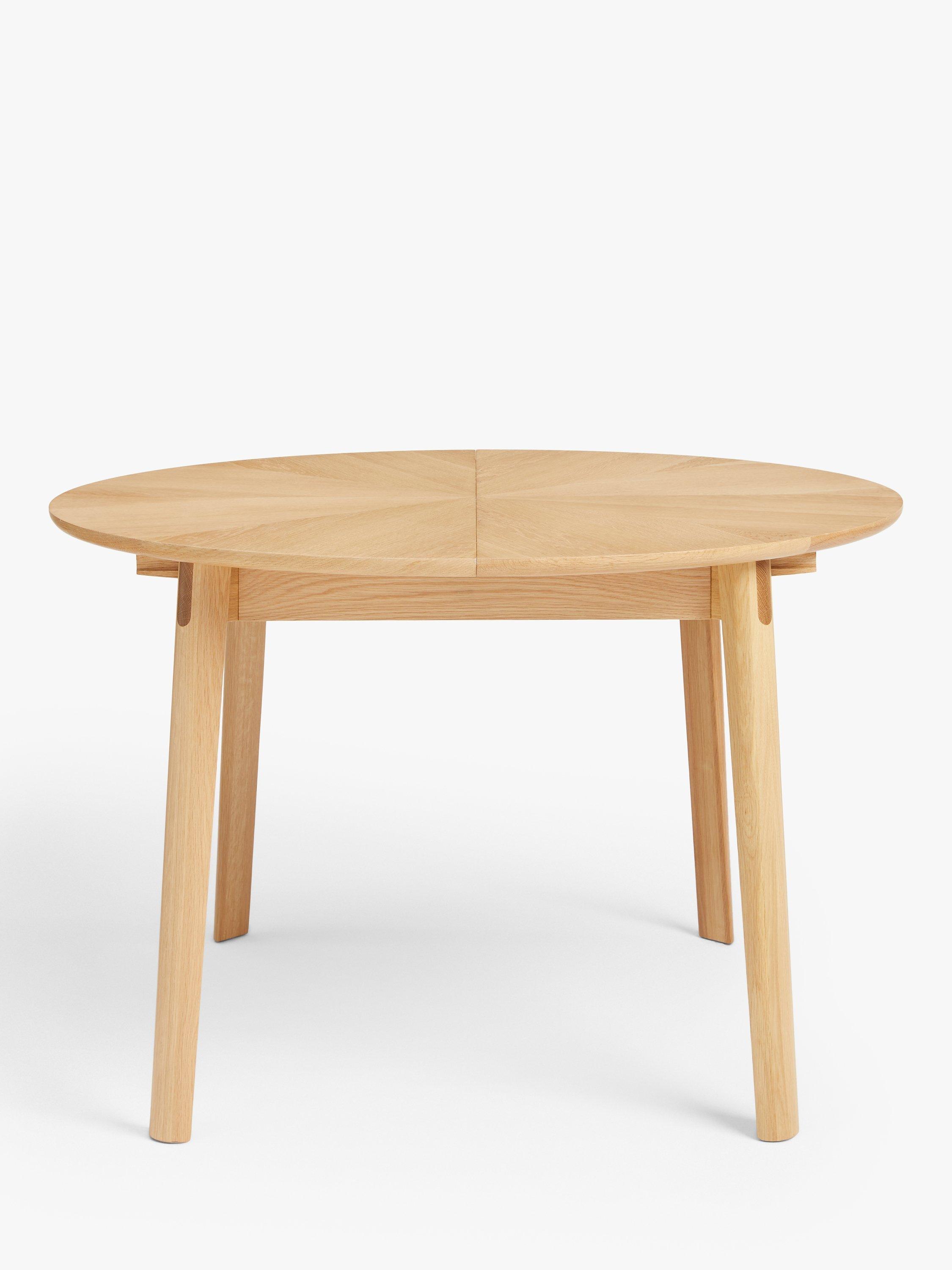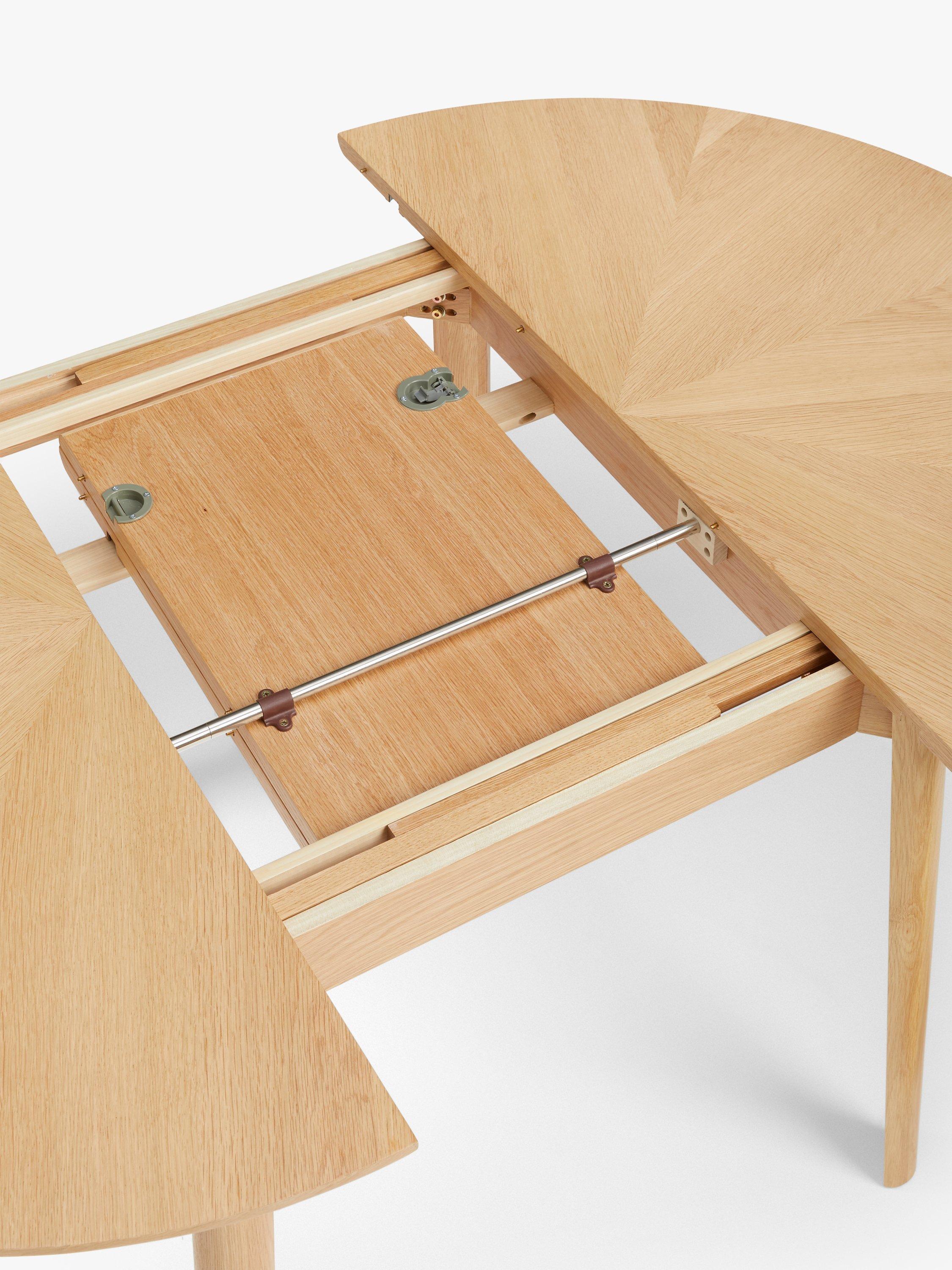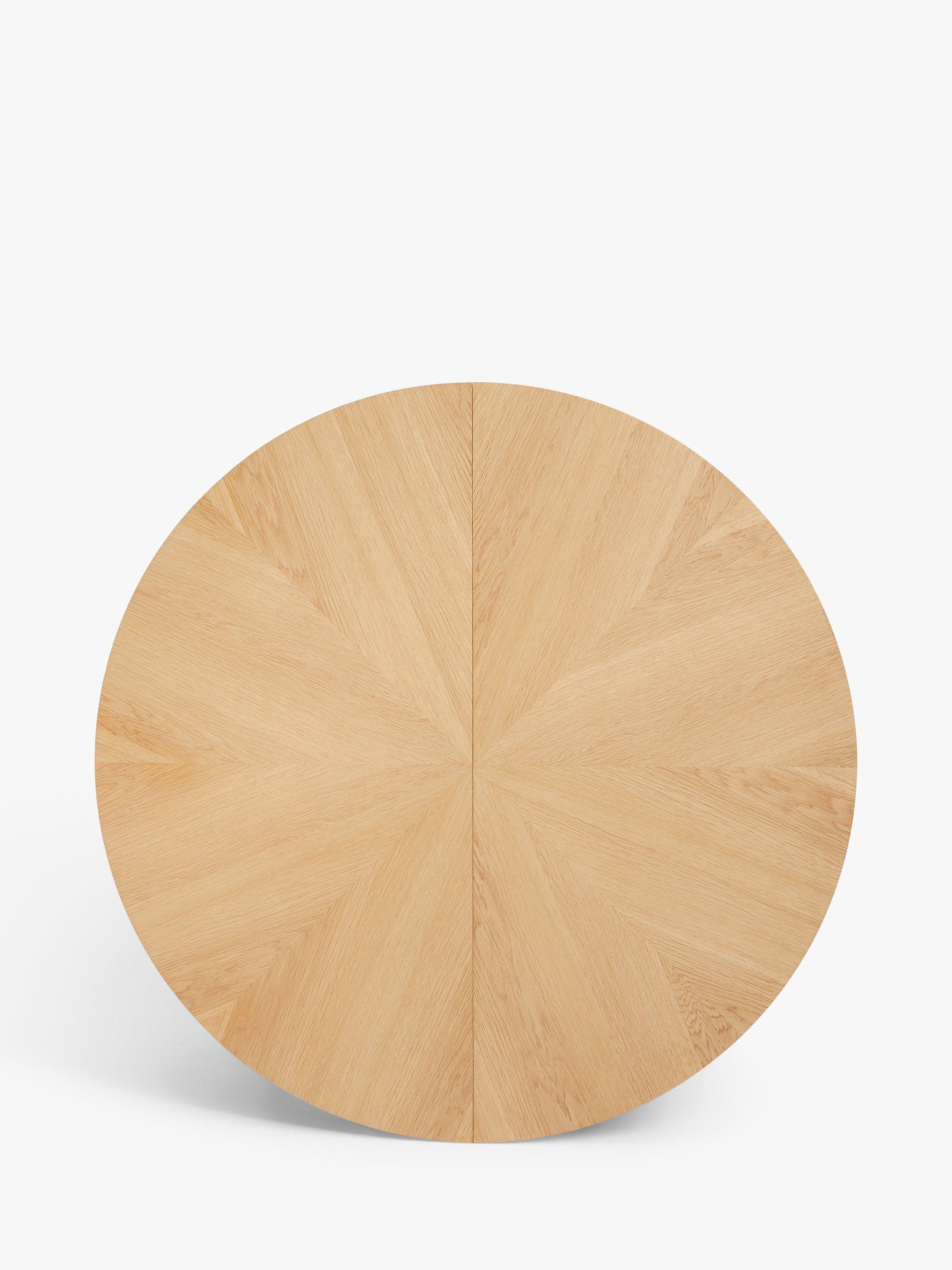 This round dining table features a statement, "starburst" veneer on the top and seats up to 6 with the central, fold-out leaf in place.