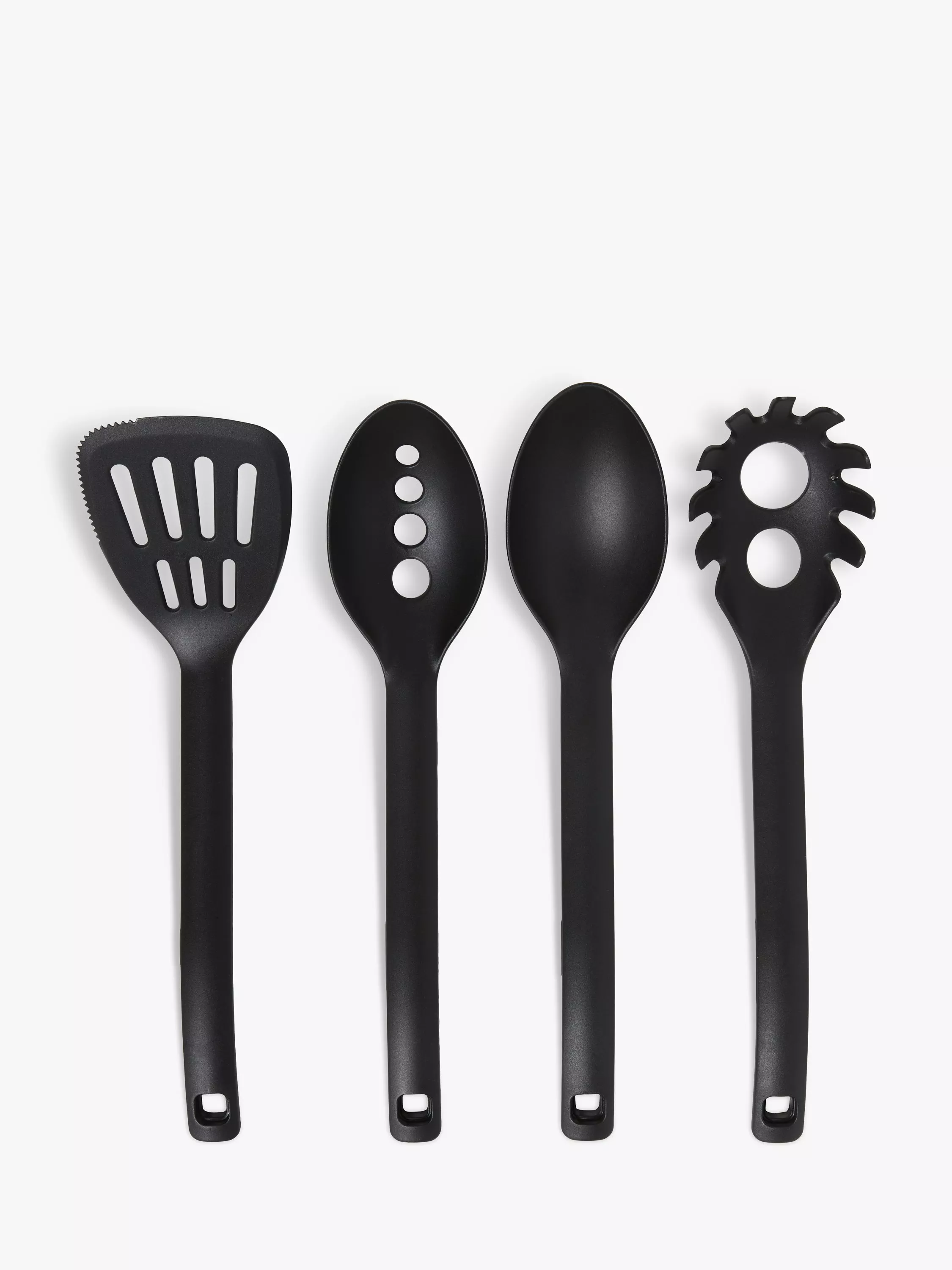 The set includes a slotted turner with one serrated edge, solid spoon, slotted spoon and spaghetti server. Made of heat-resistant nylon, the utensils can happily be used with non-stick surfaces without worrying about scratches.
