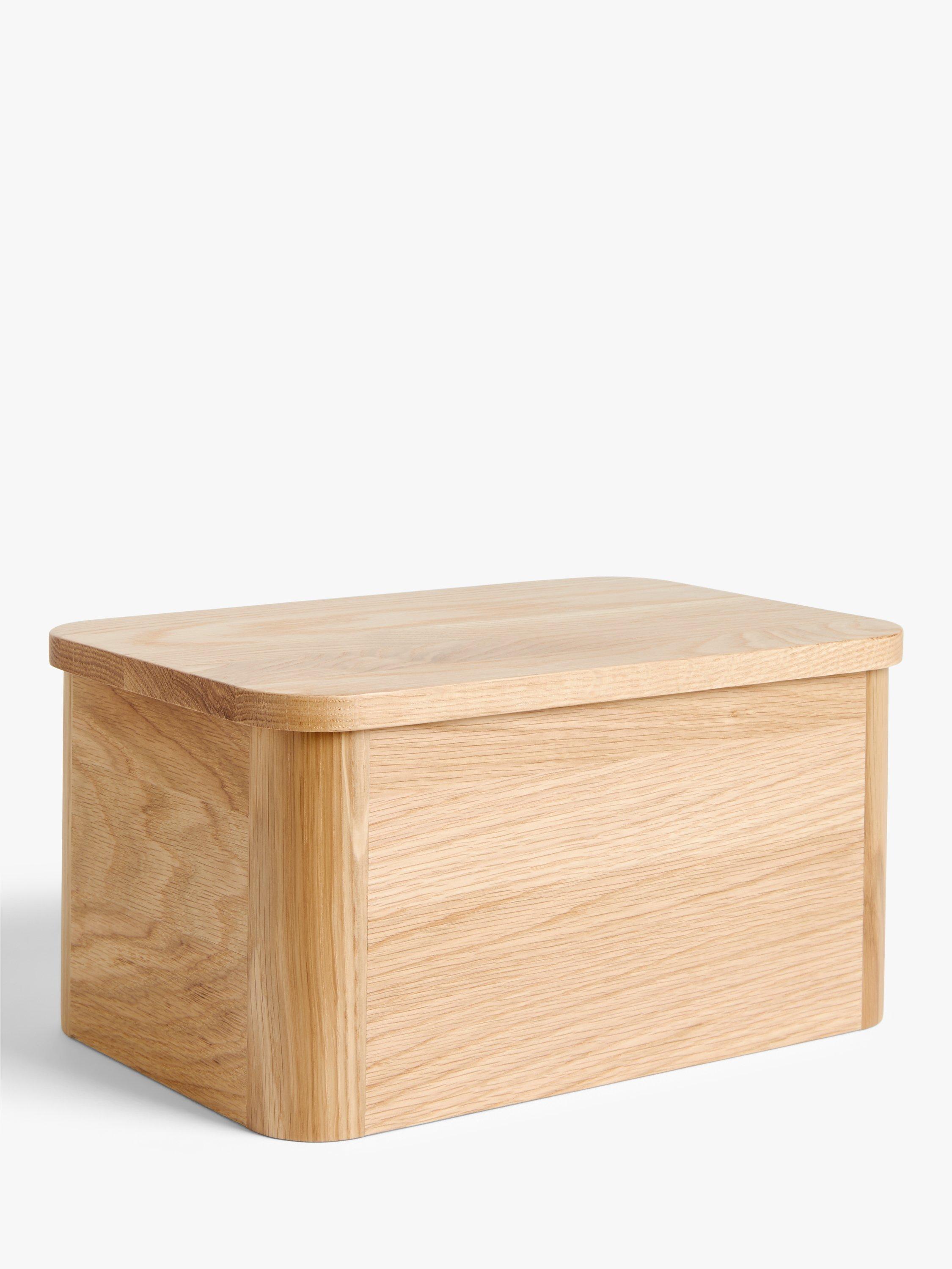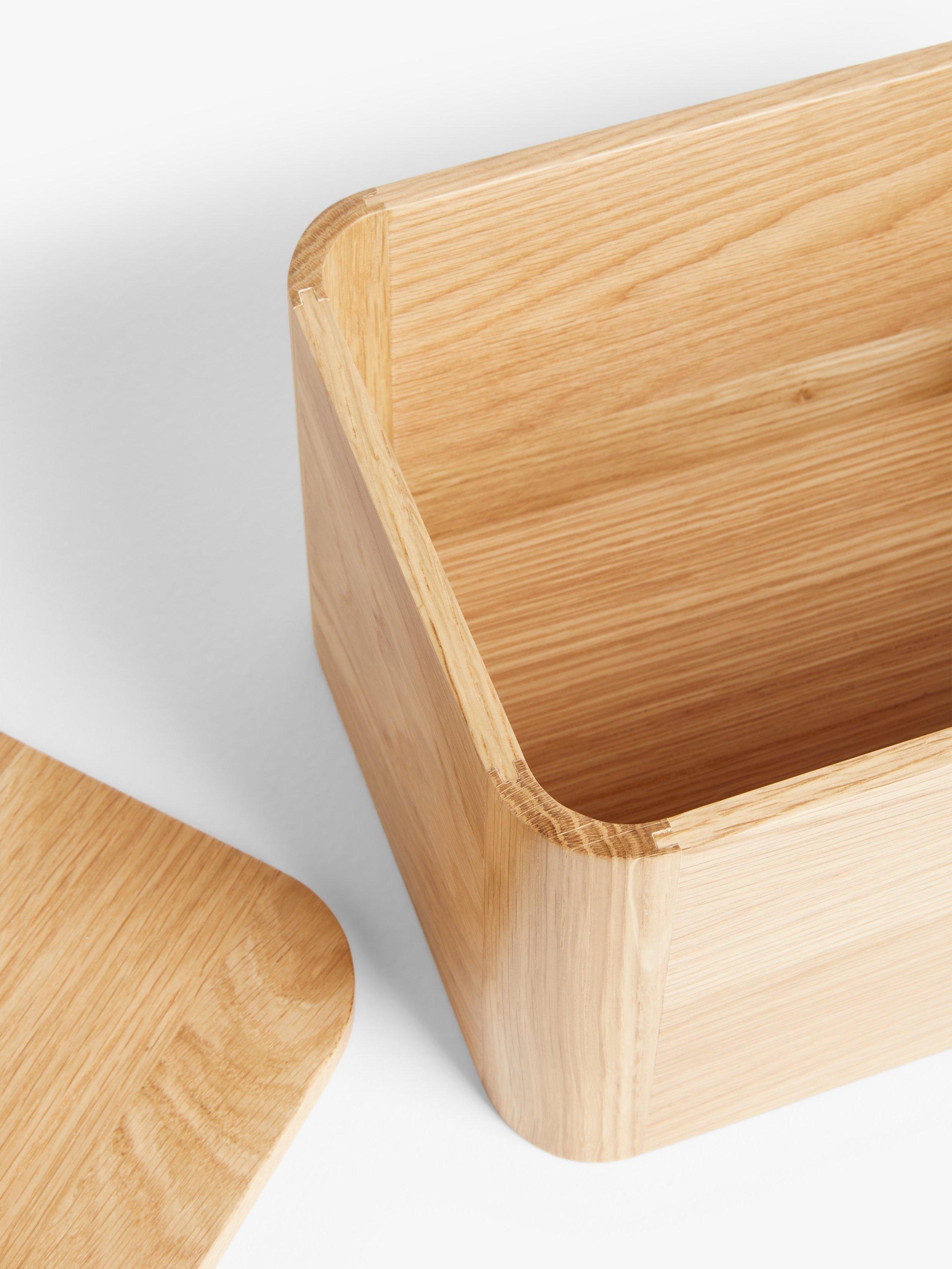 A natural oak and oak veneer bread bin with a lid that doubles as a slicing board.