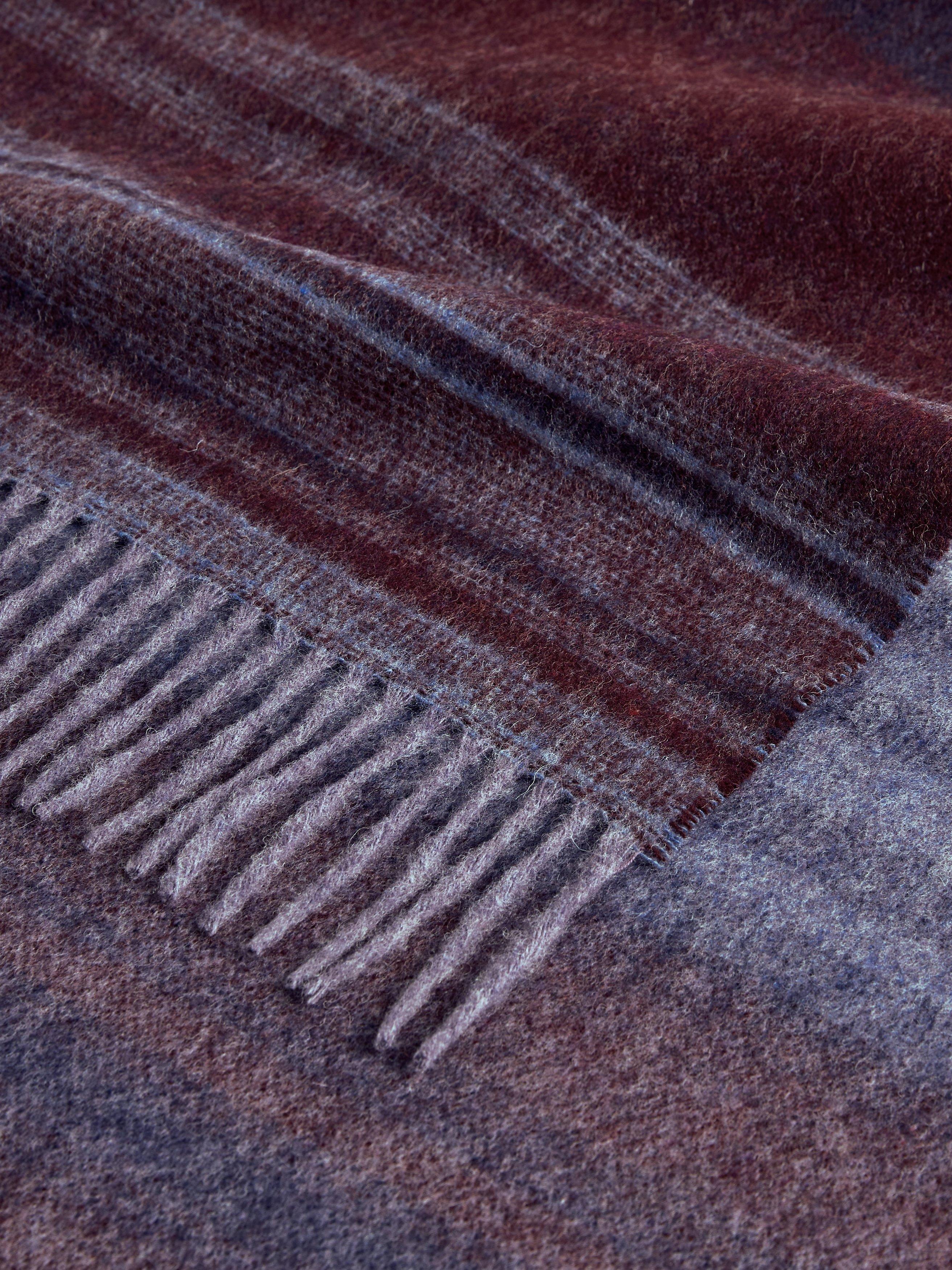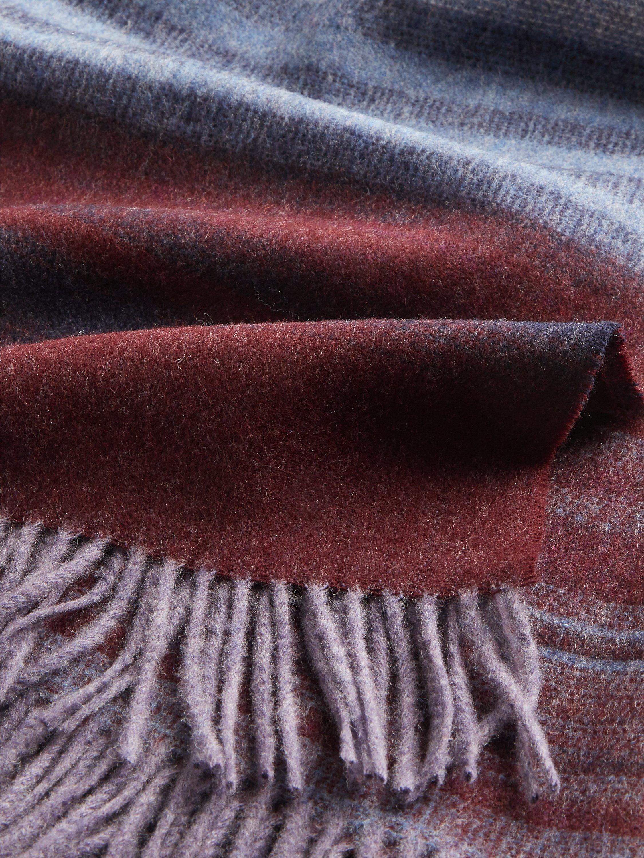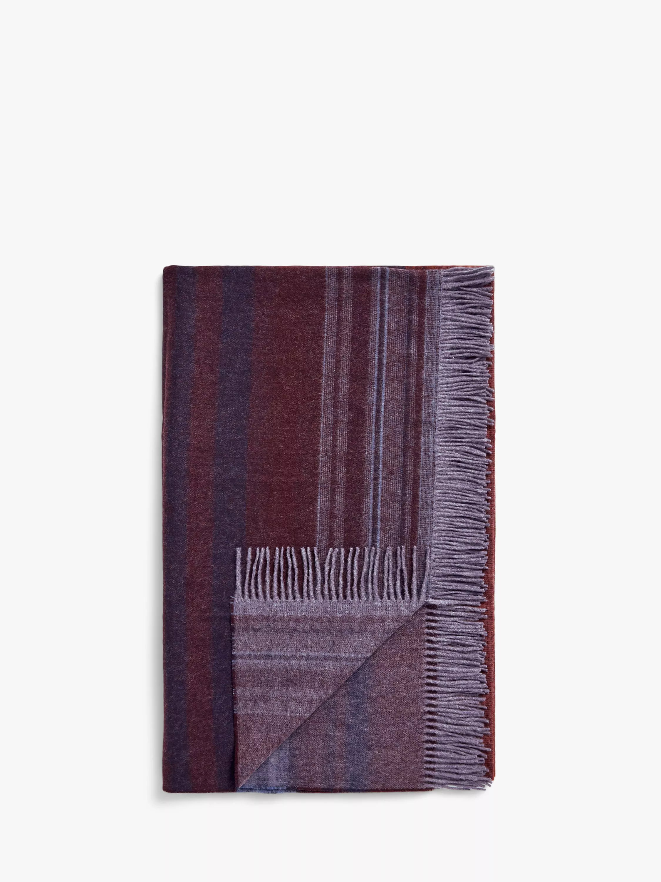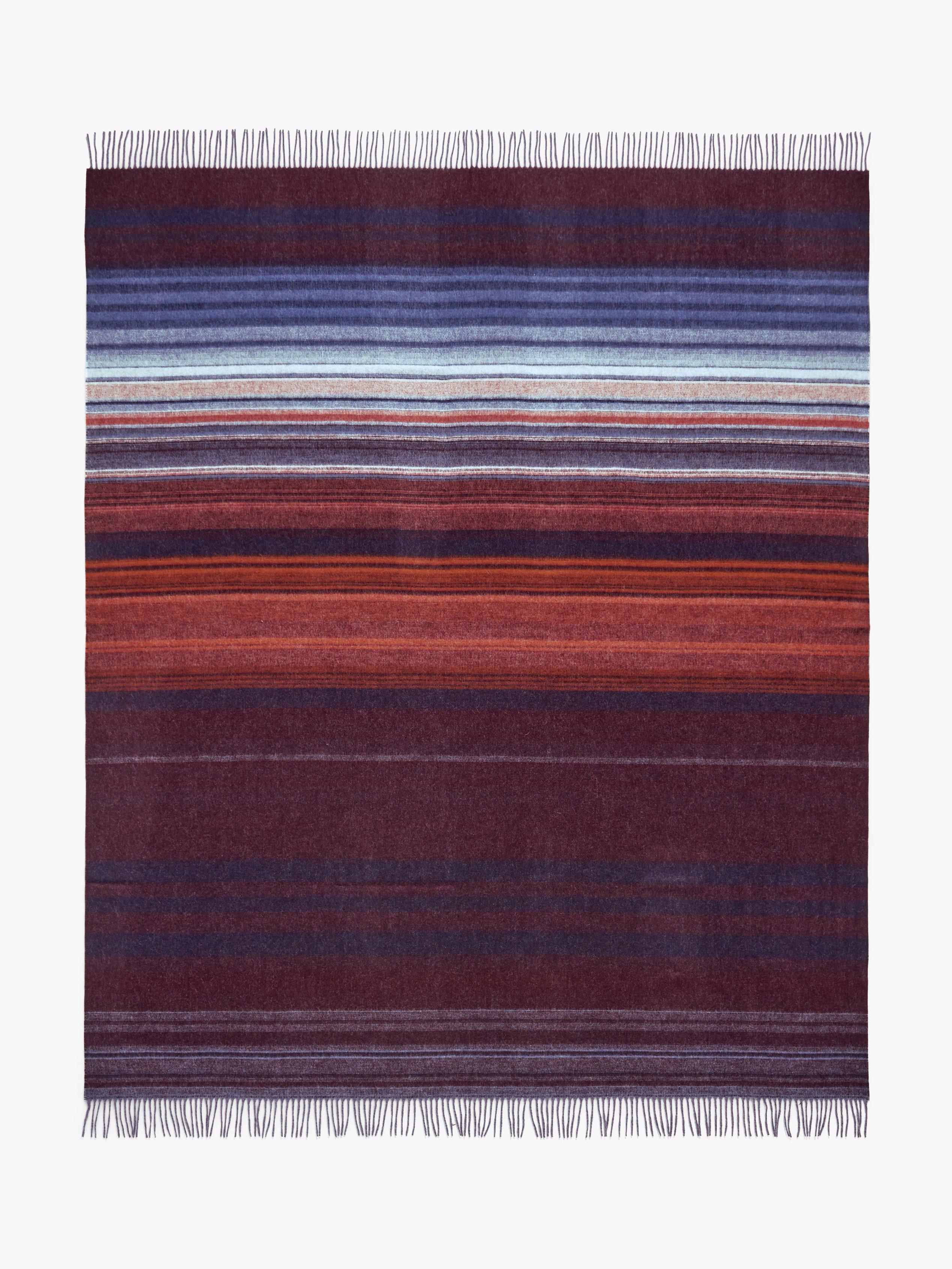 A luxuriously soft Merino Wool throw with a contemporary woven gradient stripe design featuring rich blue, plum and burnt orange tones.
