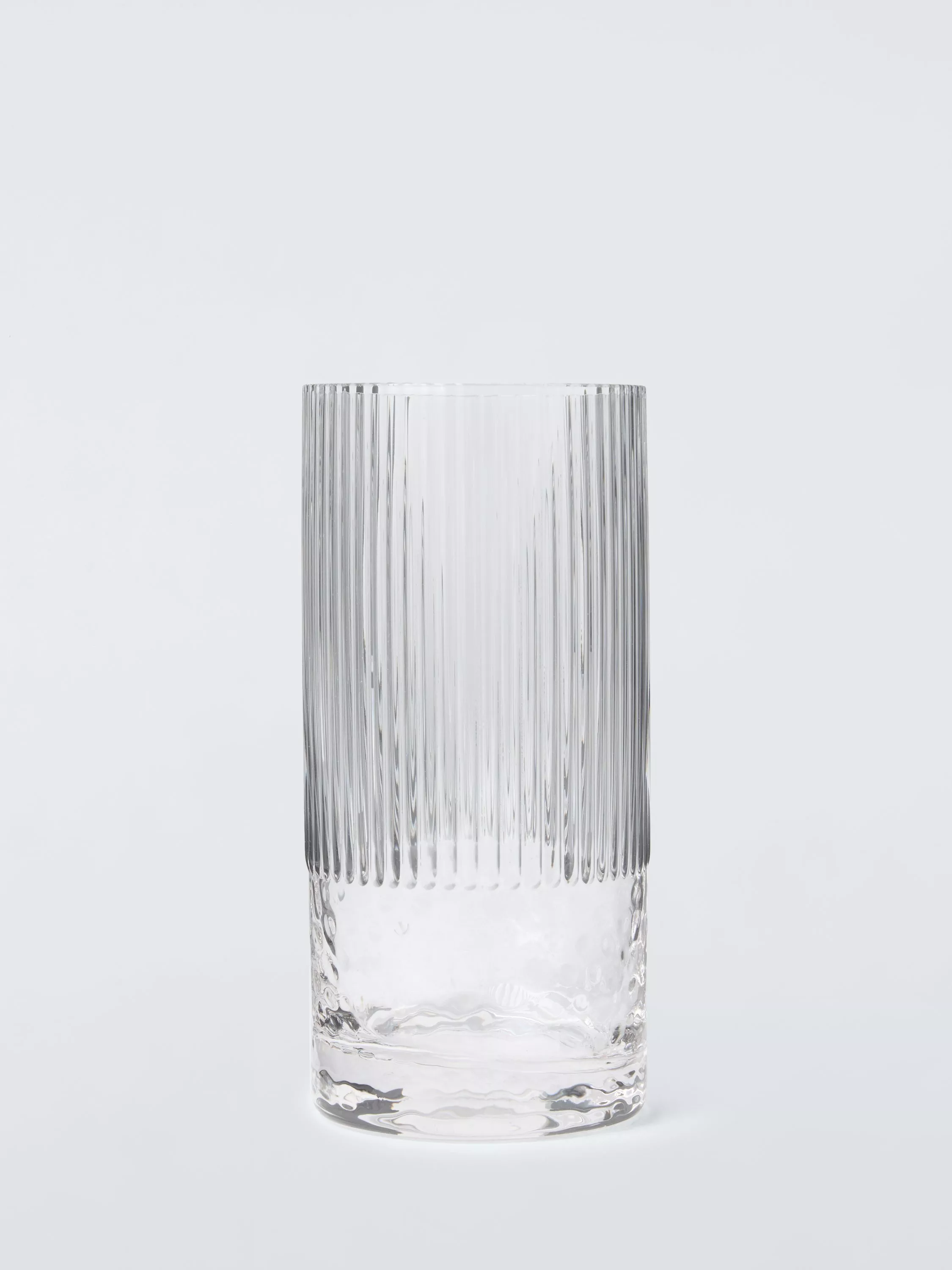 Sculptural texture meets modern clarity in this optic glass highball, with a design that catches the light from every angle. The sharp vertical ribbing on the upper half dissolves into an organic, hammered glass base, creating a sophisticated silhouette that feels as distinctive as it looks. A staple for your home bar, bringing a refined, sensory edge to every pour. Dishwasher-safe for easy cleaning.