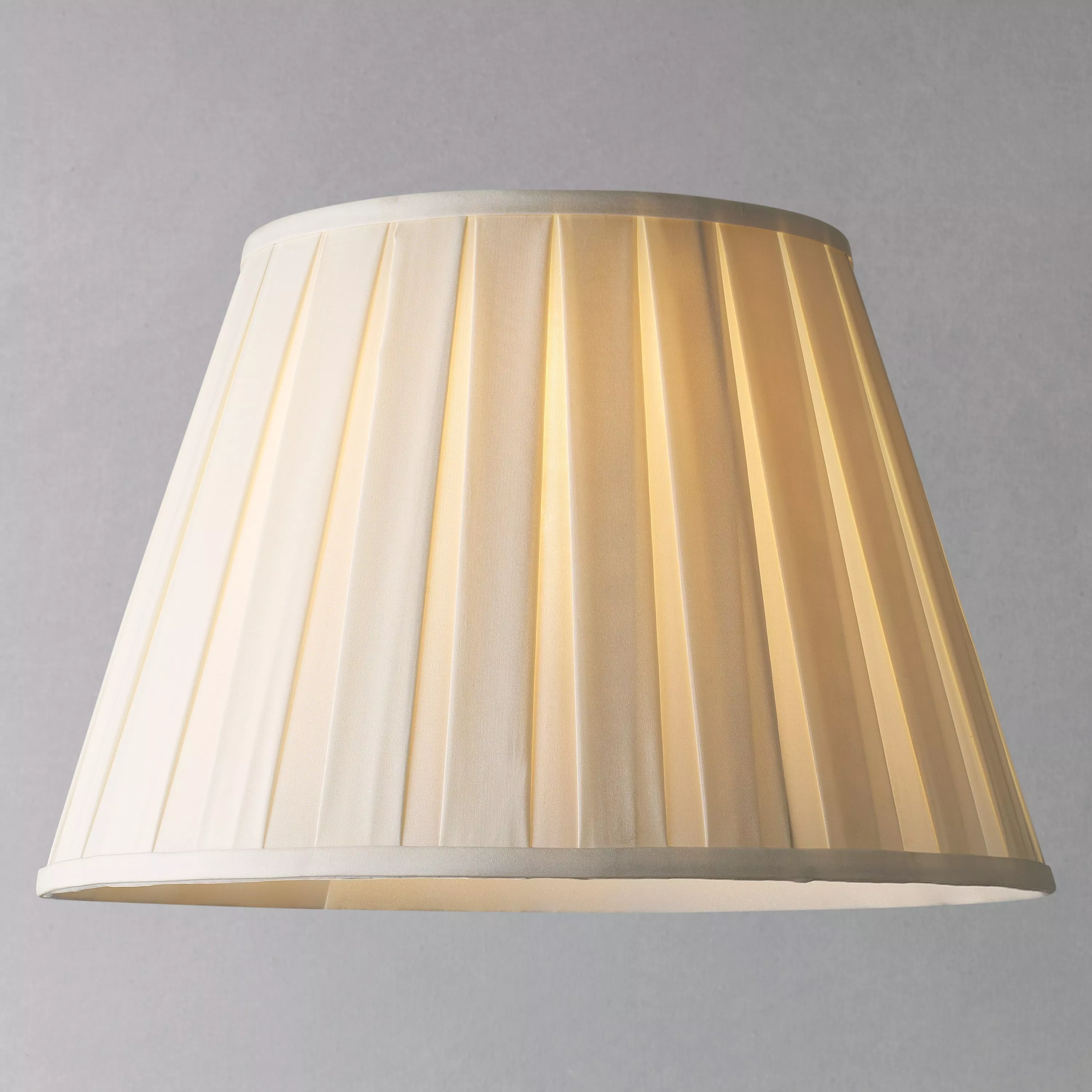 Made from a high-quality, medium-weight Dupiono silk, our Oratorio lampshade is suitable for both ceiling lights and lamp bases. Its tapered shape features wide pleat detailing with a crepe trim at the top and bottom, and it's lined in the same colour to enhance a warm and concentrated glow of light. The silk has been formed from a plain weave, where two cocoons naturally adjoined. Thanks to this natural design, any textural irregularities are characteristic of its closely weaved construction.