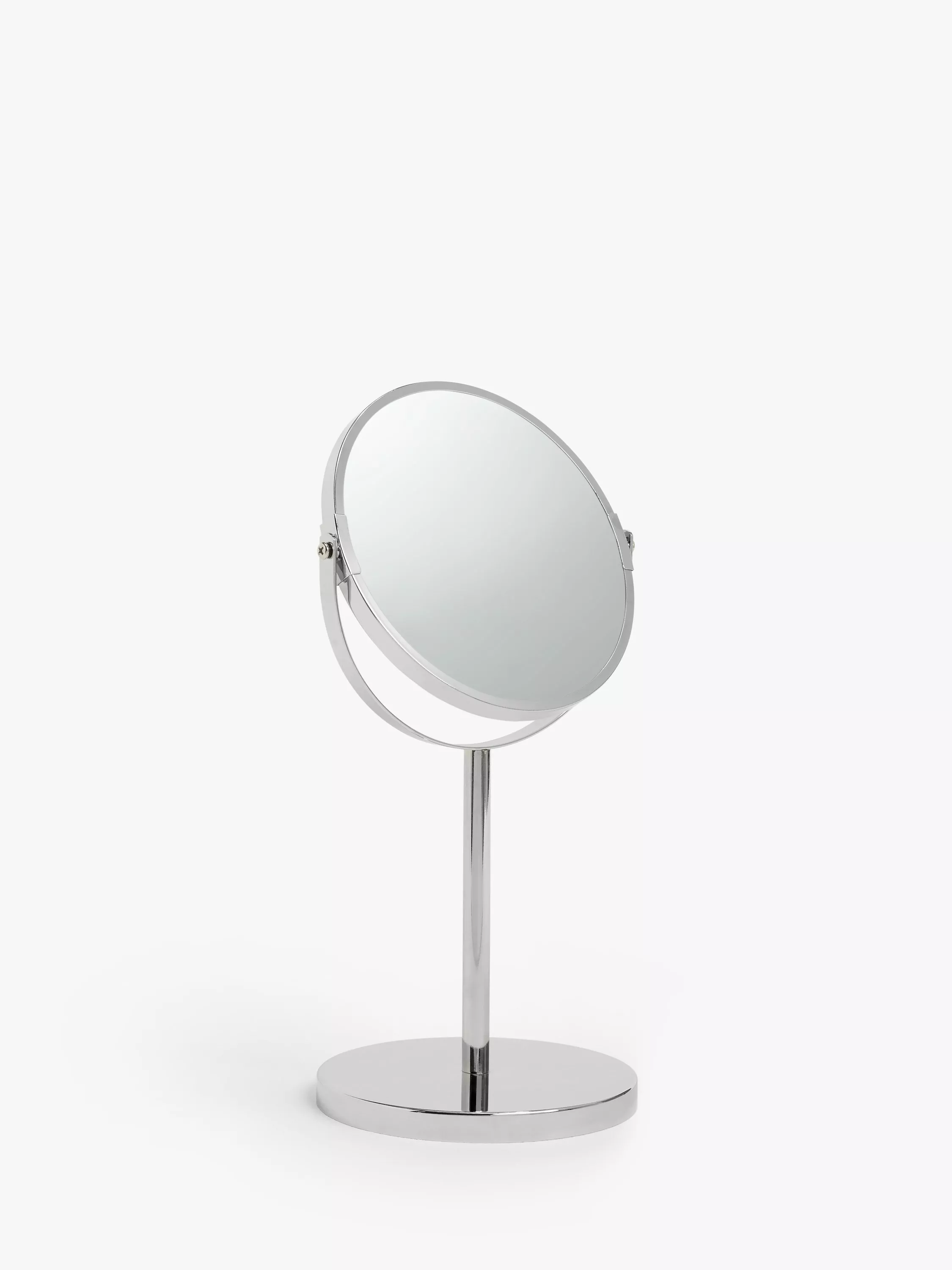 A freestanding pedestal mirror with 2x magnification on one side and 1x magnification on the other.