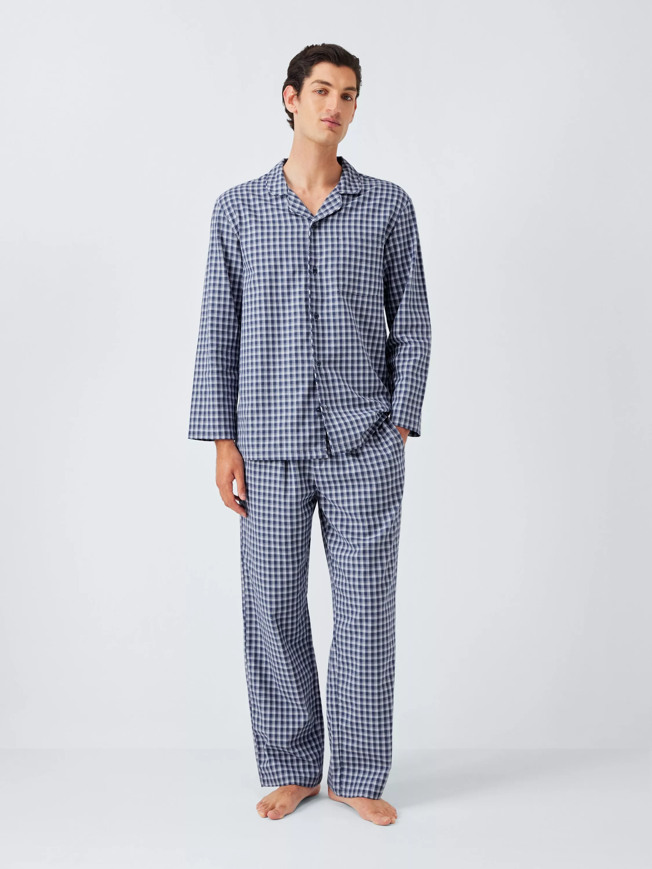 Our organic cotton pyjama set ensures a comfy night's rest. With a brushed twill gingham check, the shirt has a five button front and a patch pocket, with fabric piping. The trousers have an elasticated waist and side-seam pockets.