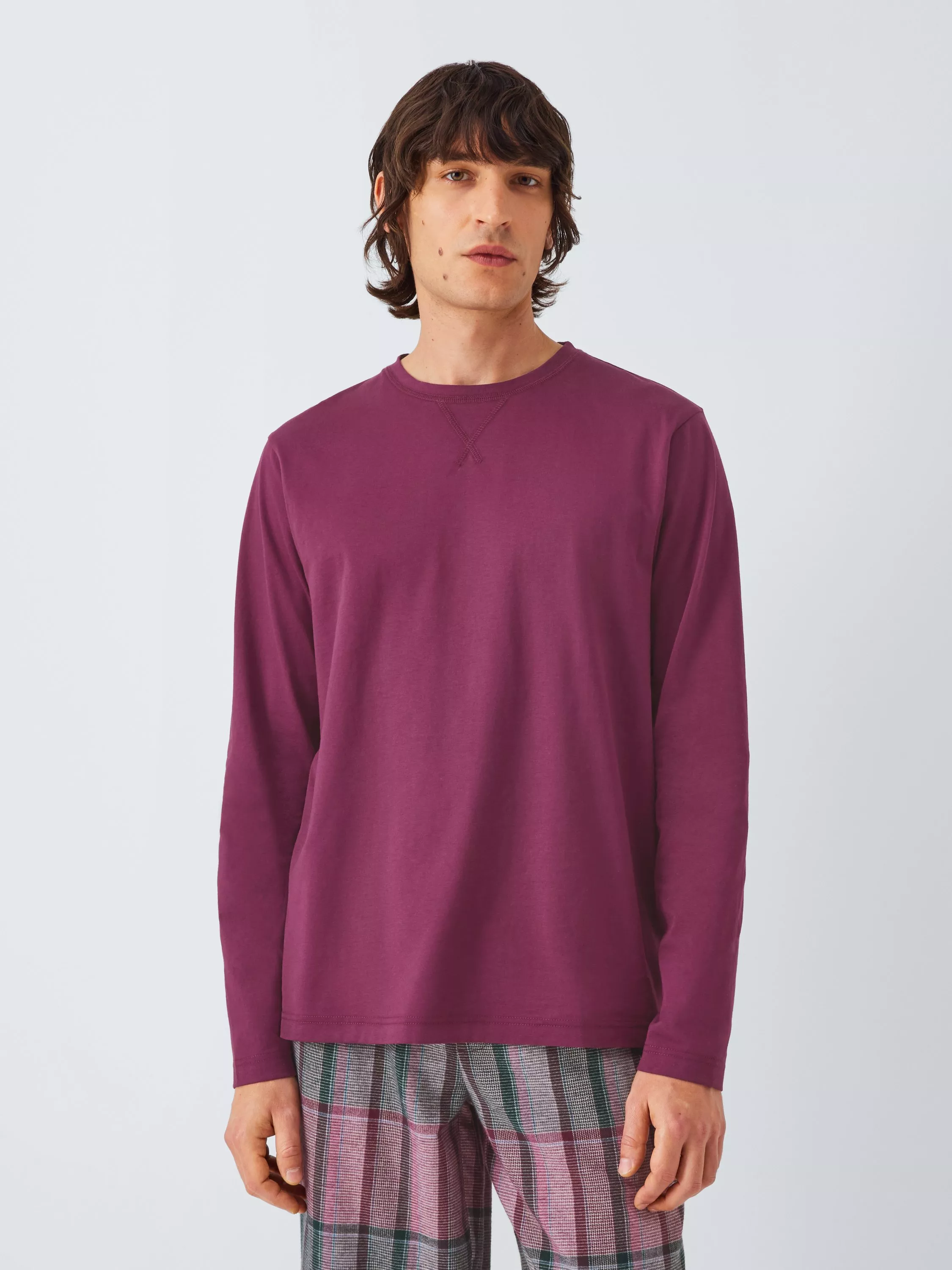 Crafted entirely from rich organic cotton, our pj set features a crew neck and long sleeve top with matching checked trousers that secure with a drawstring waistband. Ideal for winding down, waking up, and lazy days.