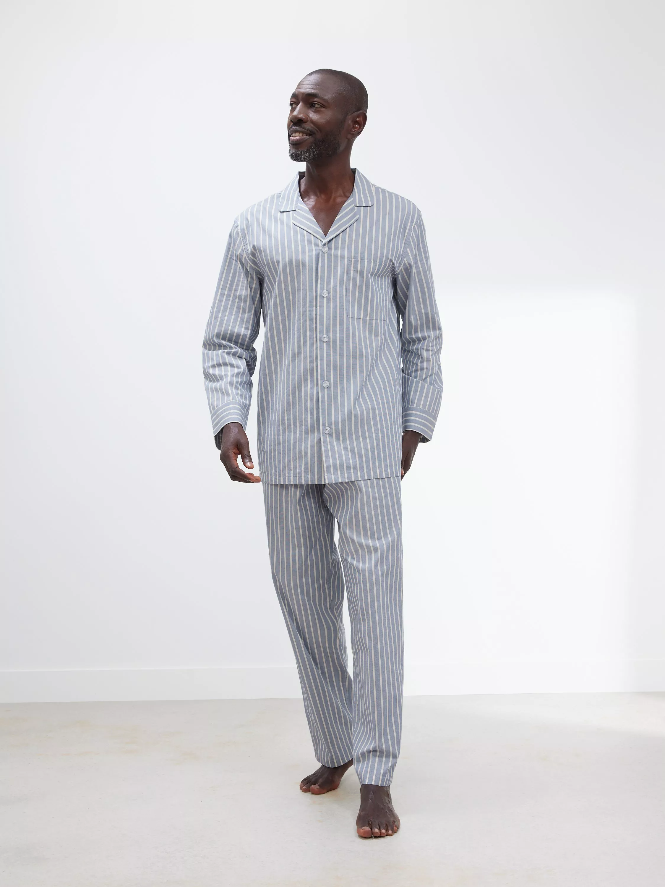 When it comes down to old tees and lounge pants that have been lying in your drawer for years, you know it's time to upgrade your night time uniform. Woven from 100% organic cotton for a wonderfully soft and breathable fit, this long sleeve pyjama set comes in a classic stripe poplin fabric. With one chest patch pocket, the shirt buttons down the front while the matching trousers are designed with a centre front fly and rear patch pocket. Sleep and slumber in comfort.