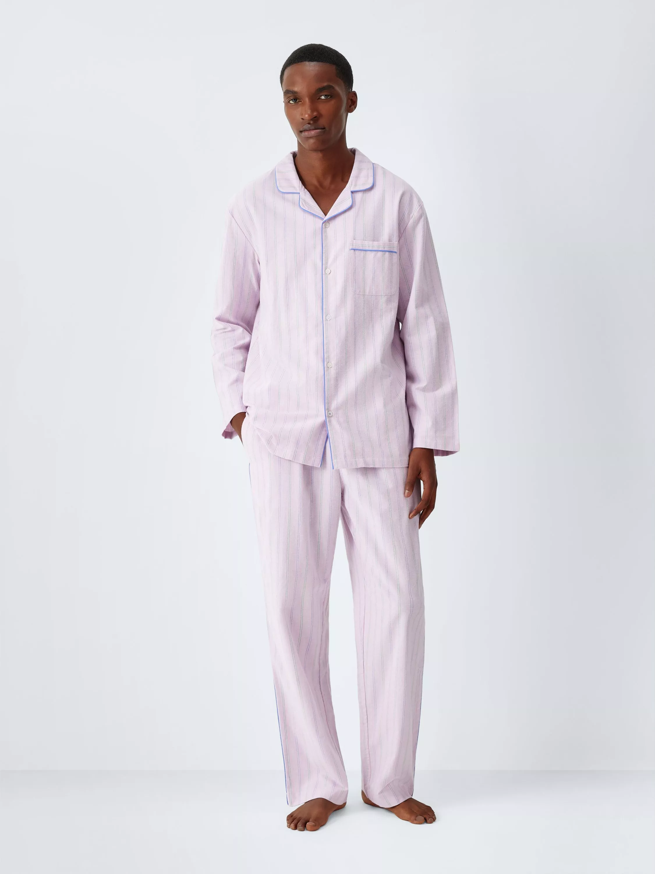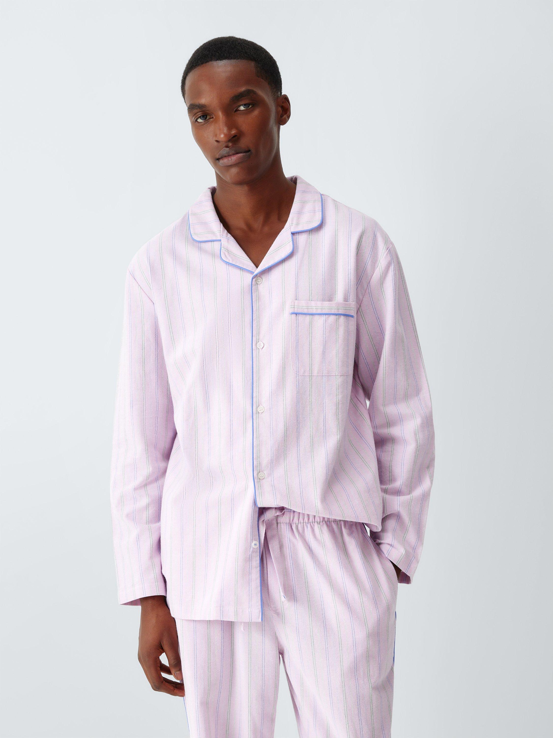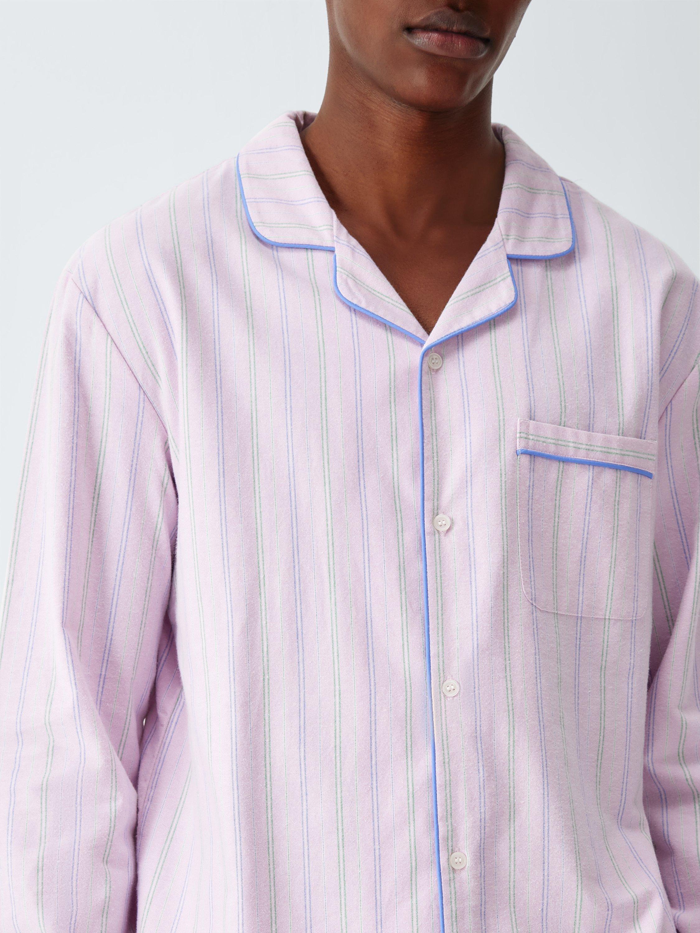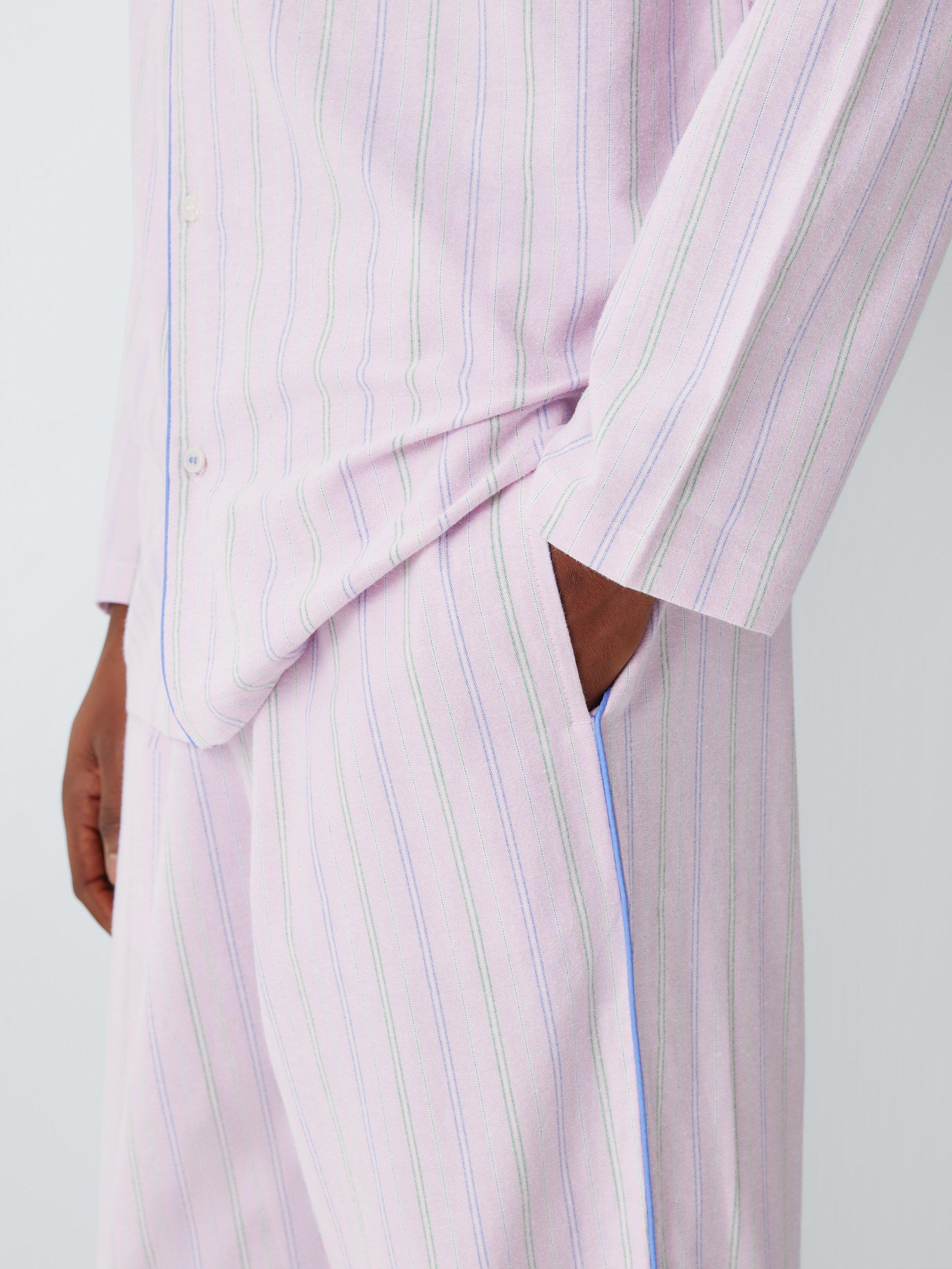 Crafted from organic cotton, this pyjama set features a brushed Oxford weave for soft comfort. The long-sleeved shirt includes a chest pocket and contrast stitching on the final buttonhole, while the trousers are designed with side pockets and a fabric drawcord for an adjustable fit. Subtle piping on the collar and seams provides a refined edge to this classic nightwear.