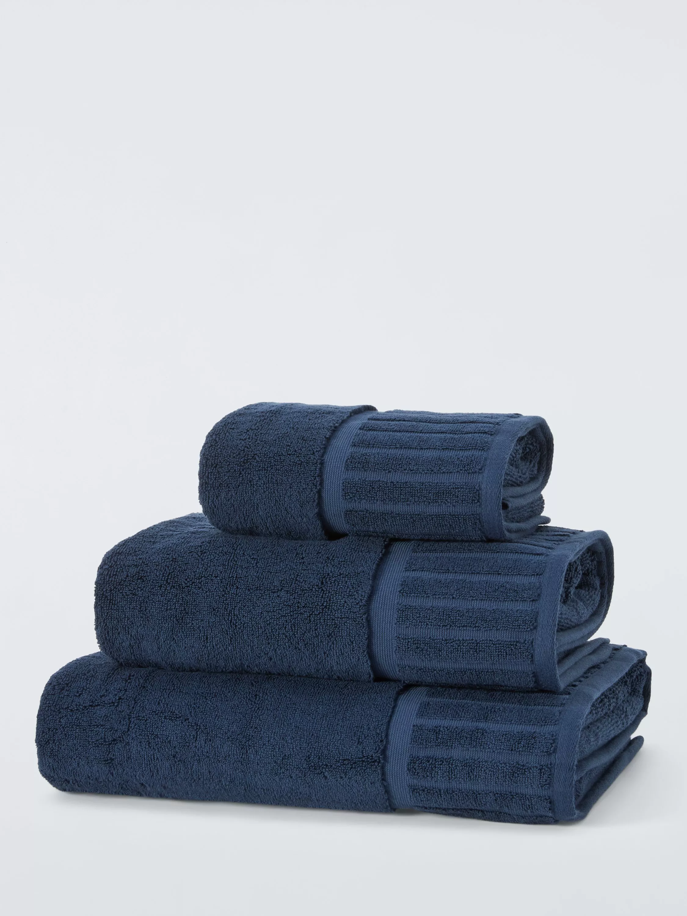 Plain-coloured, soft cotton towels with a broad, looped pile trim to change up your bathroom style.
