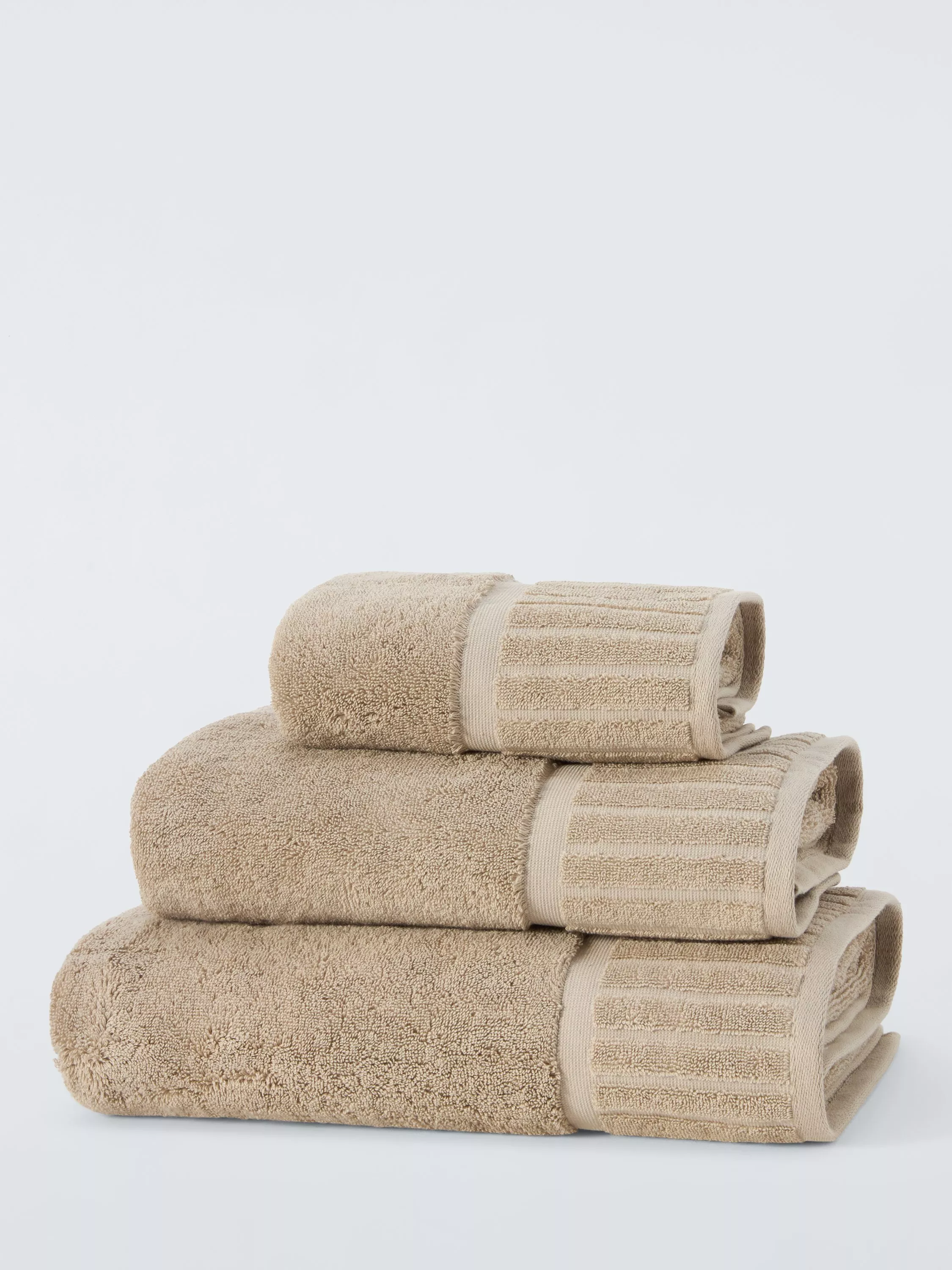 Plain-coloured, soft cotton towels with a broad, looped pile trim to change up your bathroom style.