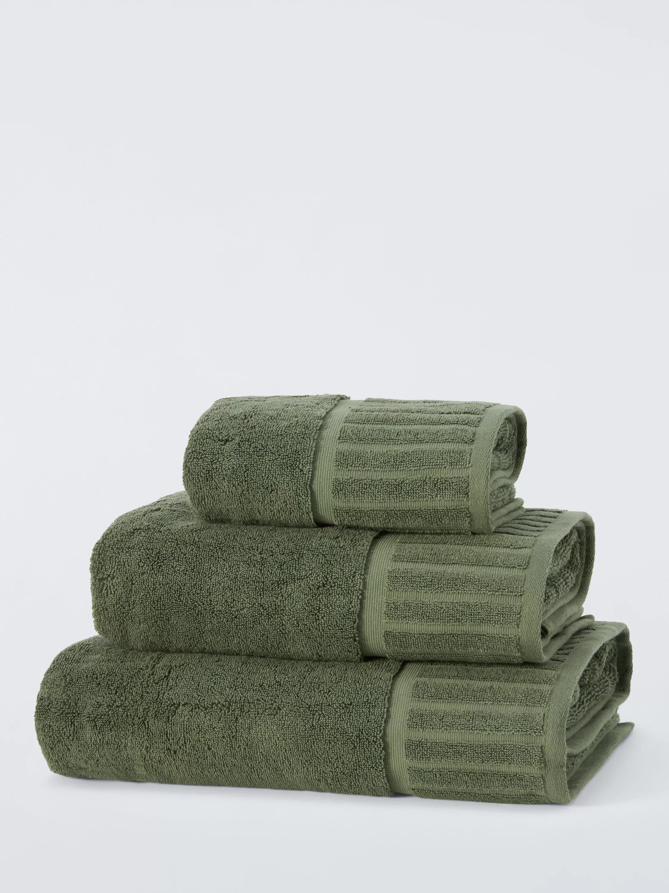 Plain-coloured, soft cotton towels with a broad, looped pile trim to change up your bathroom style.