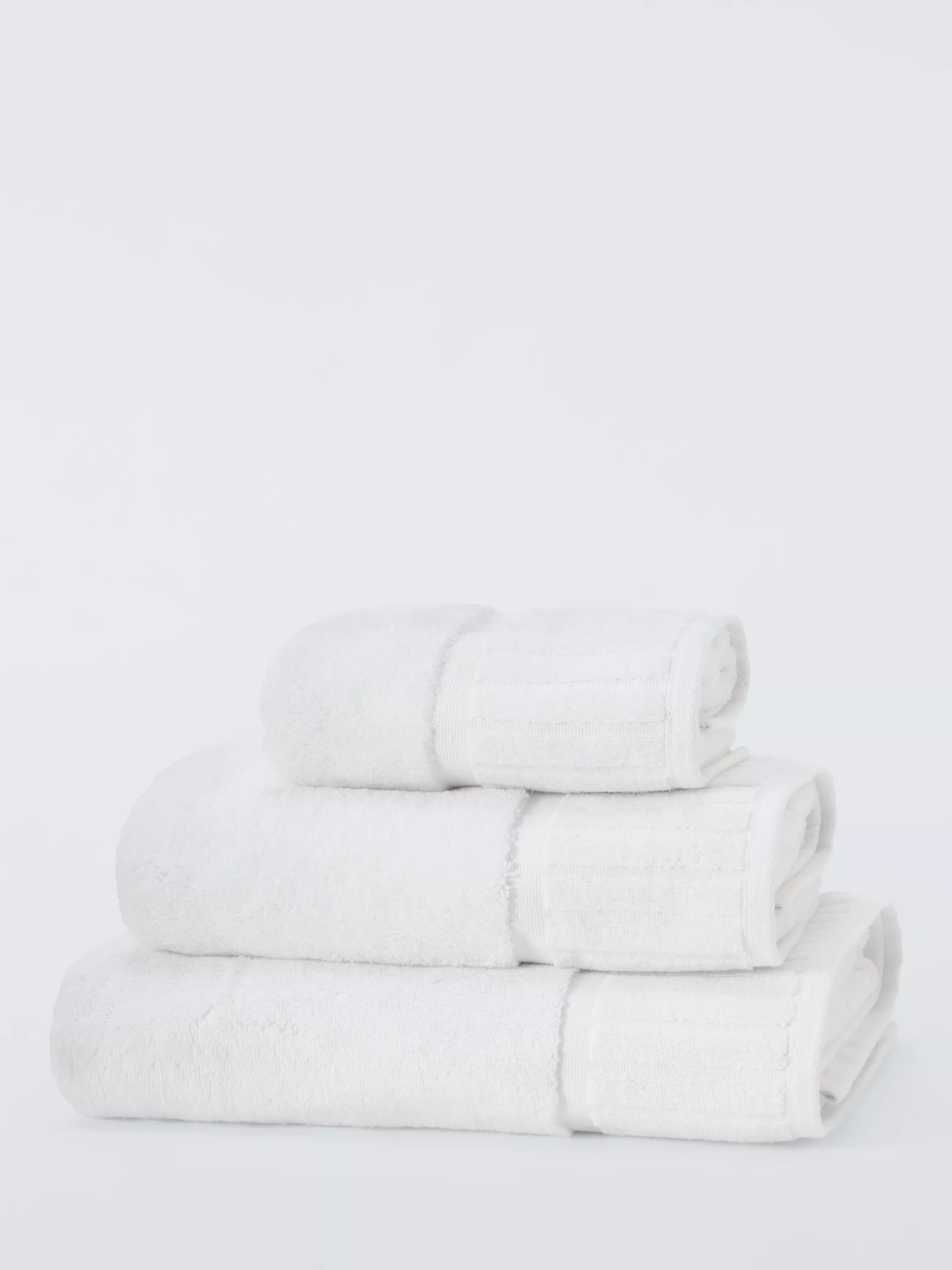 Plain-coloured, soft cotton towels with a broad, looped pile trim to change up your bathroom style.