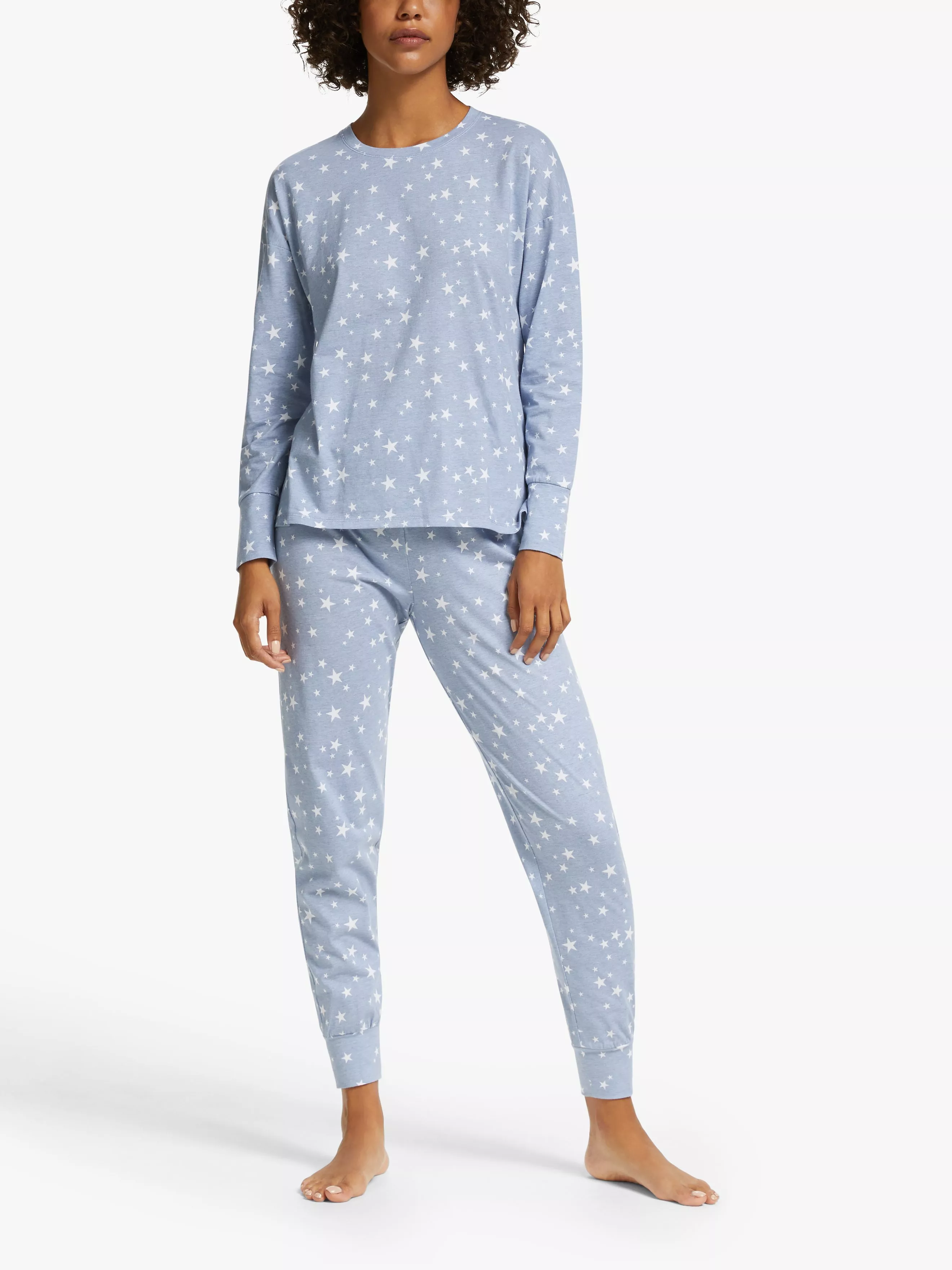 Printed with stars, our pyjamas are made from cotton jersey which is super-soft and breathable. We've designed this set for ultimate lounging in a relaxed cut with a simple t-shirt style top shaped with dropped shoulder sleeves and a stepped back hem, pairing it with jogger bottoms that taper at the ankle for a comfortably snug fit.