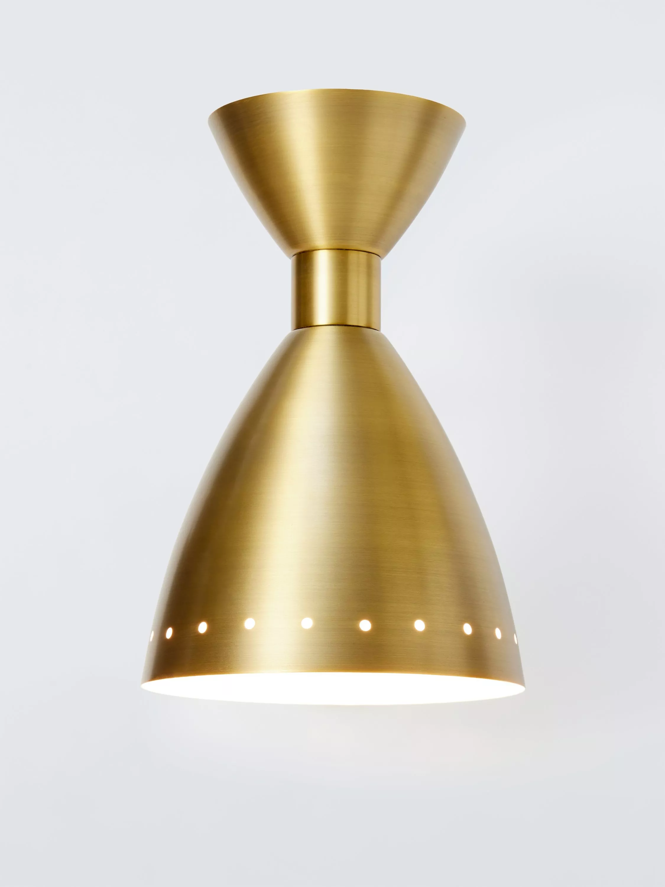 The lamp features a 5-inch diameter (12.5cm) metal base supporting an upwardly arcing antique brass stem. The metal cone-shaped shade is ringed with holes to add unique lighting patterns to your room.