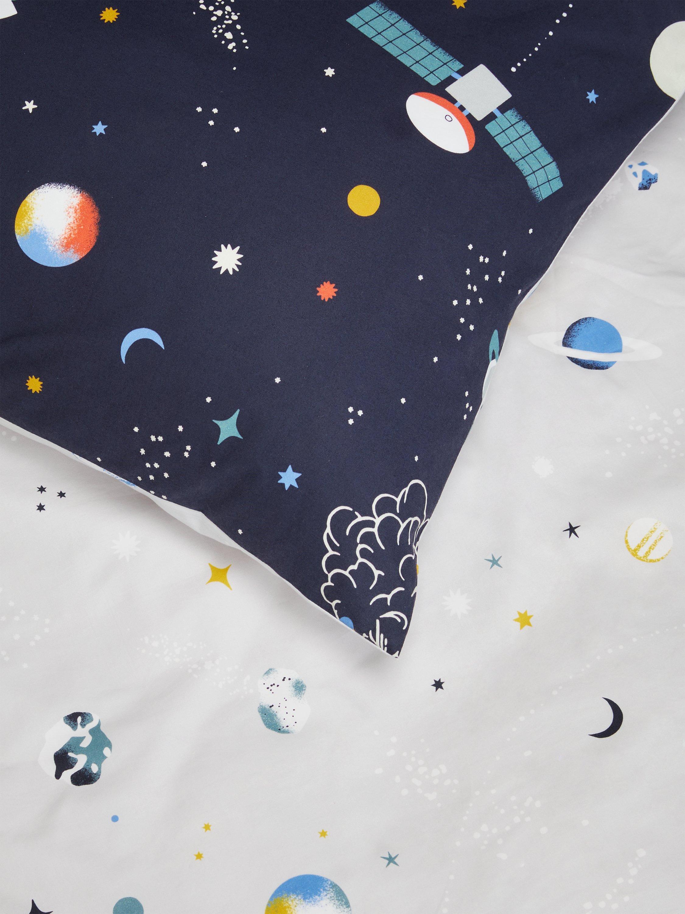 The reversible design gives you a choice of two Outer Space patterns. The single set comes with one standard pillowcase and the double set comes with two standard pillowcases.