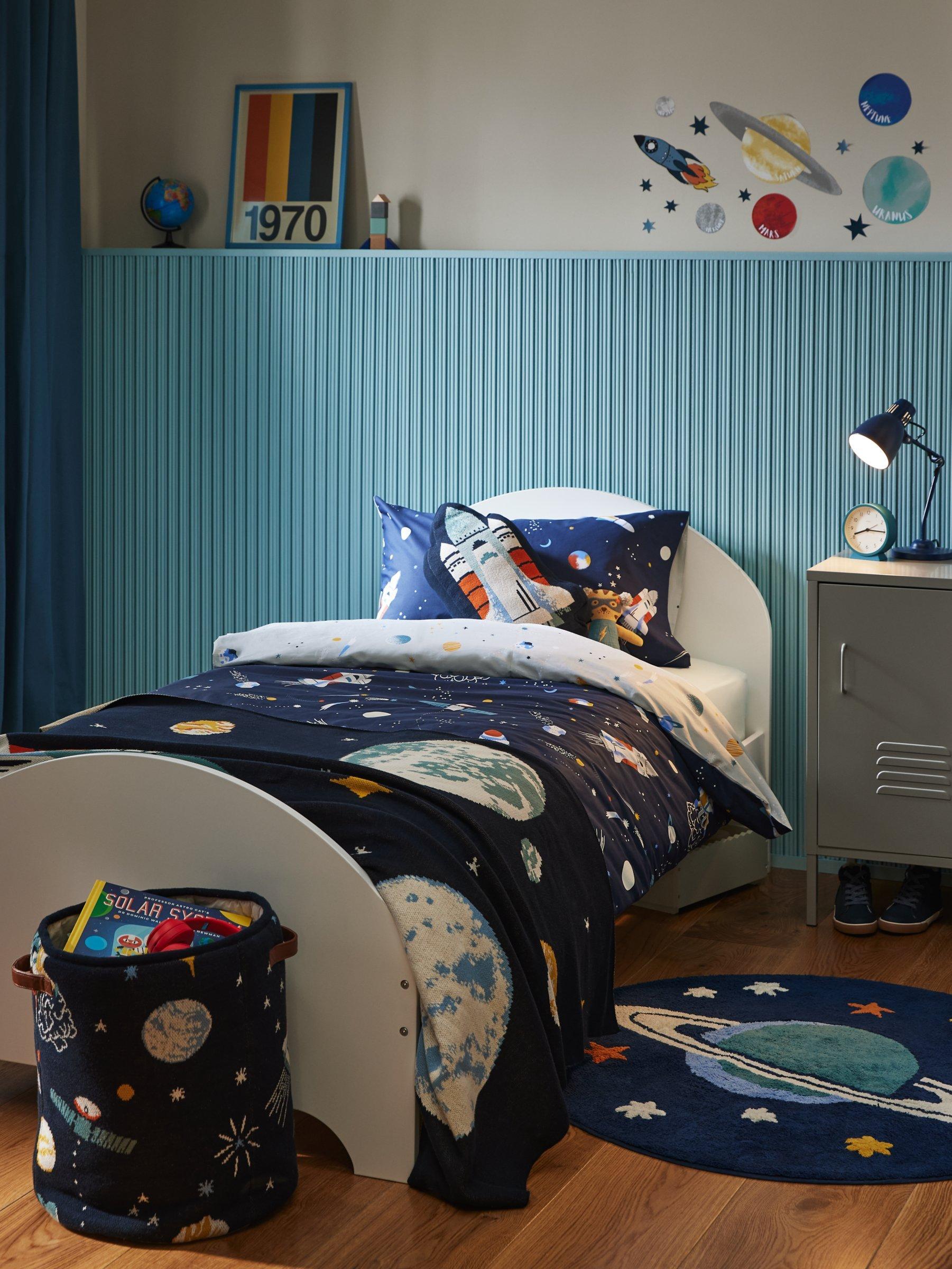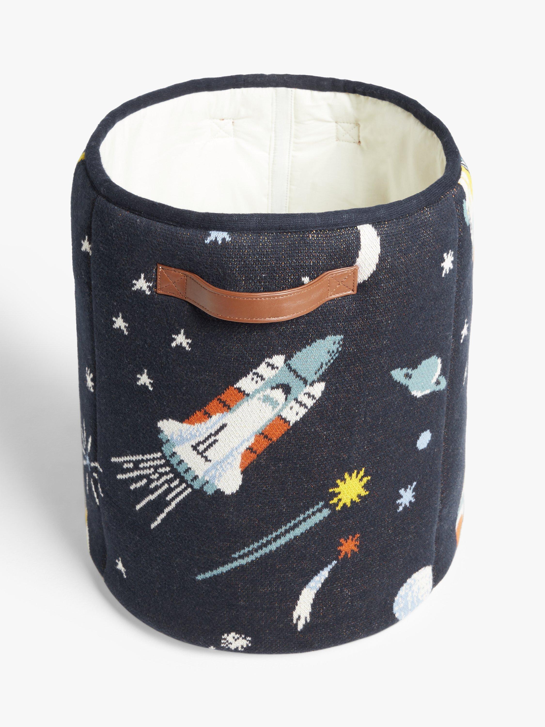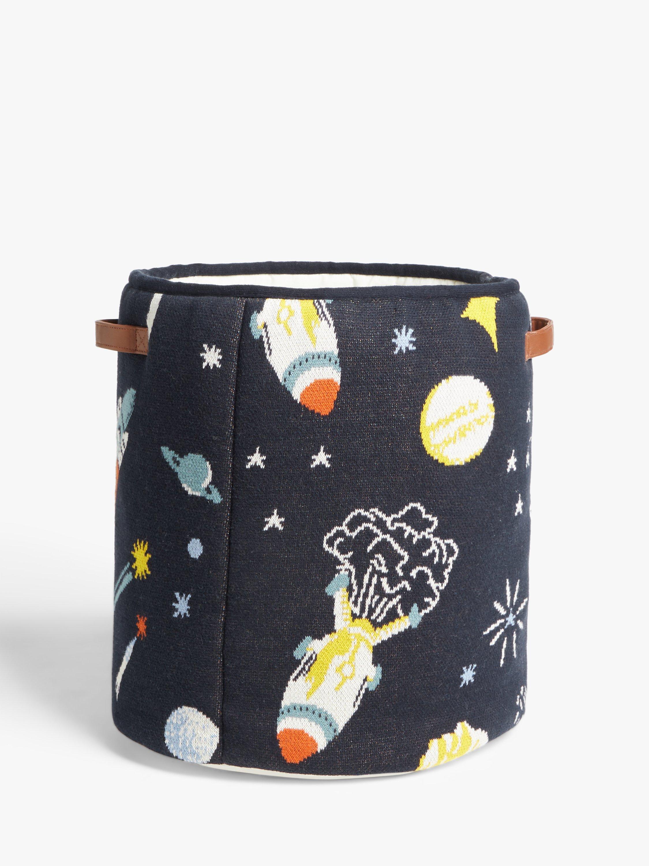 Extend storage options in their bedroom or playroom with this knitted storage basket from little home at John Lewis. Crafted from cotton and carefully designed with an out-of-this-world space theme, it is ideal for storing anything from cushions and throws to toys or laundry. Easy to transport around the house thanks to faux-leather handles, this versatile piece will lend a playful space accent to their...space.