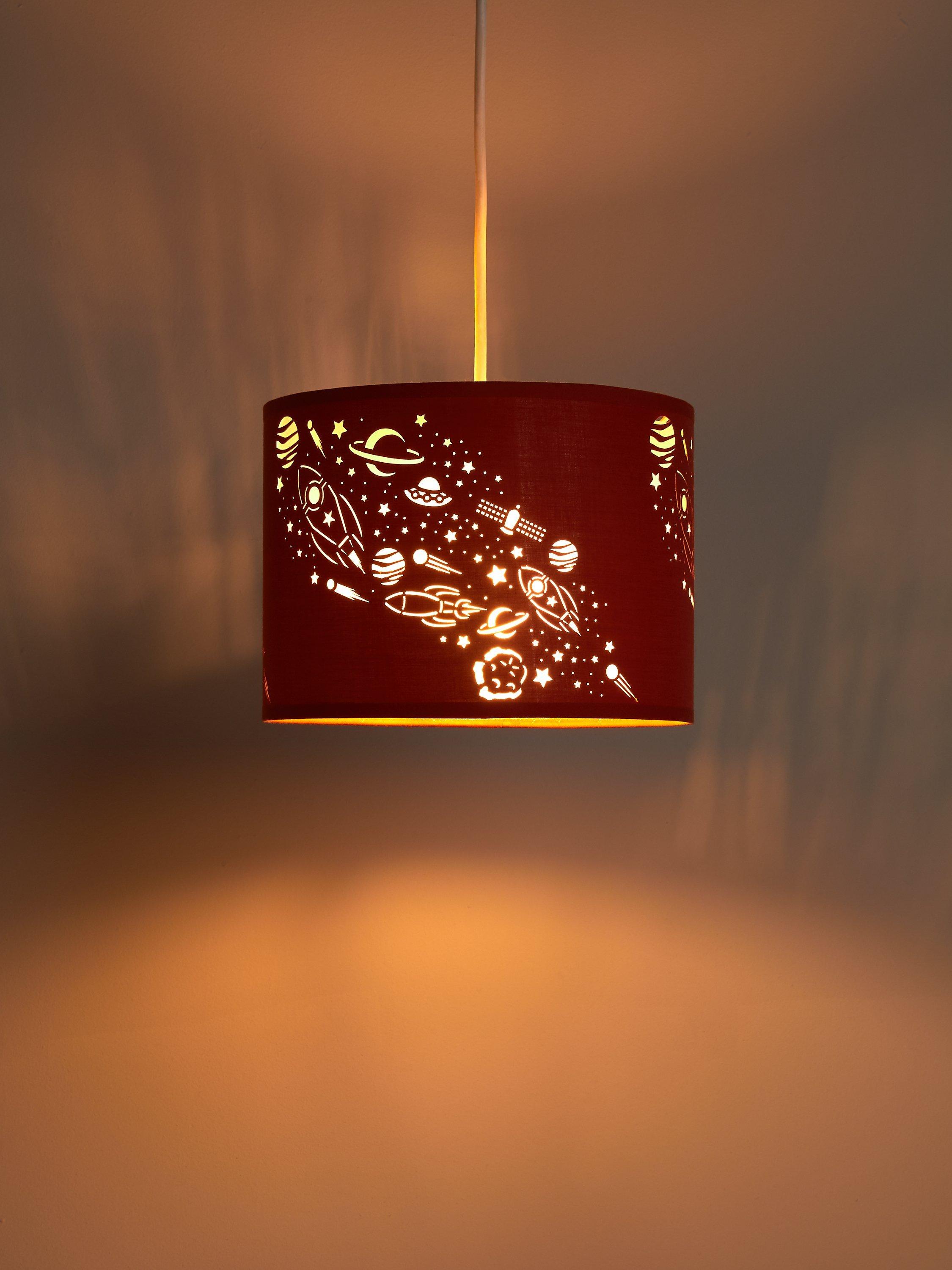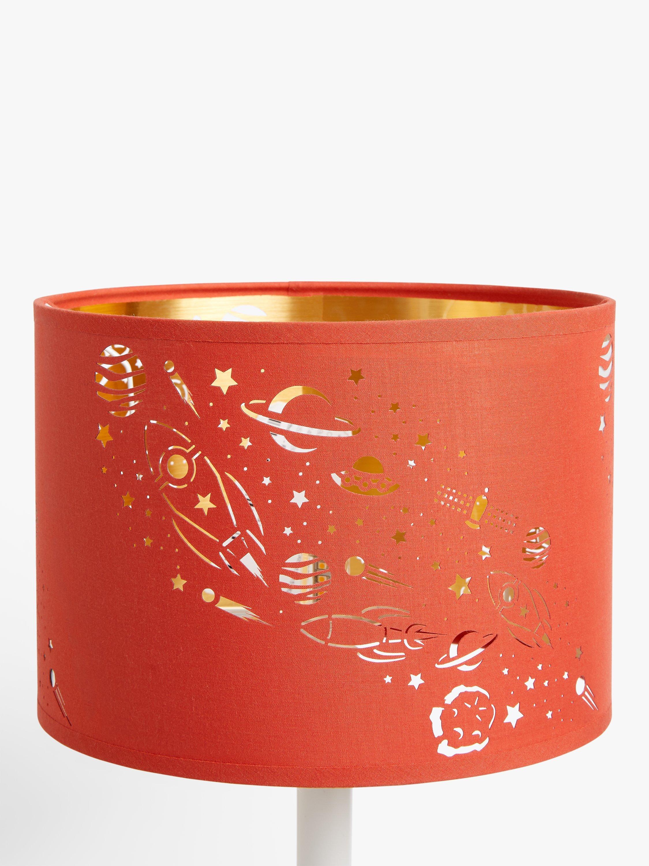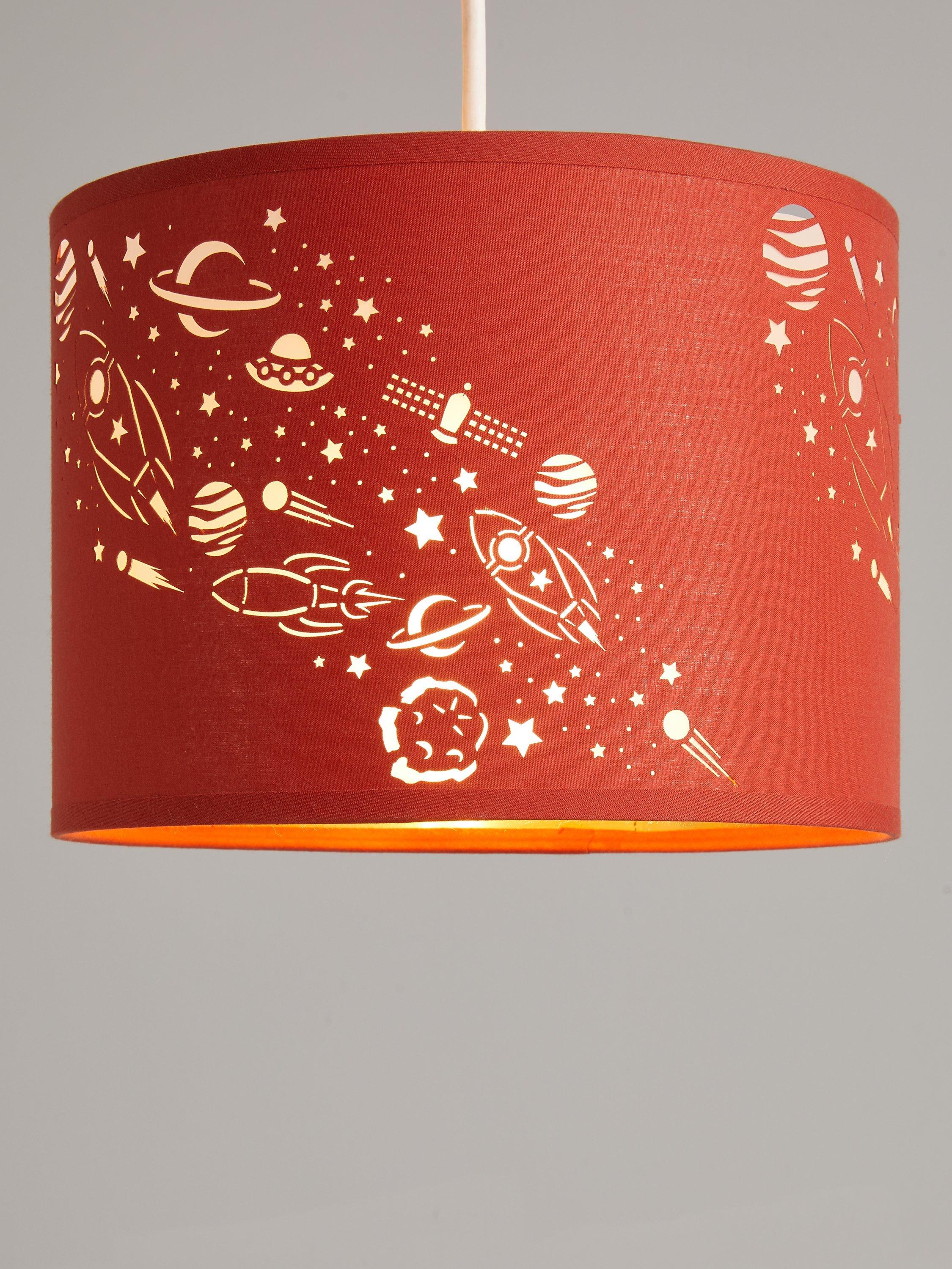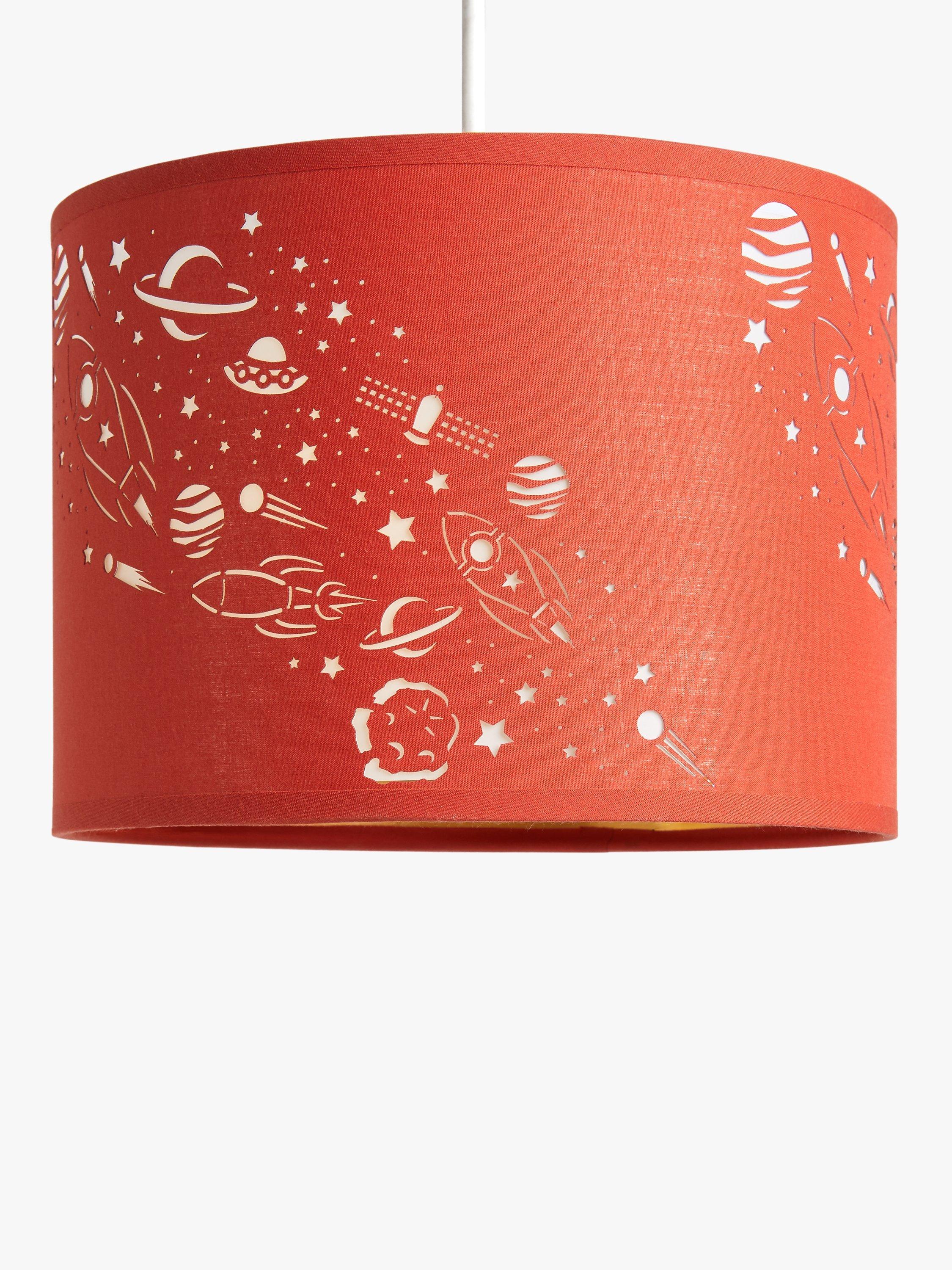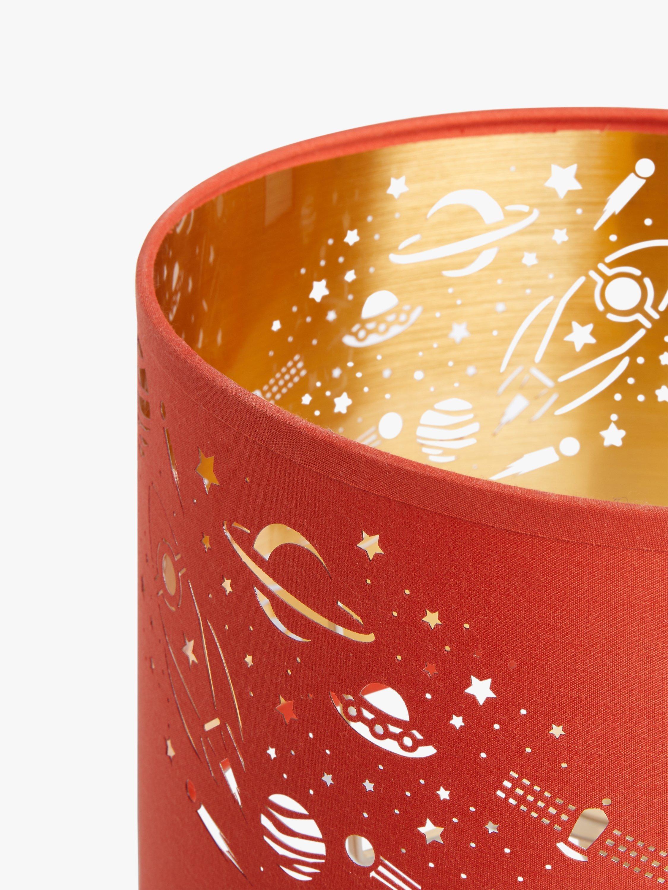 This multi-purpose lampshade features a laser cut pattern of rockets, stars and even asteroids. Light spills through the pattern to create a striking, eye-catching effect on nearby walls. What's more, the metallic gold lining enhances a warm and vibrant wash of light. Thanks to a reversible gimble, it can be hung from a bulb holder or installed on a table or floor lamp base.