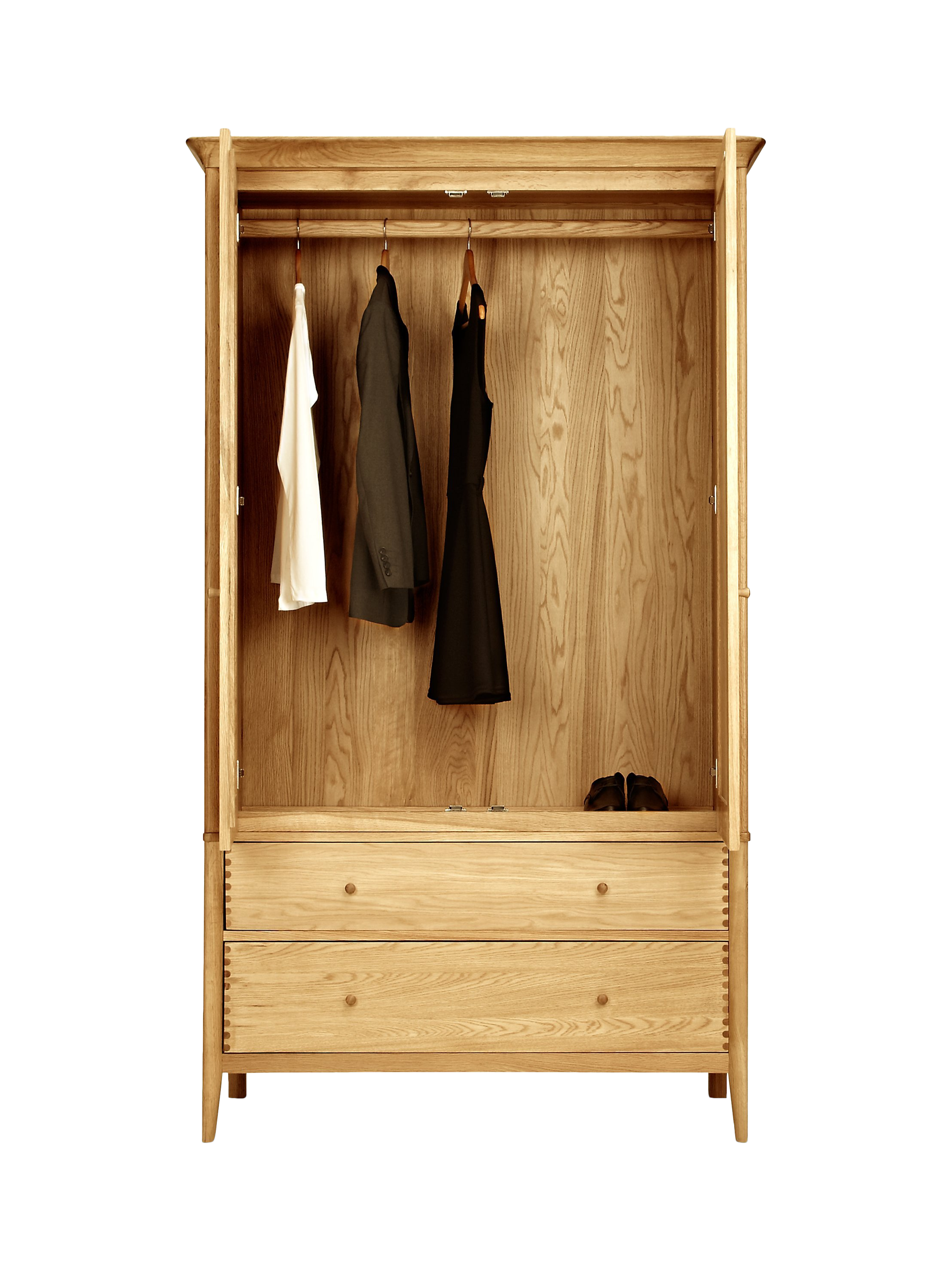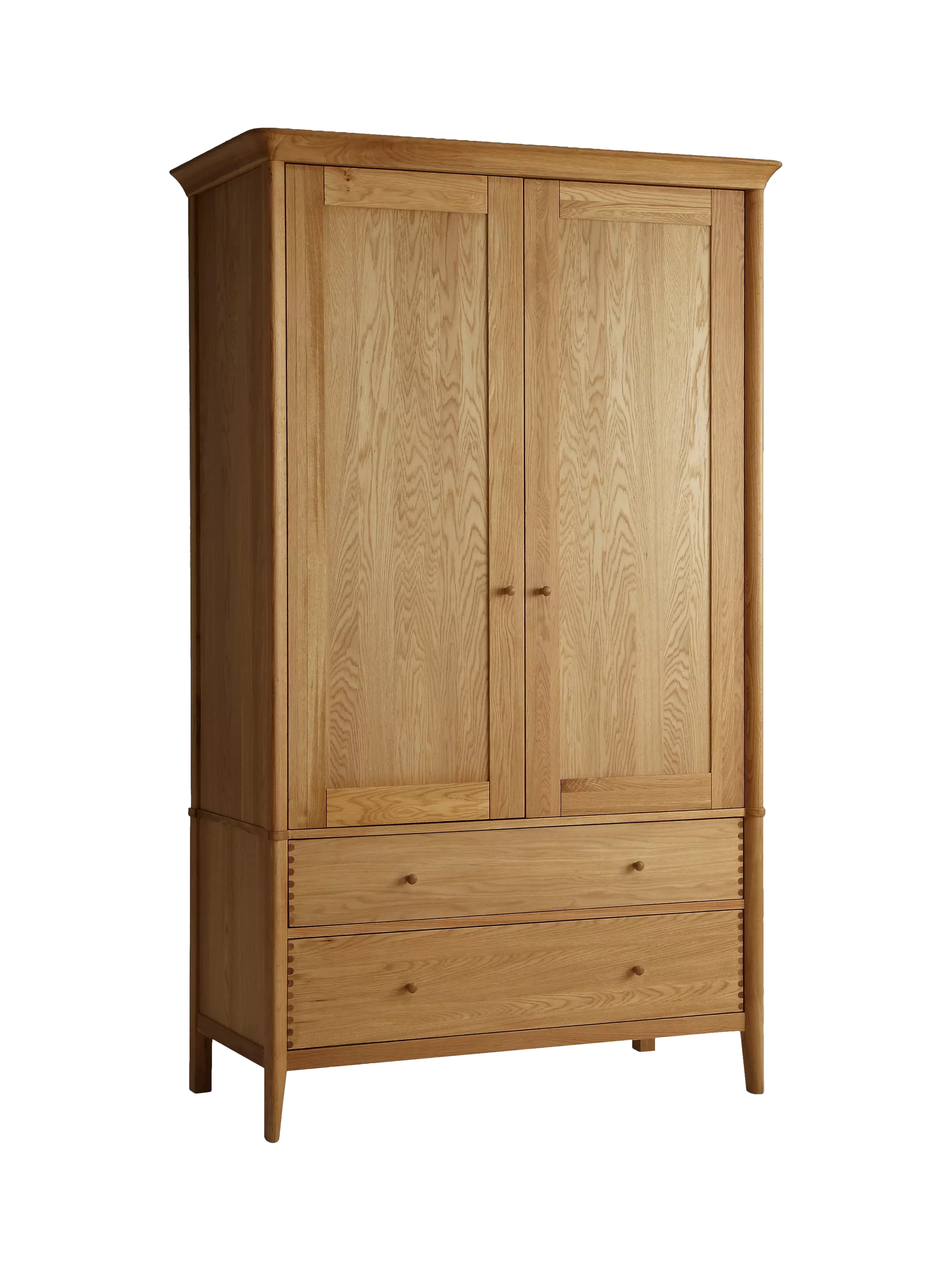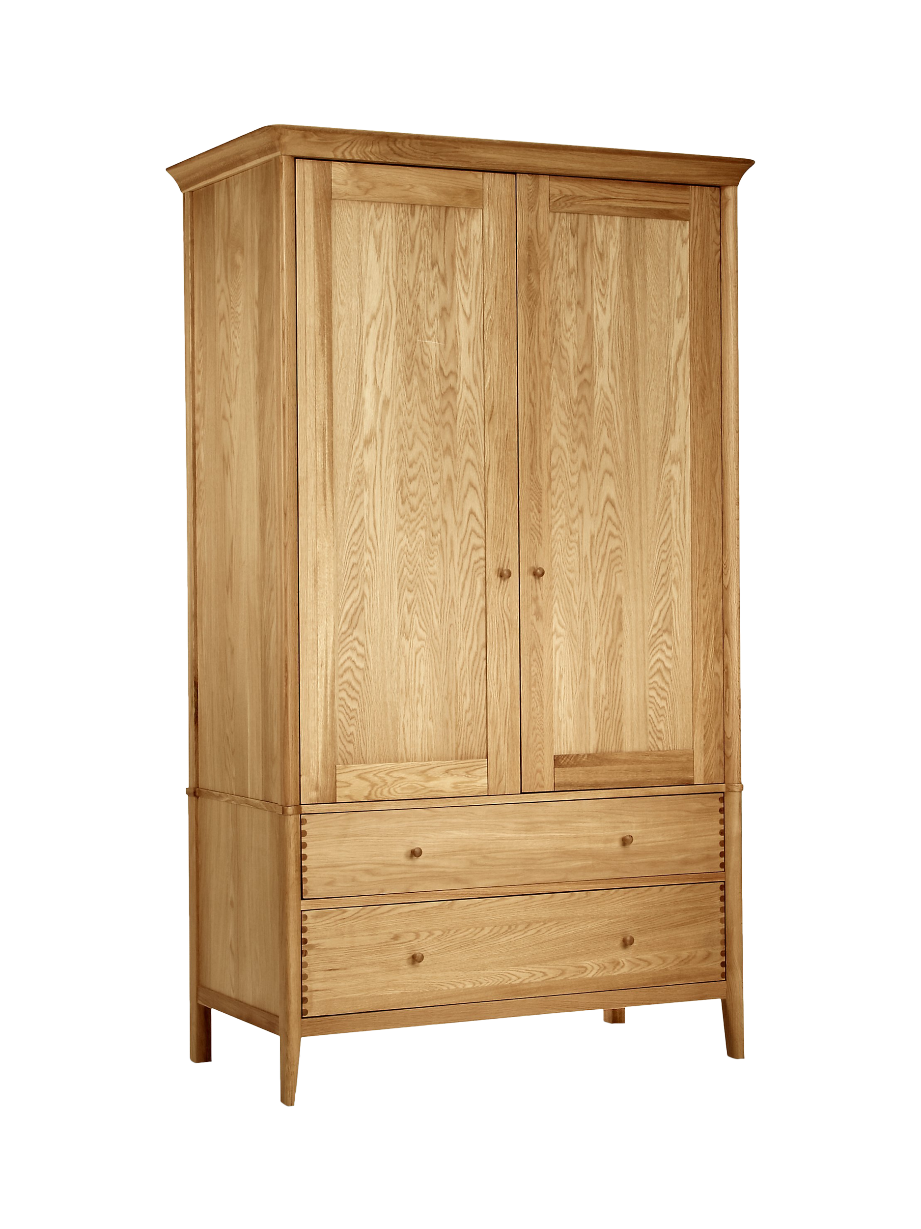 The dovetail joints and smooth rounded edges highlight the impressive construction of this spacious double wardrobe, which we've made from a combination of solid European oak and oak veneers. Inside, there's a wooden hanging rail and there are two drawers below the cupboard section for additional storage. We've kept the finish completely natural to showcase the unique wood grain, so you can furnish your bedroom with a timeless piece that's built to last.