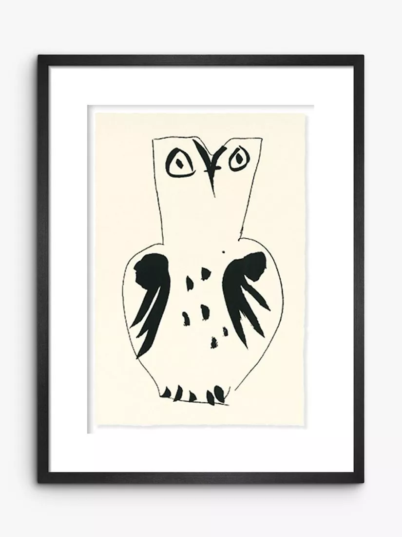 A reproduction print of Picasso's 'Chouette' (owl). Printed in the UK on 300gsm textured, hand-torn paper with a solid ash frame, hand-stained in black. It's glazed, float-mounted and ready to wall-mount with fittings at the back of the frame.