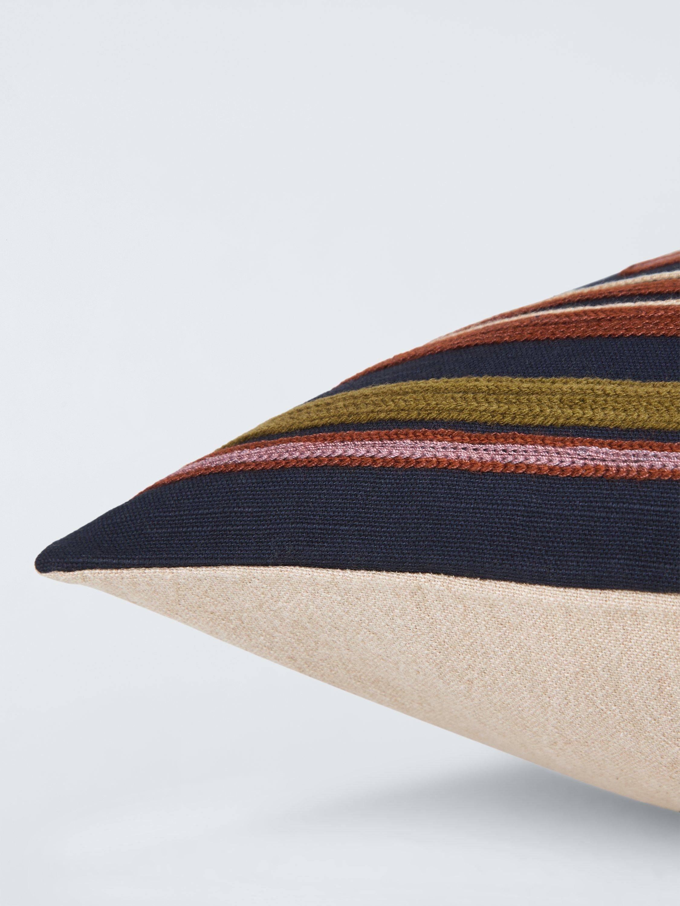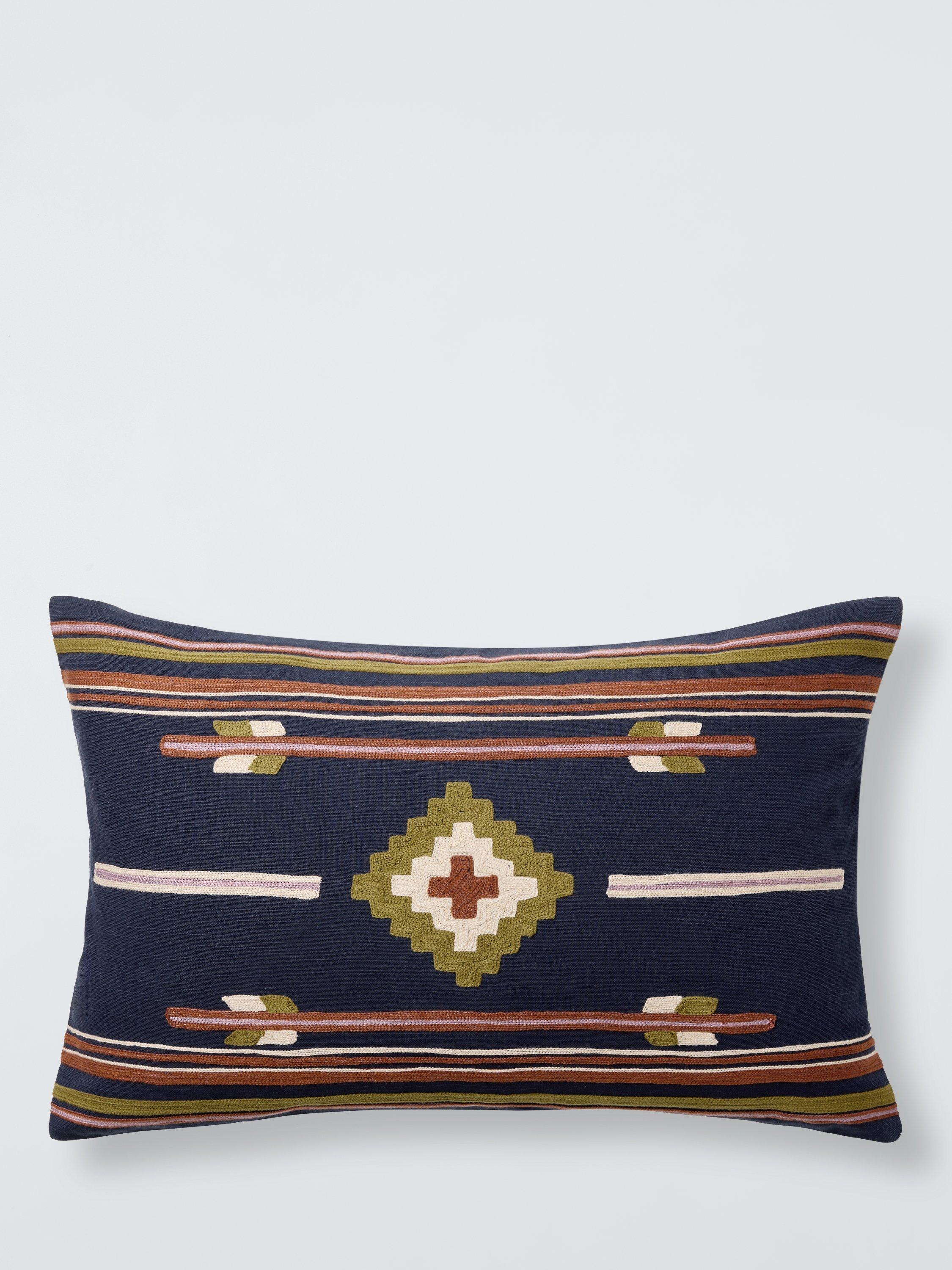 The embroidered geometric design of this cushion echoes Inca textile art.
