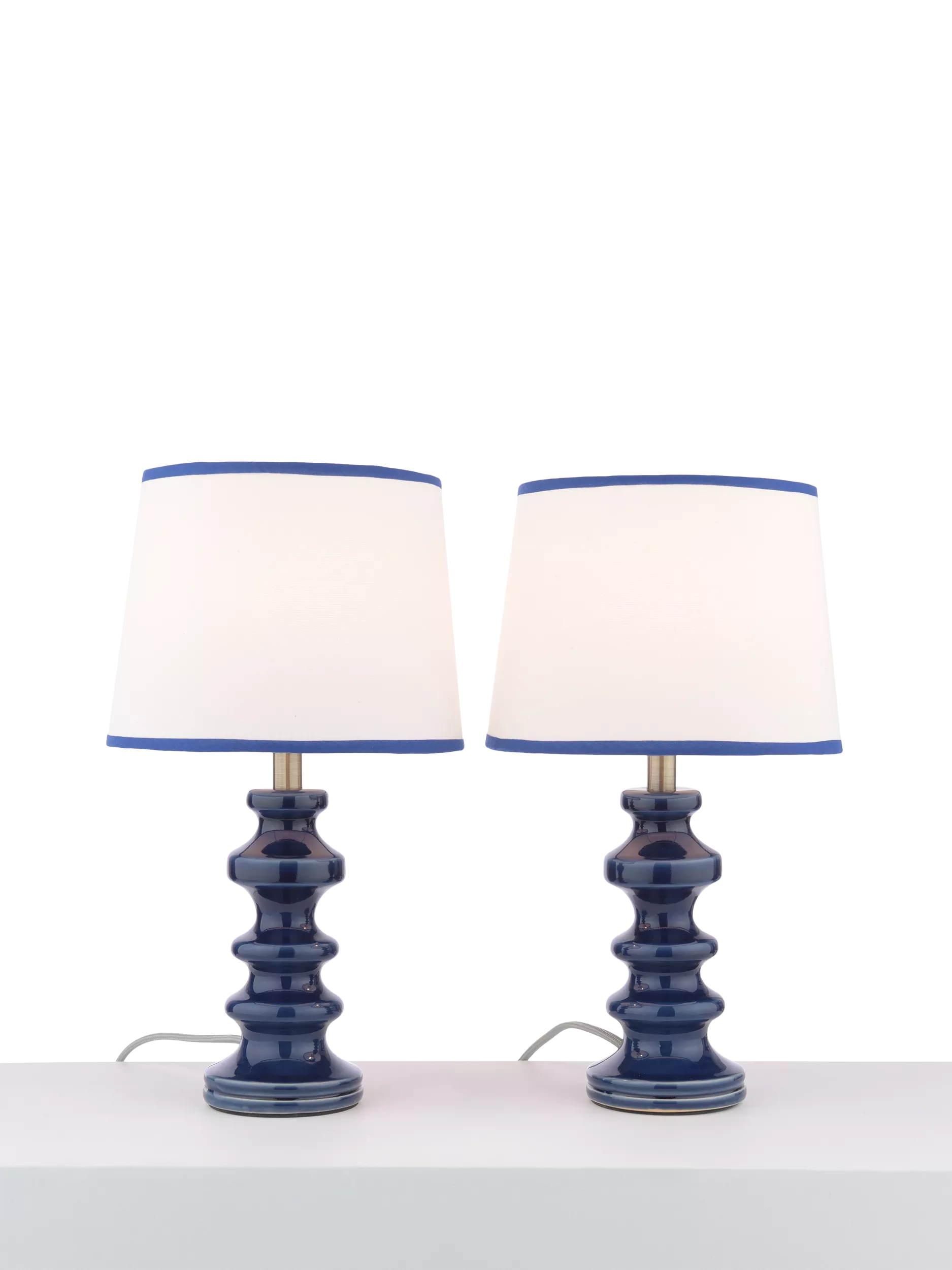 Pair of Pagoda table lamps. Create a warm ambience with our tiered rib ceramic Pagoda lamp in a rich glossy crackle finish, which highlights the detailing. Complete with a pleated woven fabric lampshade and contrasting trim.