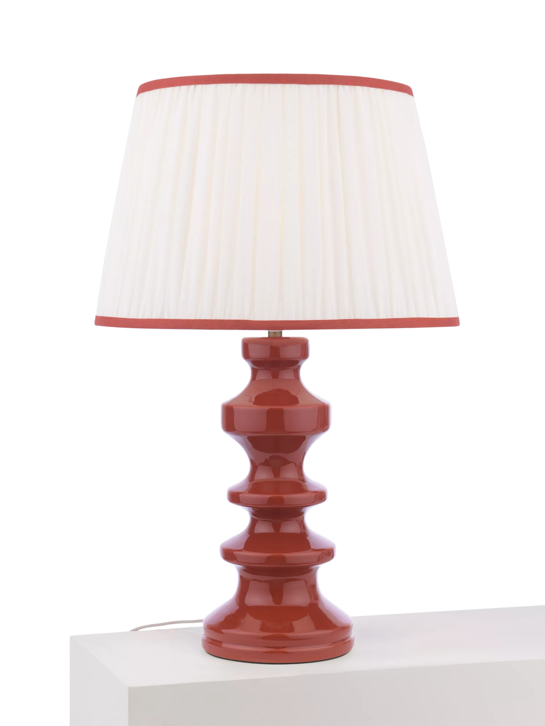 Create a warm ambience with our tiered rib ceramic table lamp in a rich glossy crackle finish which highlights the detailing. Complete with a pleated woven fabric lampshade and contrasting trim.