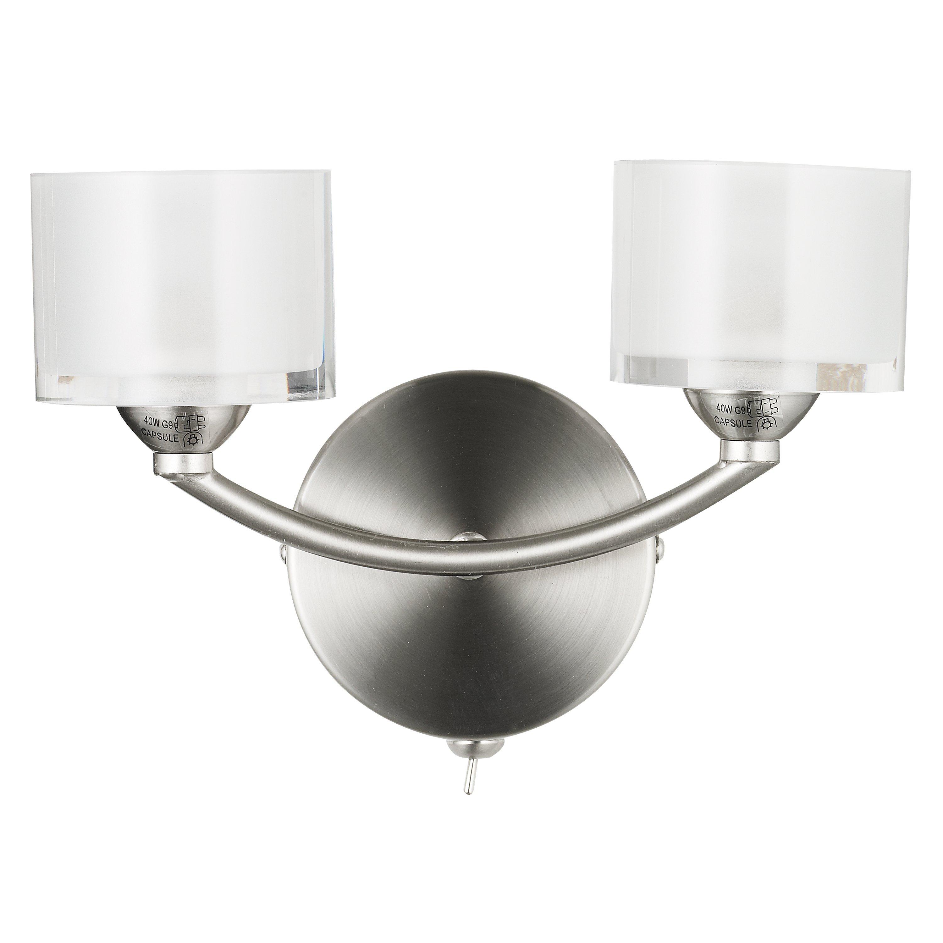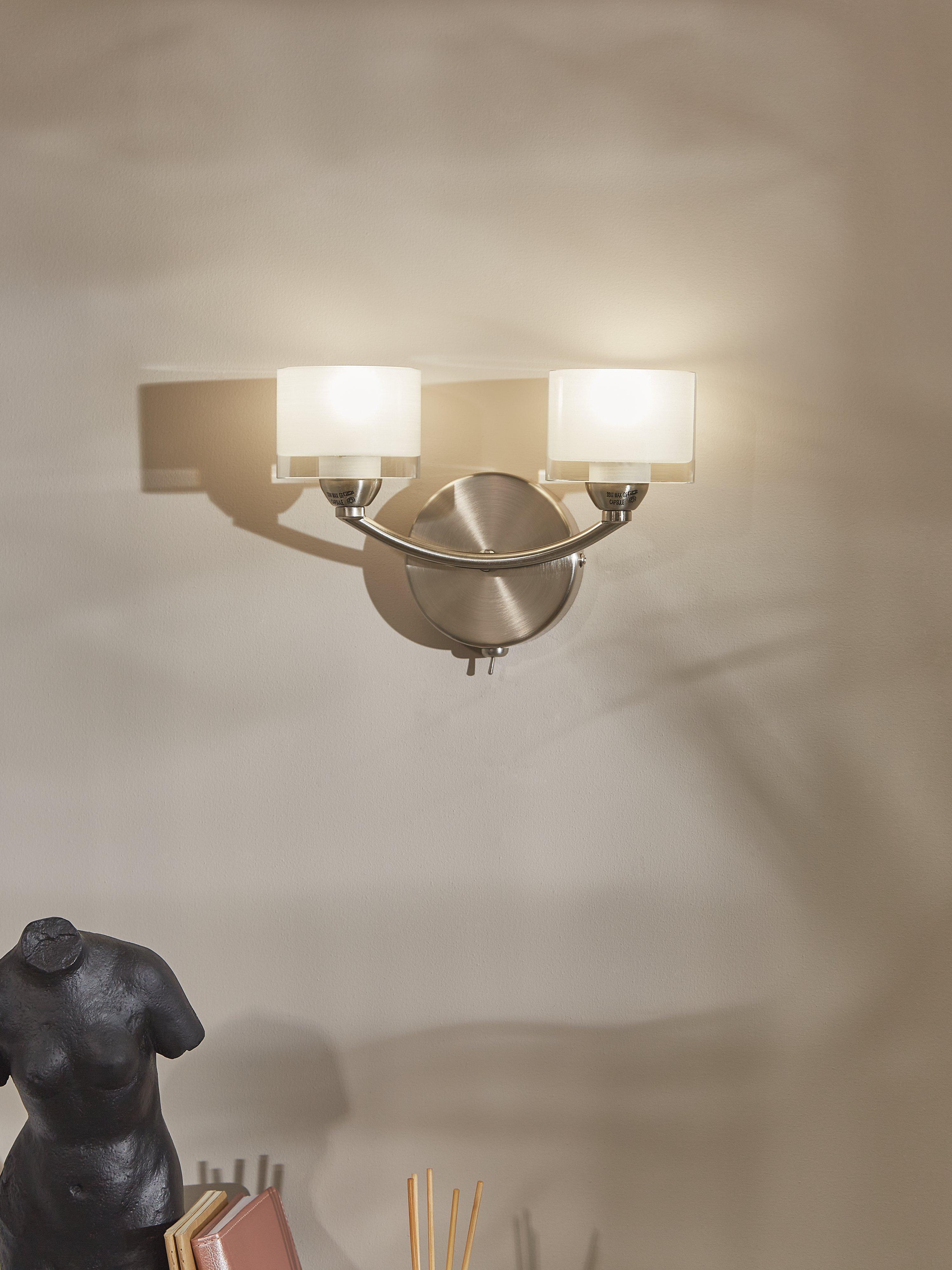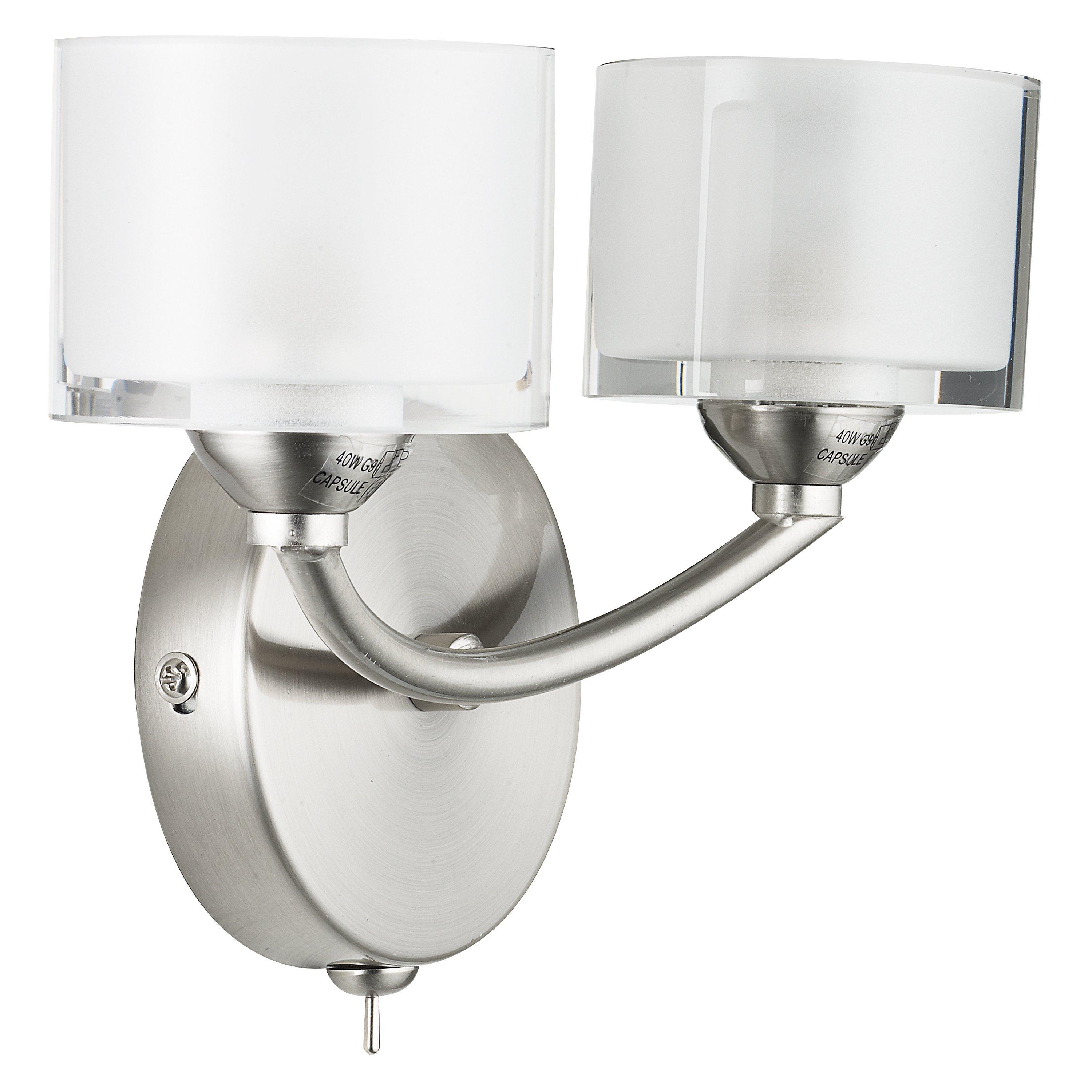 This double arm wall light combines a smart chrome fitting with two frosted glass shades. It will provide a warm glow of light up your wall and there's a toggle switch on the wall plate.