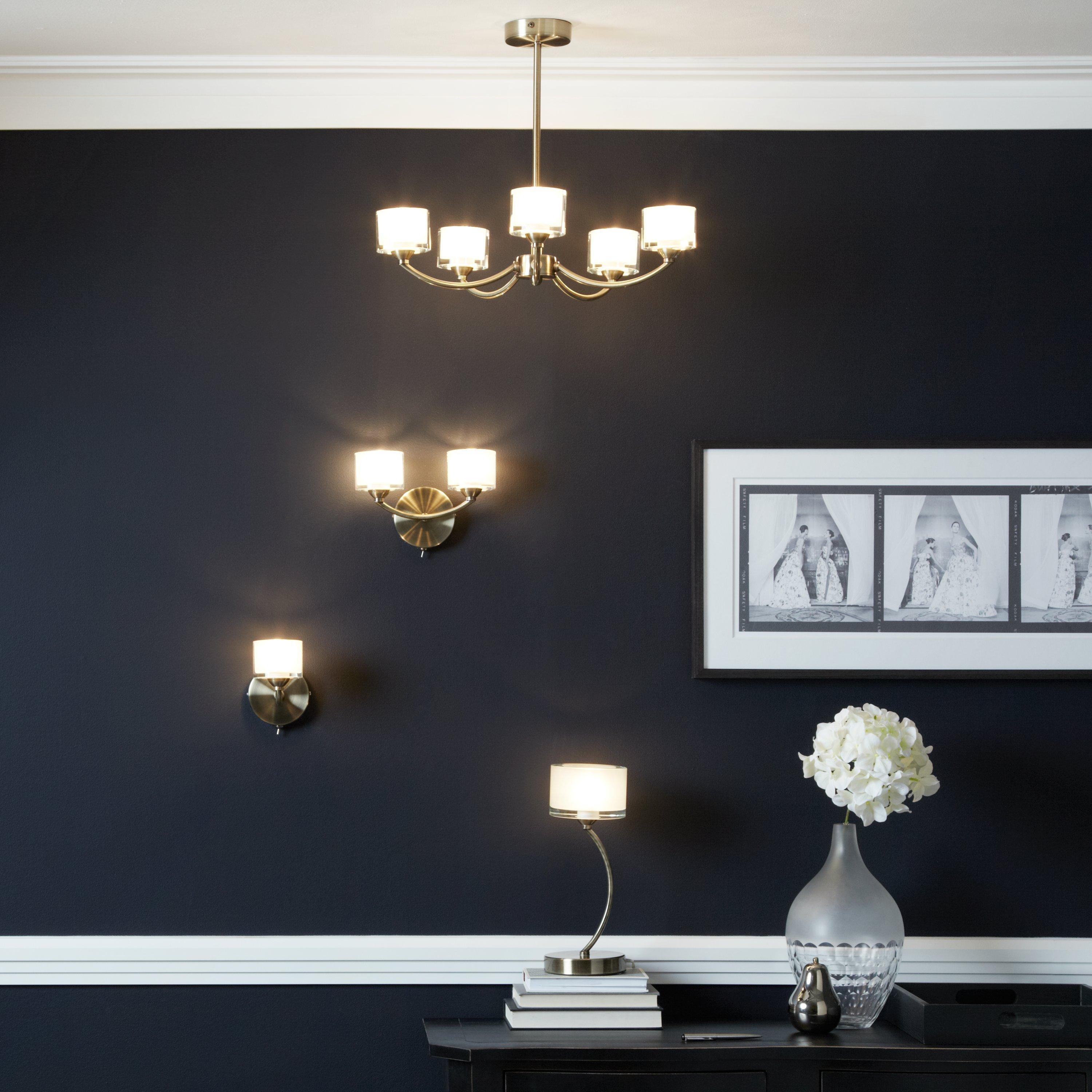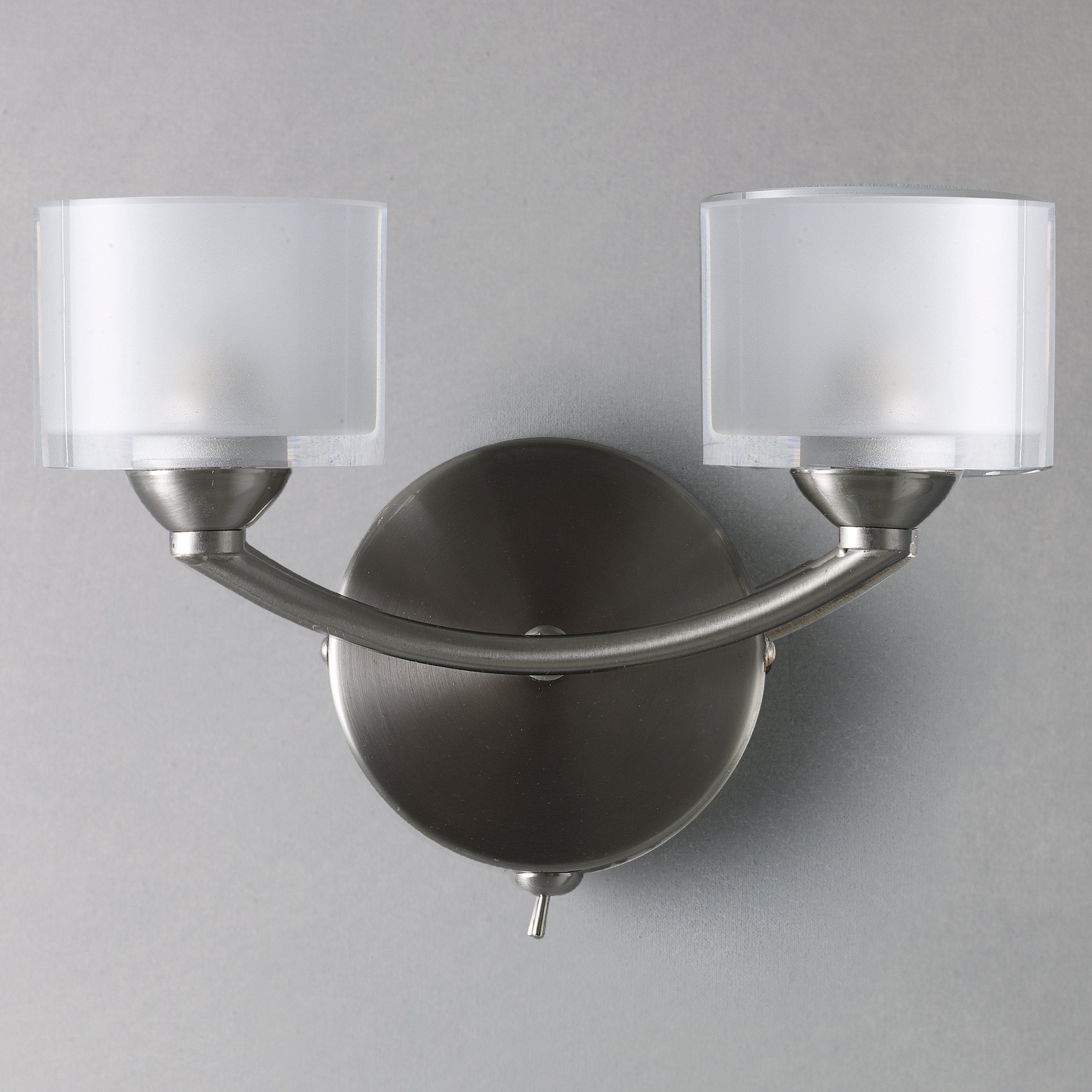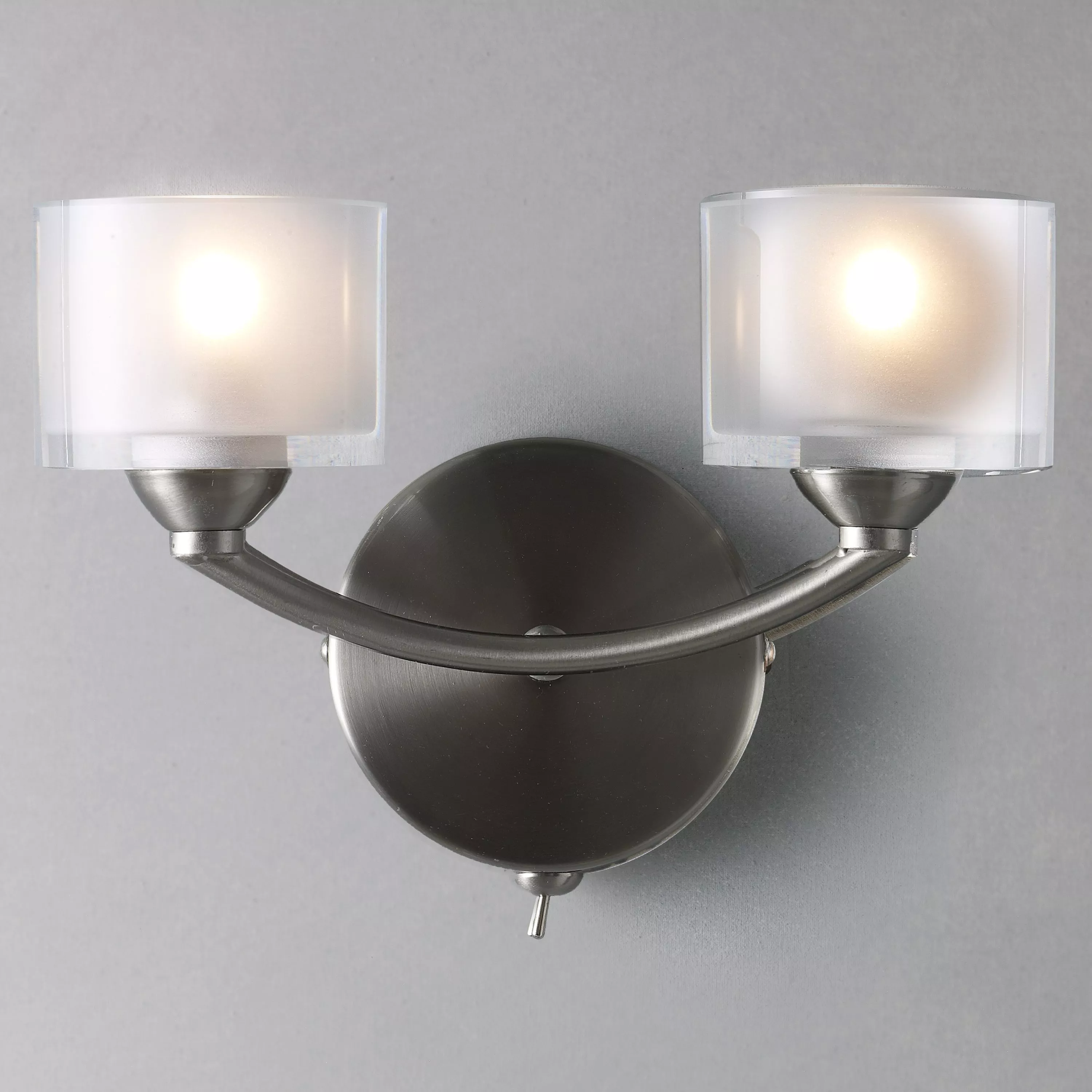 This double arm wall light combines a smart chrome fitting with two frosted glass shades. It will provide a warm glow of light up your wall and there's a toggle switch on the wall plate.