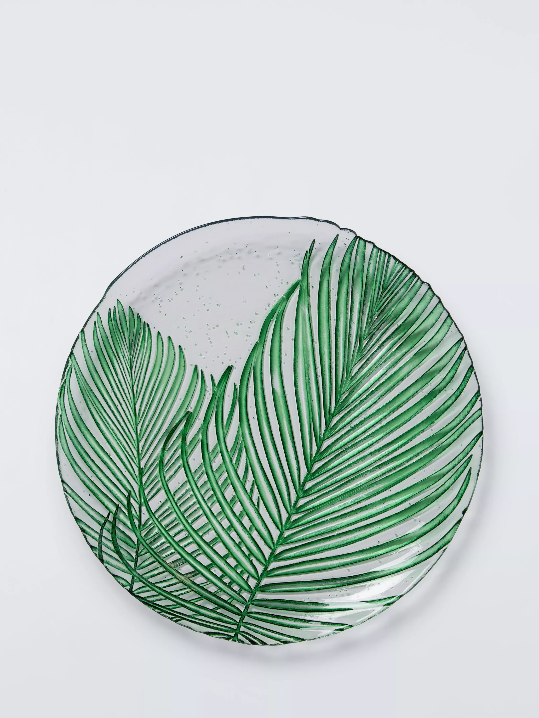 Glass serving platter in an organic shape. The palm print brings a tropical vibe to the table.