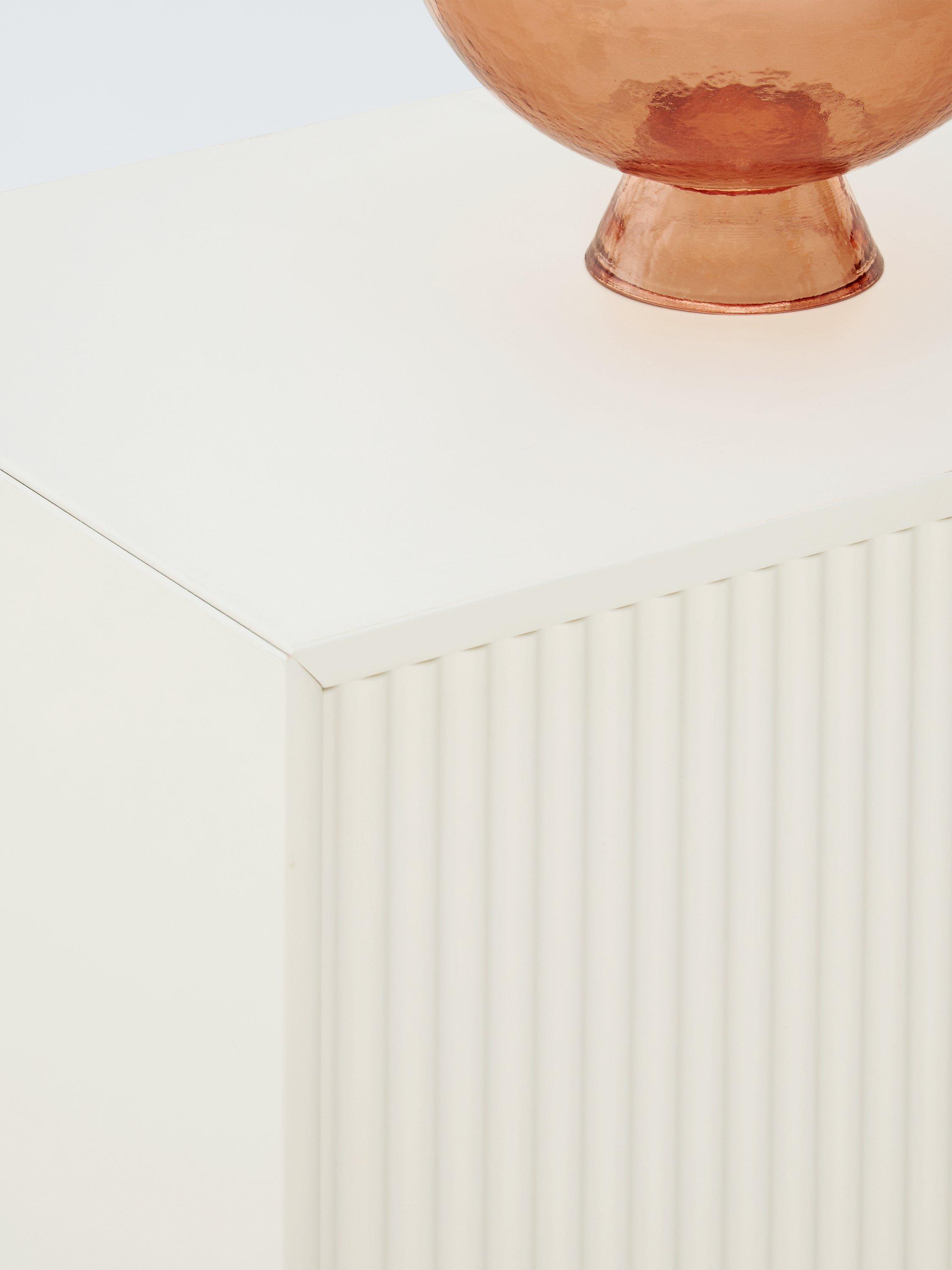 This fluted front cabinet will provide storage just about anywhere in you home. Two doors open to reveal two sleeves with a divider, giving a total of six sections for holding everything from tableware to towels.