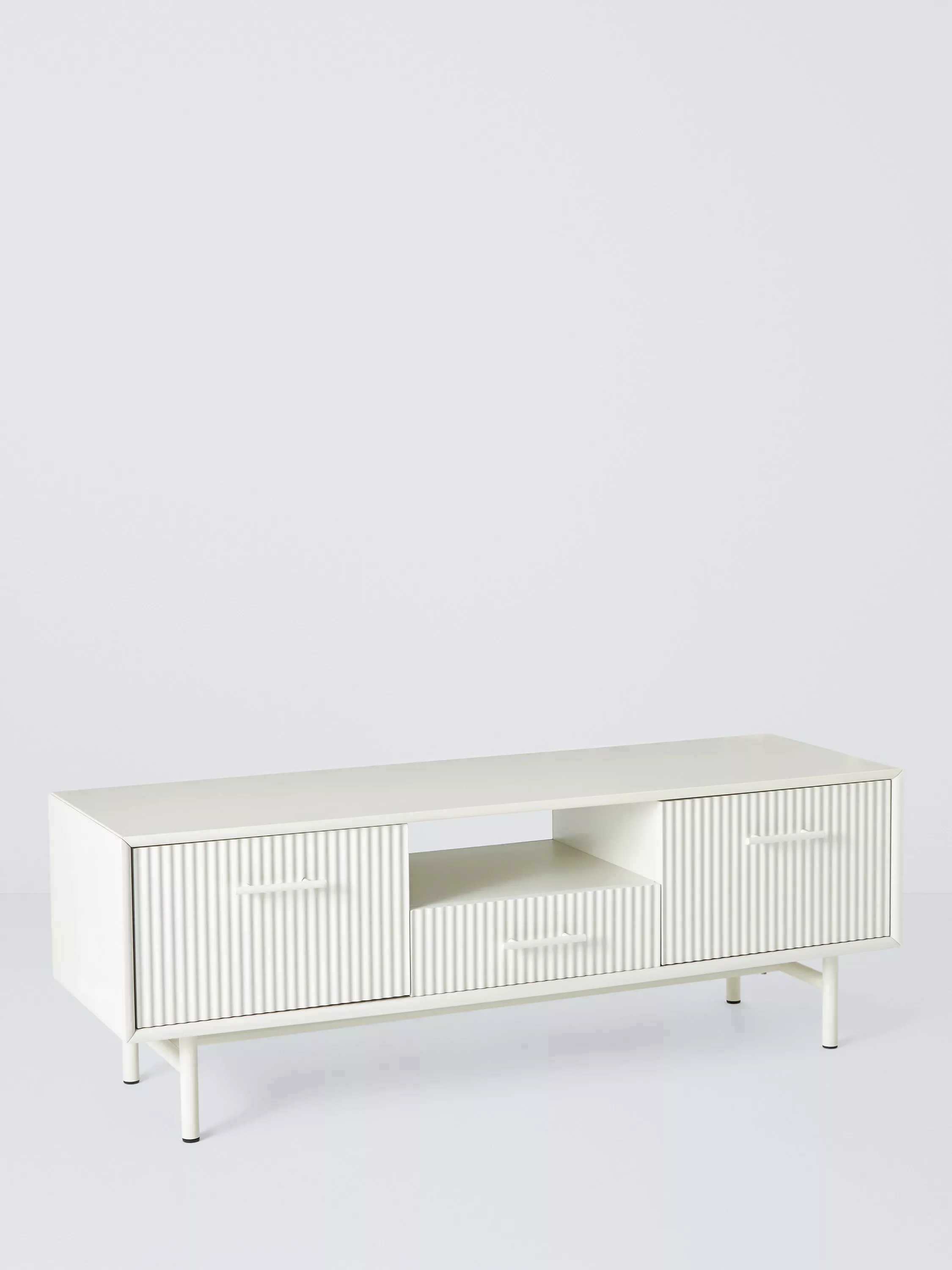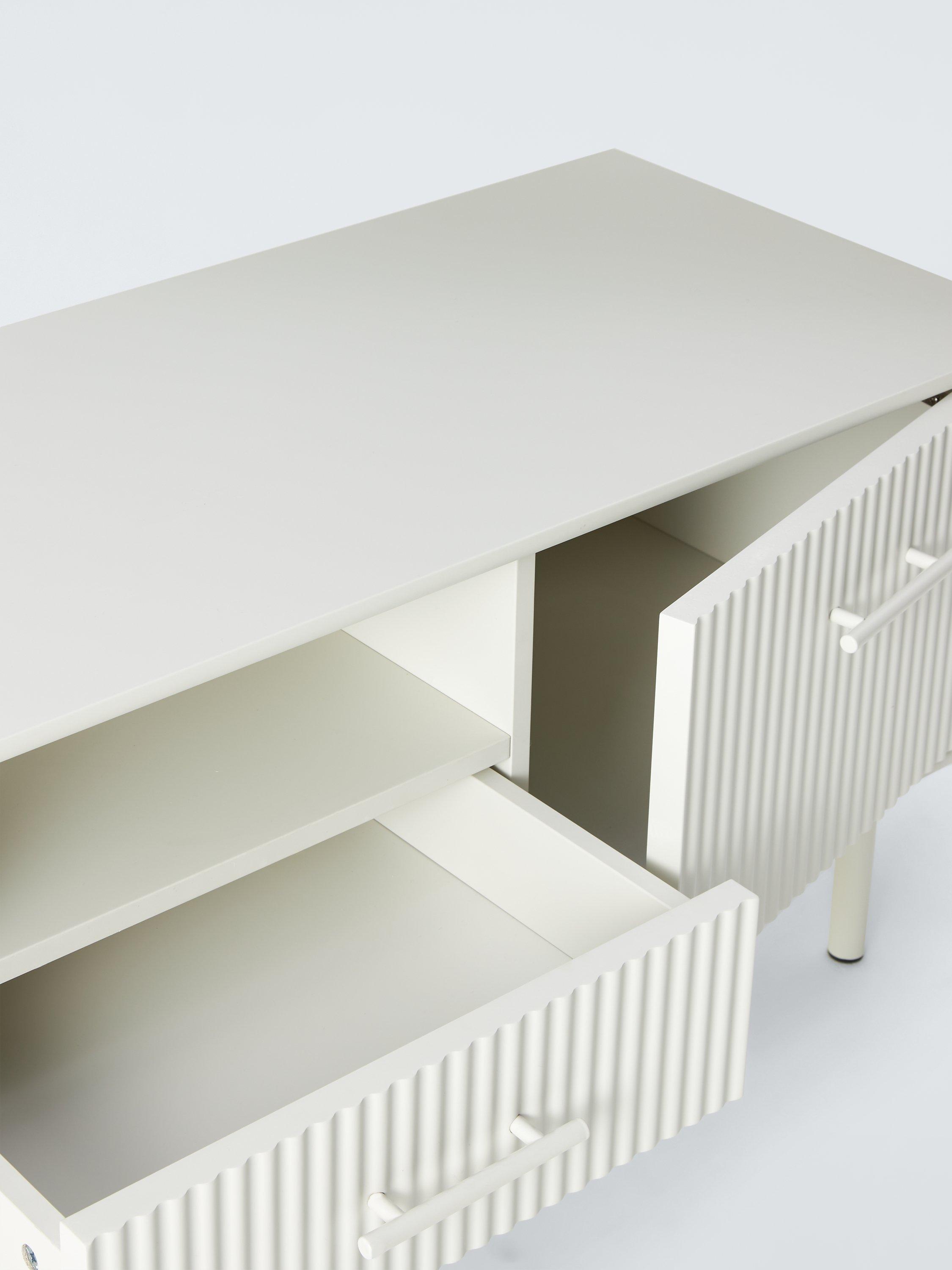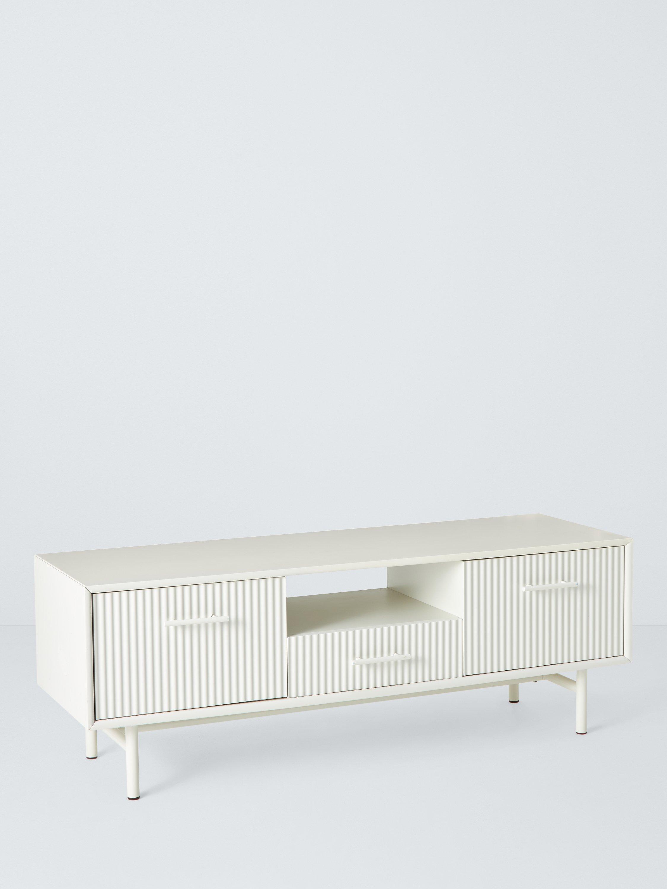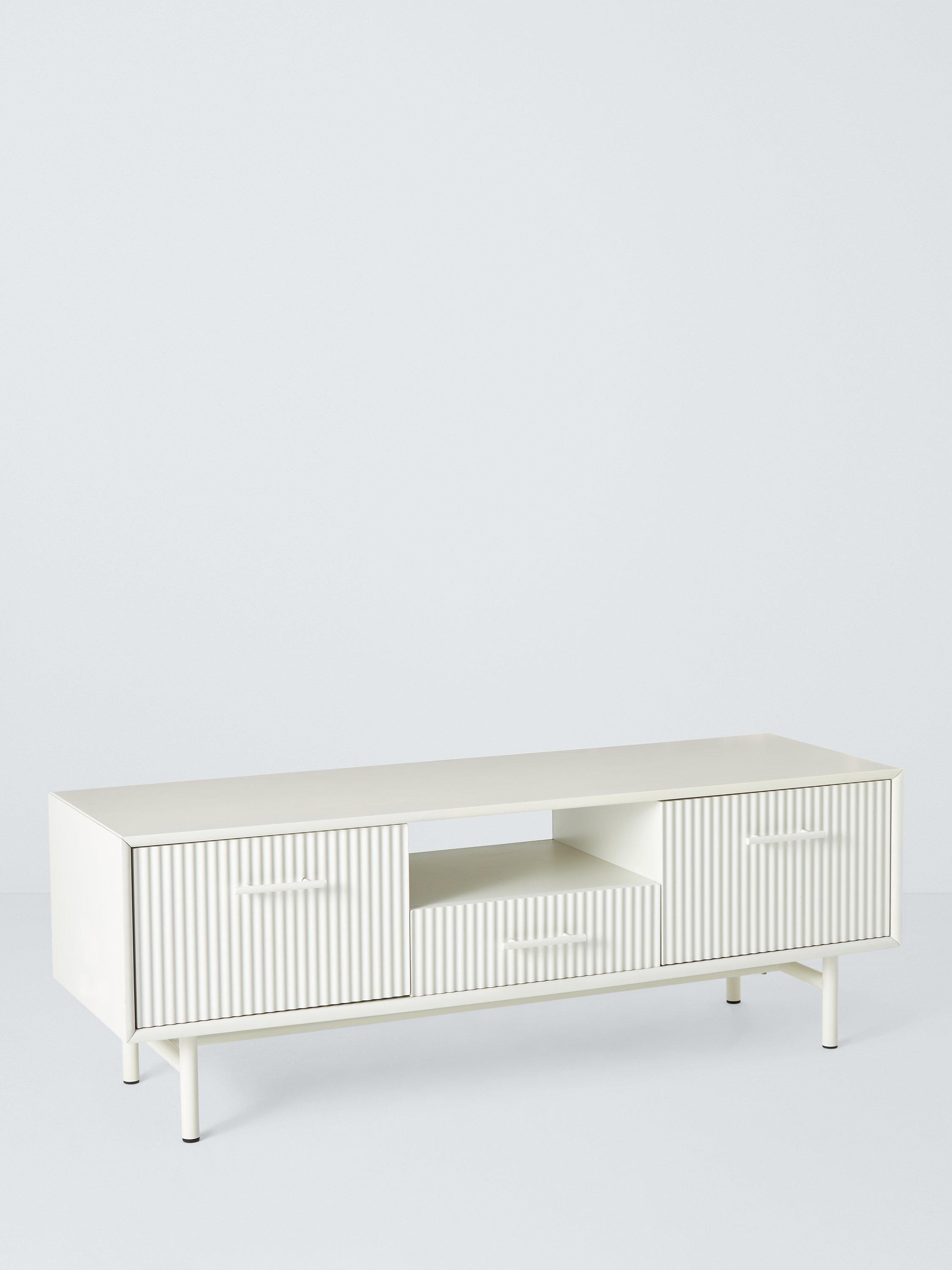This media unit has a central drawer for storage, with fluted cupboard fronts that conceal DVD players, gaming consoles and other media devices. It also has two large cable holes at the back.