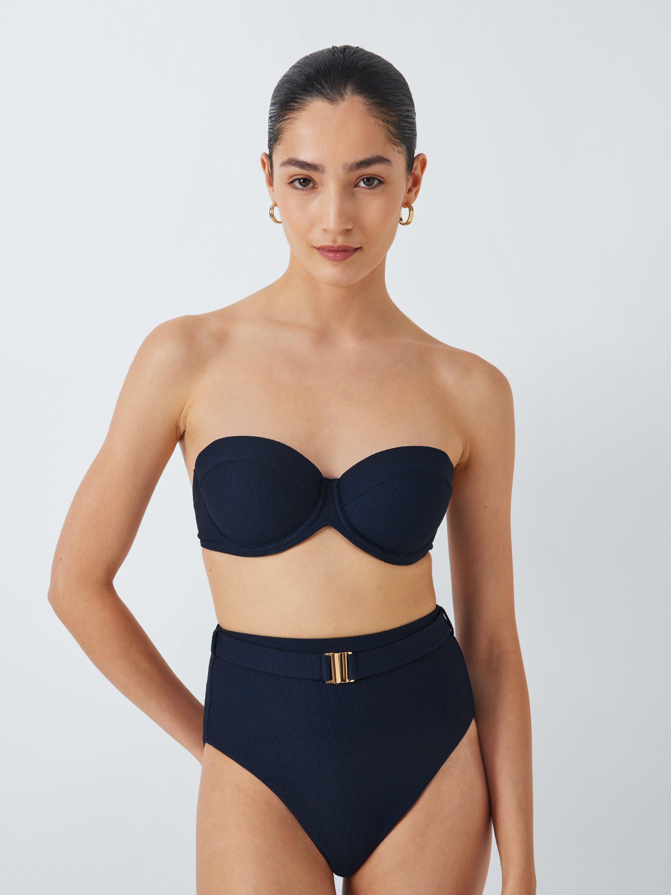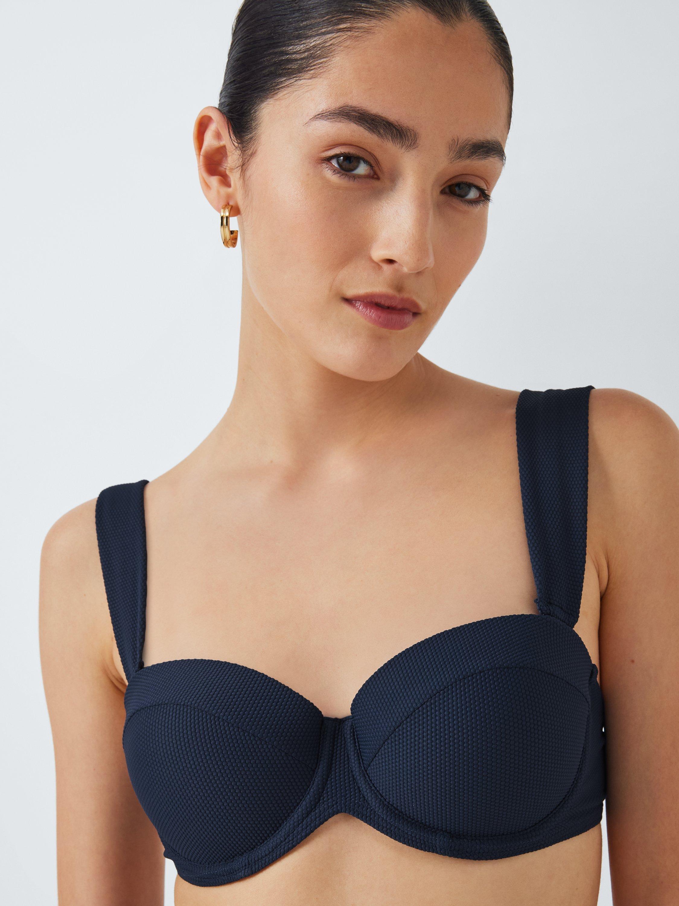 A fully lined bikini top in a balcony shape with moulded cups and wide straps for anchorage and support. The straps can be detached for a strapless look.