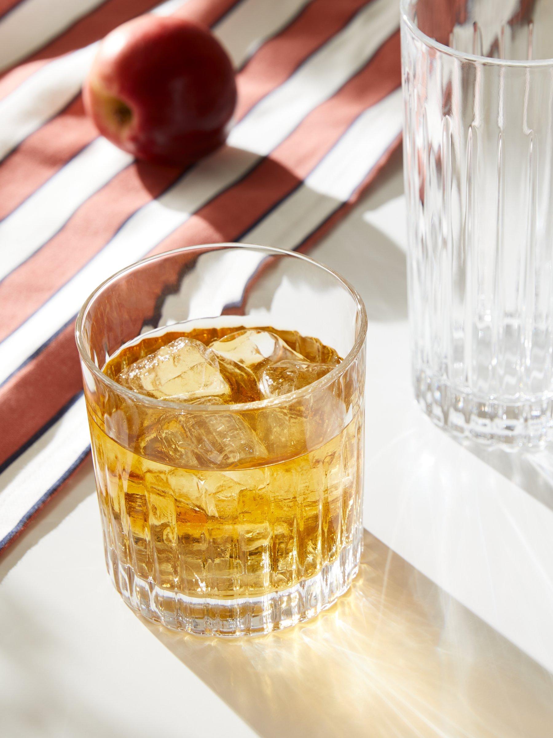 A pair of Paloma Timeless tumbler glasses for soft drinks, cocktails or whisky. The Paloma range features traditional cut glass-effect patterns made of pressed glass, such as our textured linear Timeless design.