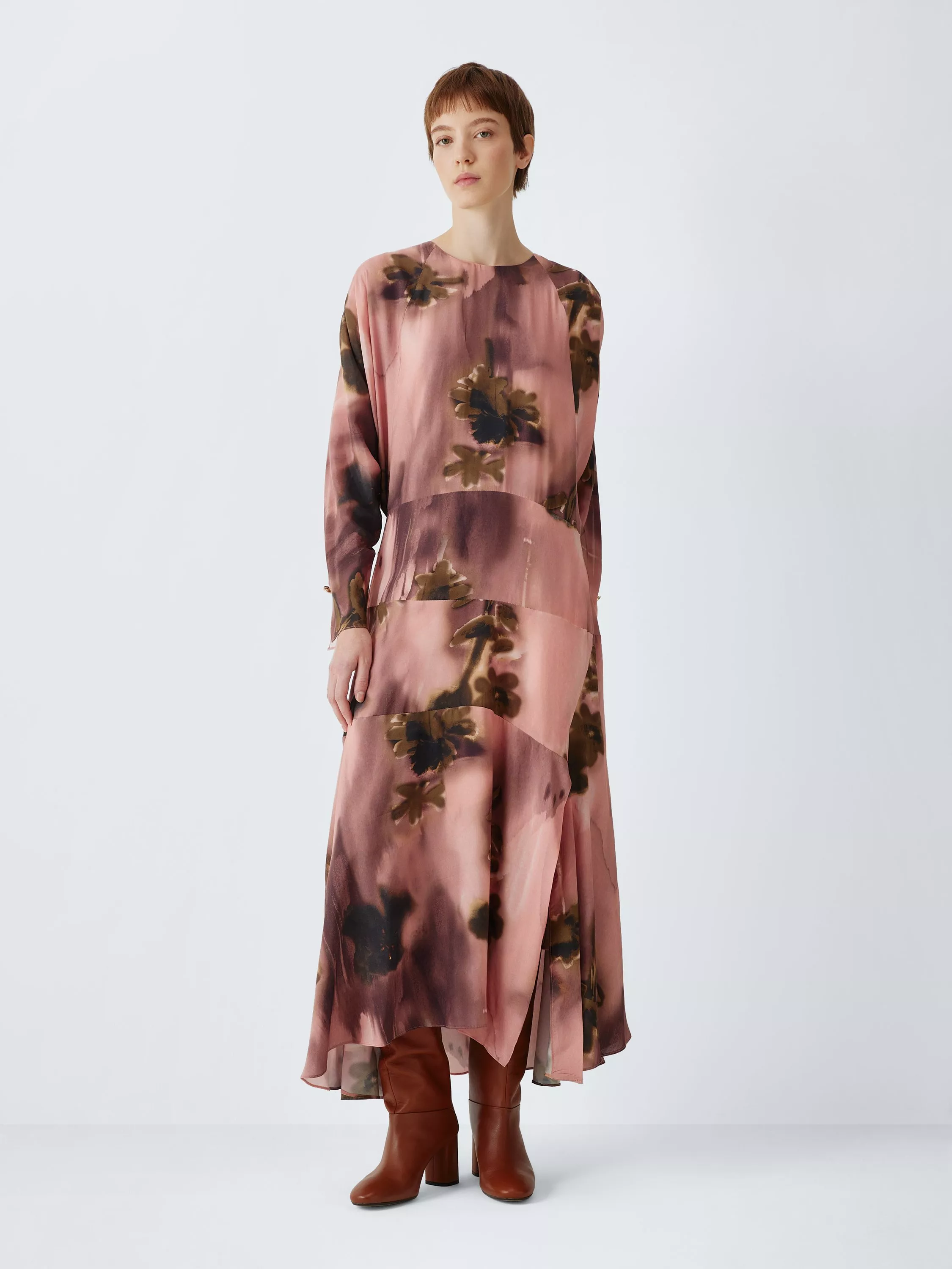 Panelled dress in an all-over modern floral print. Made from a fluid fabric, the dress falls to maxi length and has a zip fastener at the back.