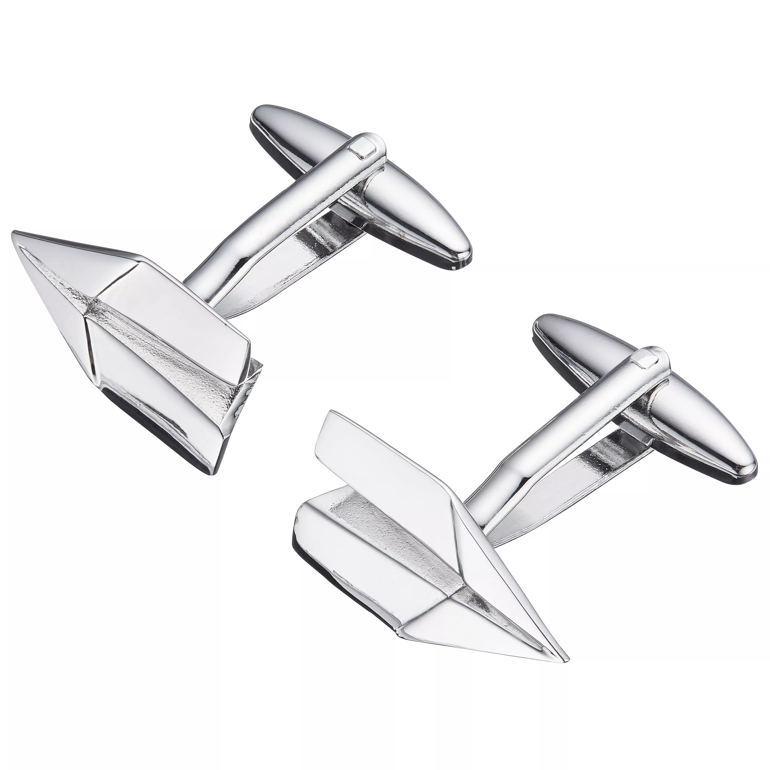 Crafted from brass, which is rhodium plated for a metallic sheen, these cufflinks feature a sleek hinged fastening and a bold paper aeroplane design, making them a perfect gift for a stylish person.